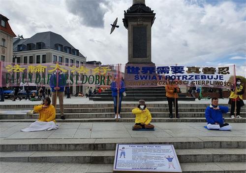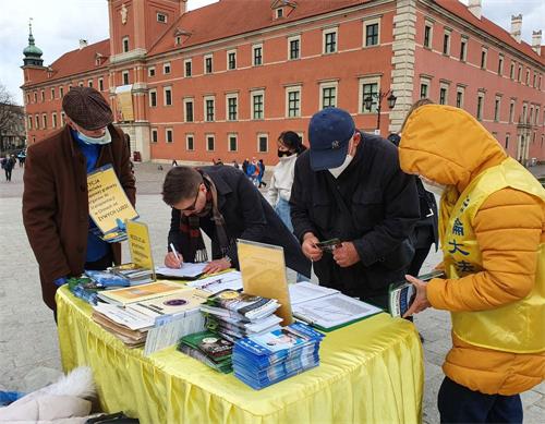 在中使馆门前静坐结束后,法轮功学员又来到华沙古城集体炼功,秉承四·二五和平理性的精神,向市民传递真相信息。了解真相的民众纷纷签名表达对法轮功修炼者的声援,呼吁结束中共对法轮功的迫害。