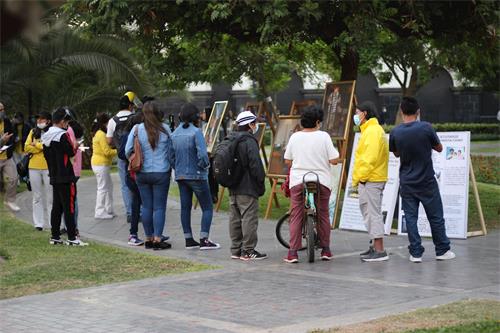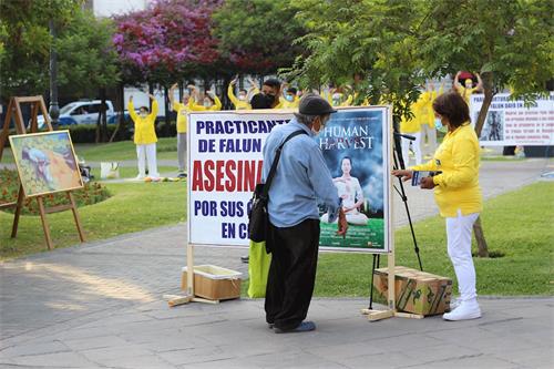 人们看到学员们在伴随着祥和的音乐下,展示舒缓的法轮功功法,纷纷询问在哪里可以学功。学员介绍在传单上有利马和其它城市共十三个炼功点都可以进行免费教功。