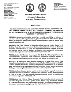 鉴于,威斯特摩兰县(Westmoreland County)居民在决定到中国进行器官移植旅游之前,应该被充分告知中国的器官来源,而威斯特摩兰县委员会应协助提升这方面的认知;
