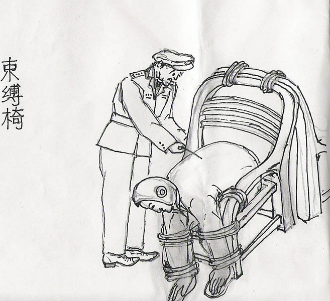 韩姓大队长指使犯人把谢德文手、脚、四肢铐在四个床头,床上五块木板,后来她说:“撤掉两块板,脖子一块,脚一块,臀部一块。每天除了三次灌食外,都铐在床上。”