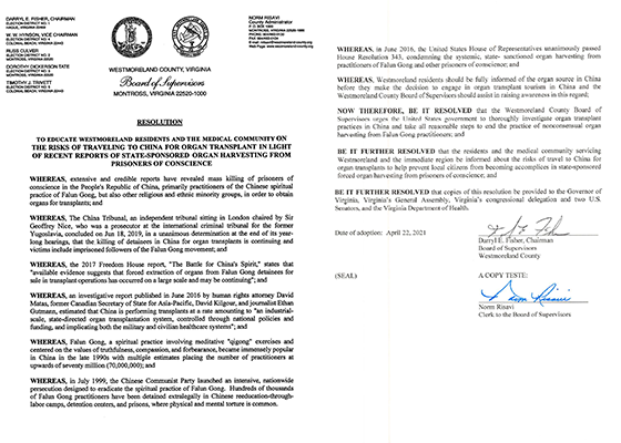 四月二十二日,弗吉尼亚州威斯特摩兰县通过一项决议案,呼吁“美国政府彻底调查中国器官移植业,以制止(中共)活摘法轮功学员器官”。