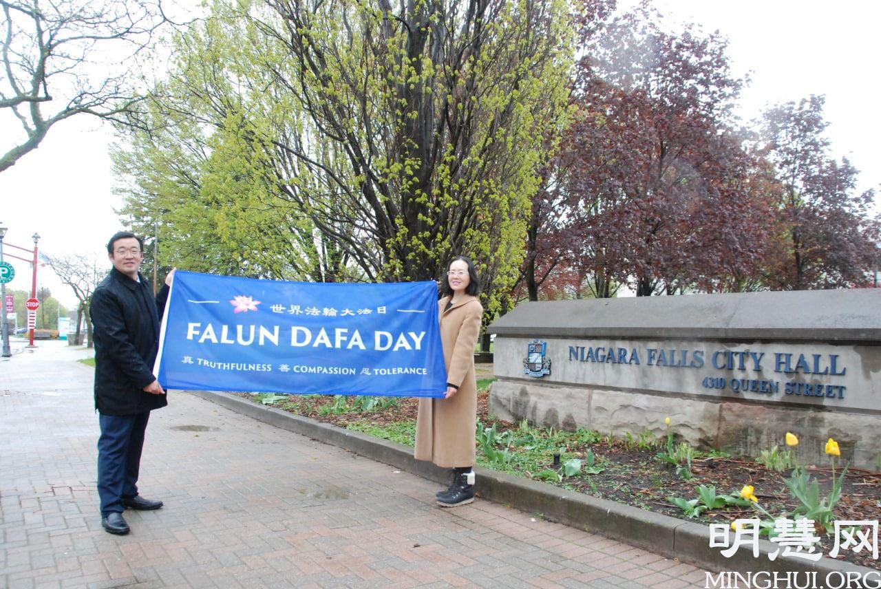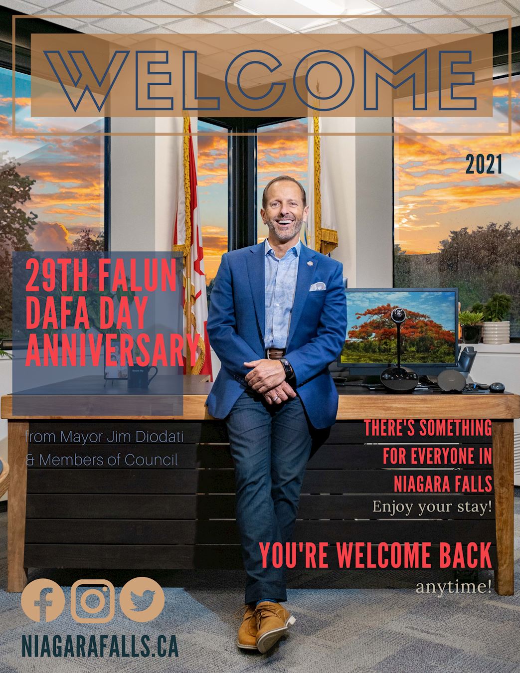 尼亚加拉瀑布市议会在今年的四月二十日,决定通过向法轮大法日的升旗祝贺。尼亚加拉瀑布市长吉姆·迪奥达蒂(Jim Diodati)亲自发海报祝贺,他在网上发海报欢迎大家都来尼亚加拉瀑布。