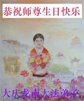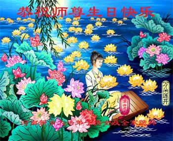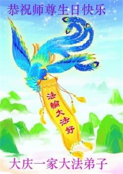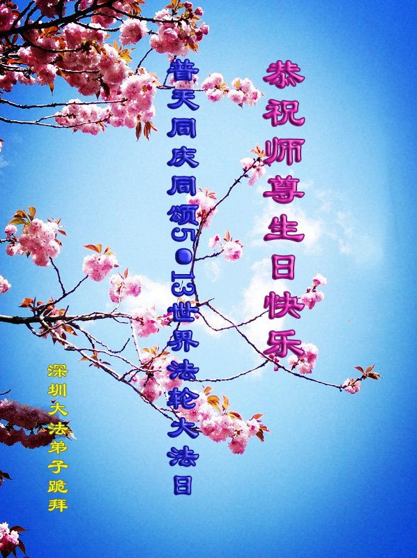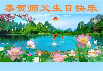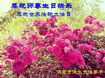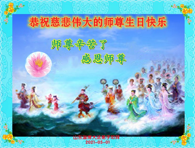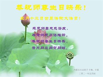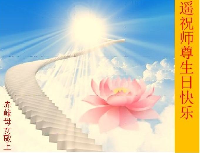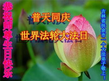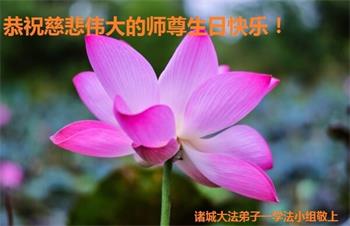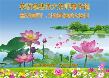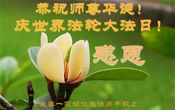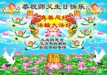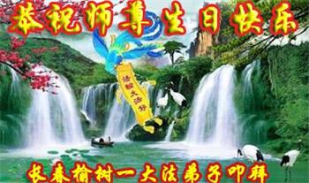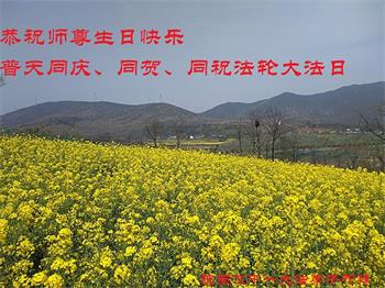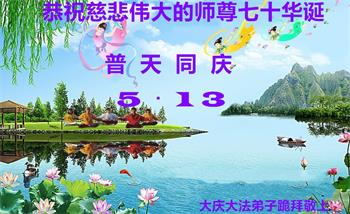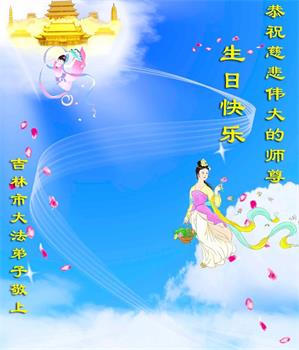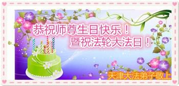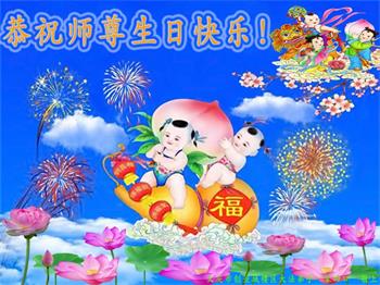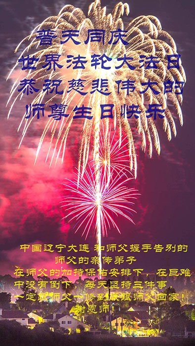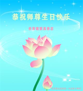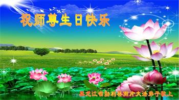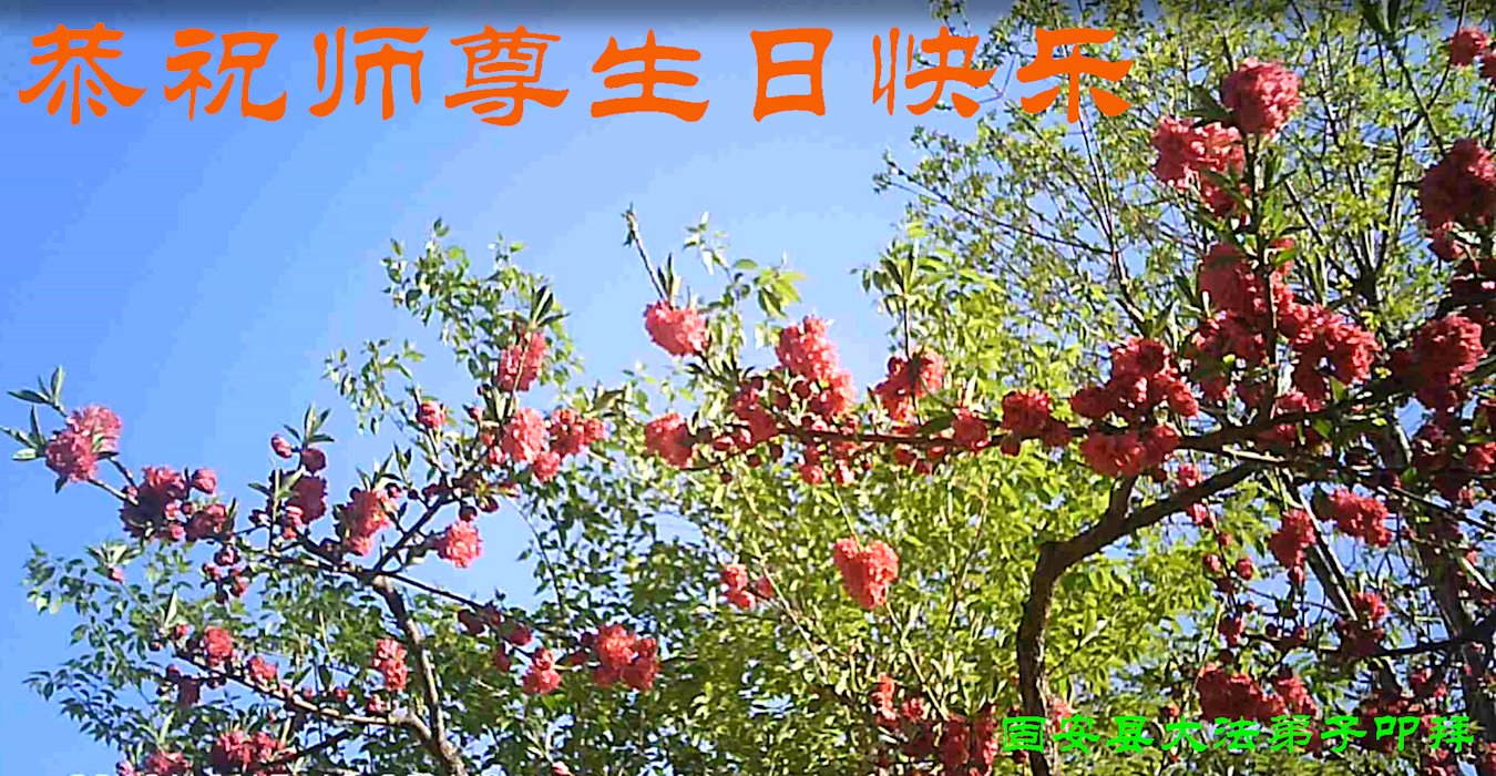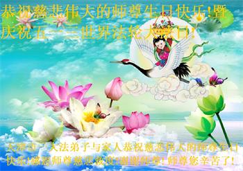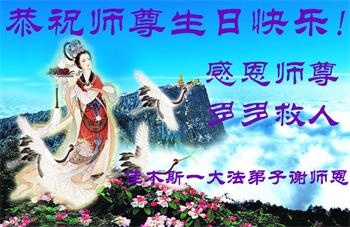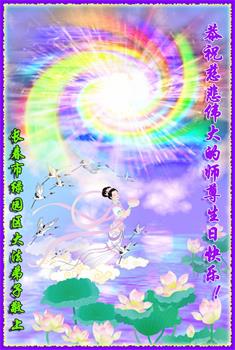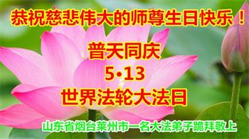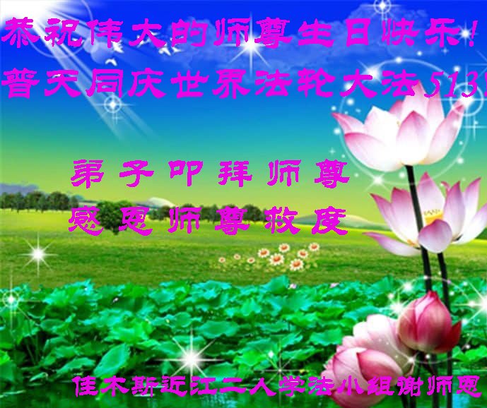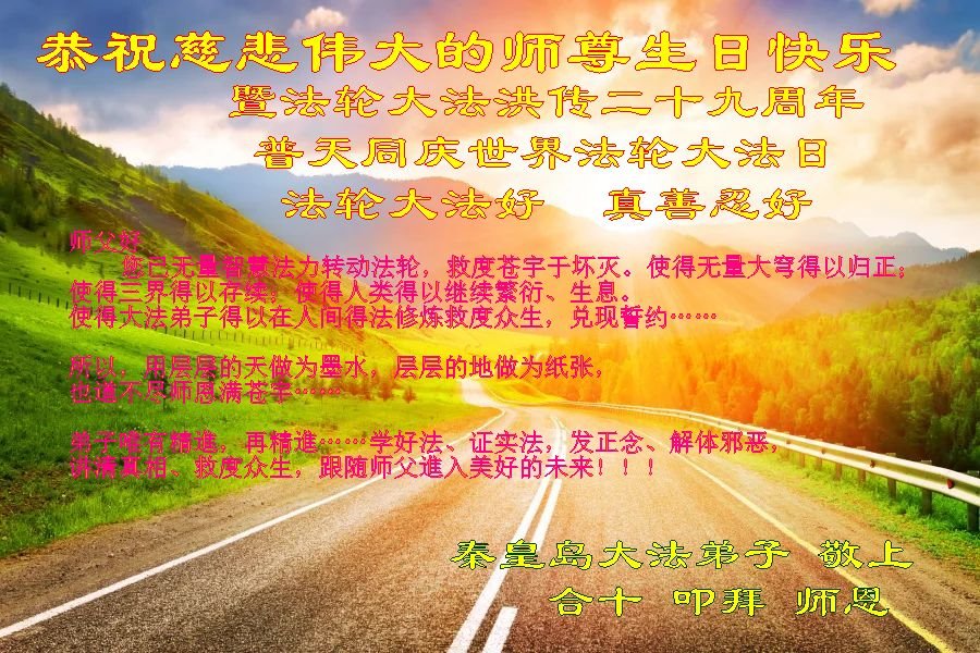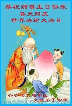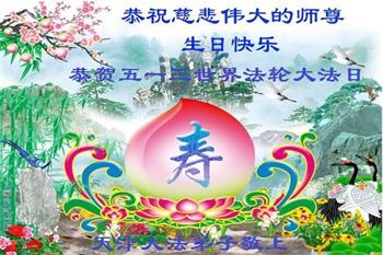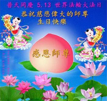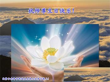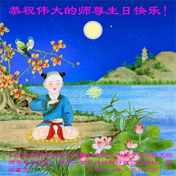 师尊您好!弟子恭祝师尊华诞!恭贺世界法轮大法日!在这普天同庆的日子里,弟子同歌同颂师尊之无量慈悲:感恩师尊把大法传给弟子,指引我们走上返本归真的大道;感恩师尊教导弟子做一个为他的生命,危难中不忘救度众生。弟子一定不忘使命,学好法,多救人,带领众生圆满随师还!弟子叩谢师恩!