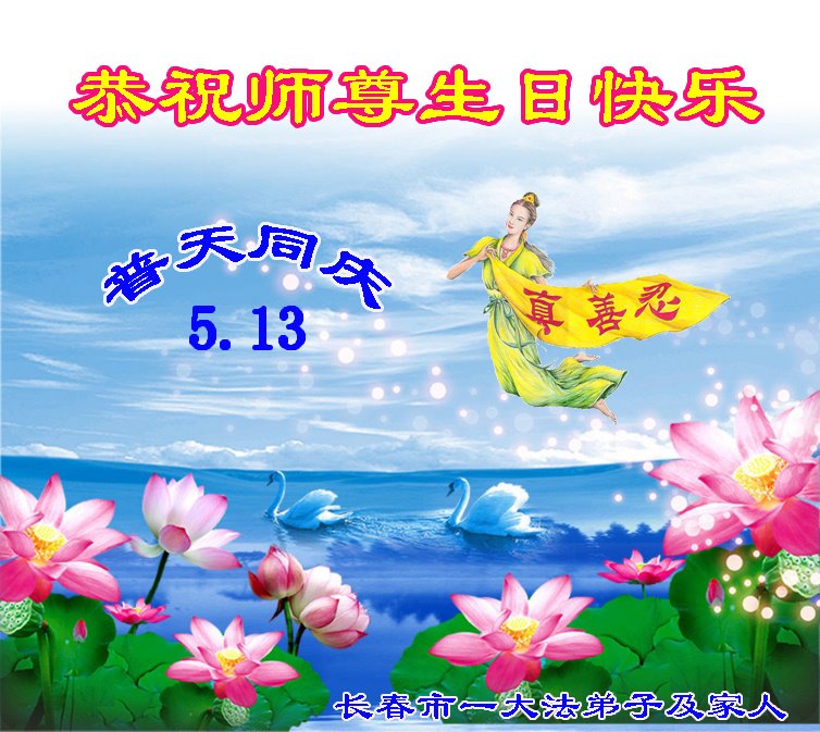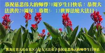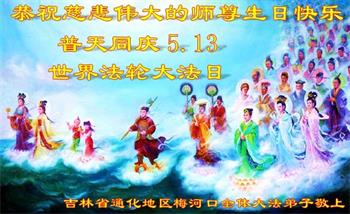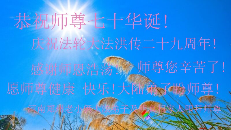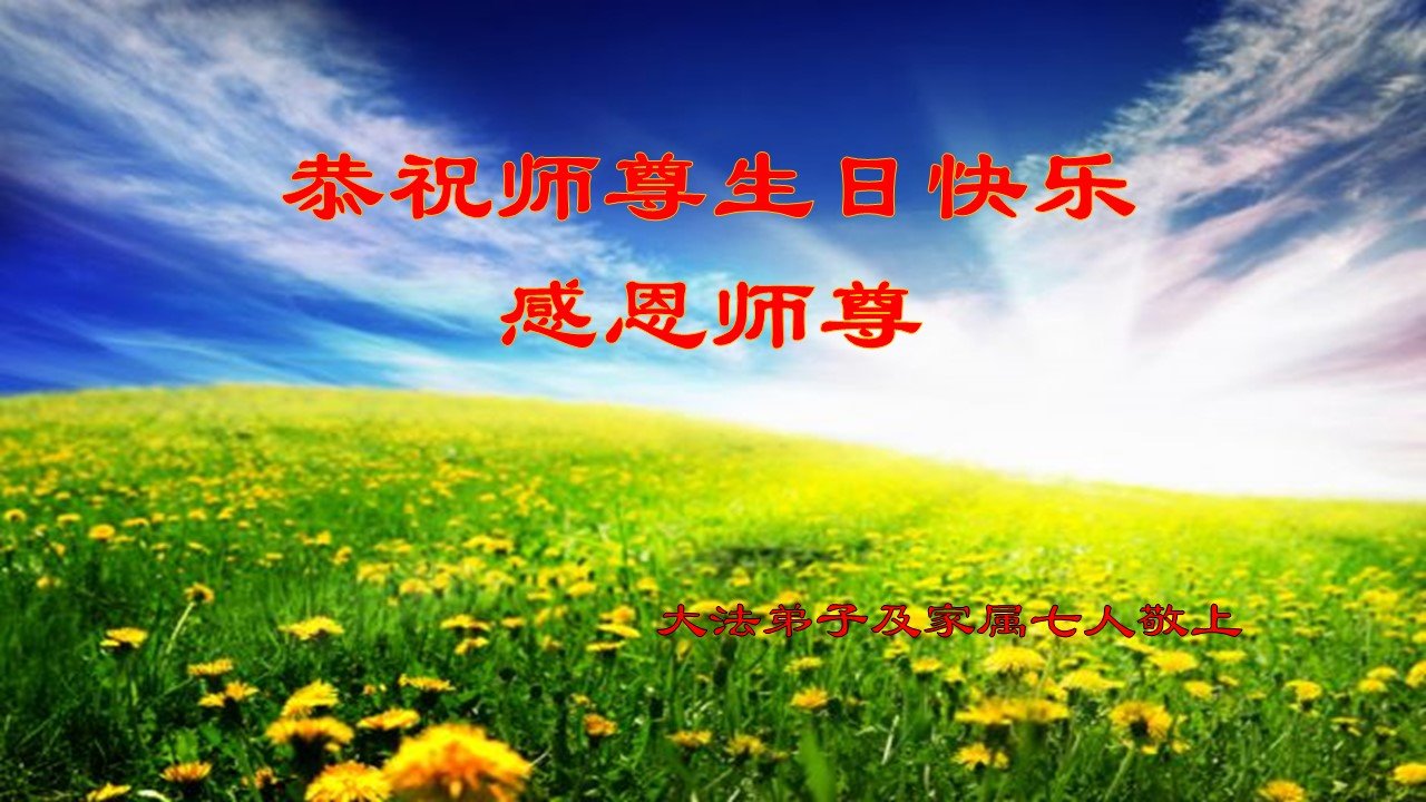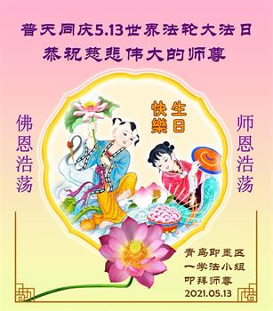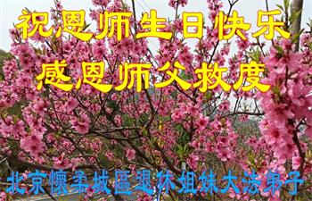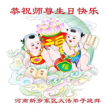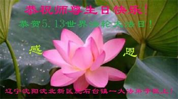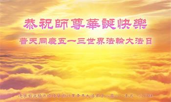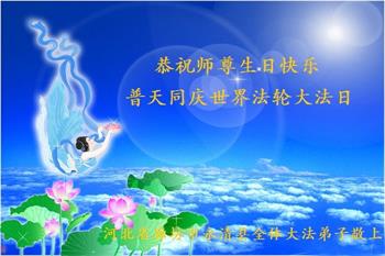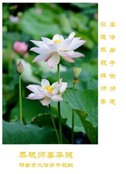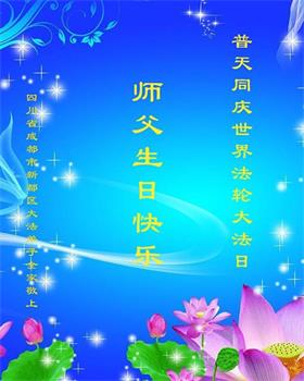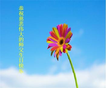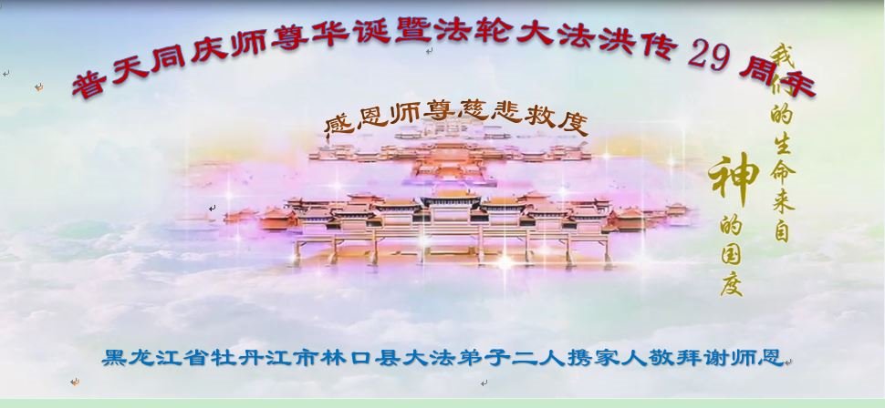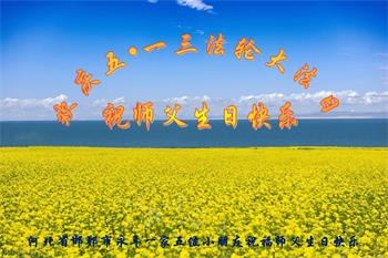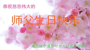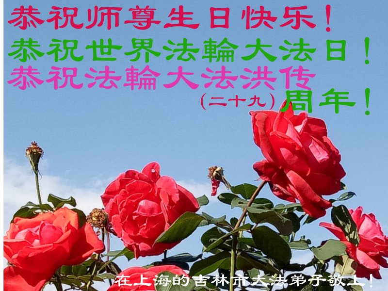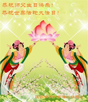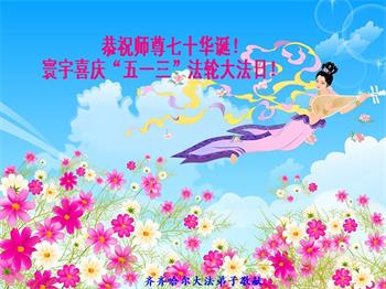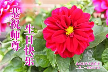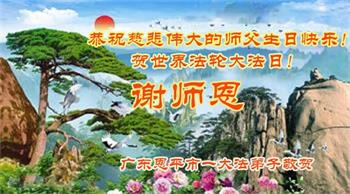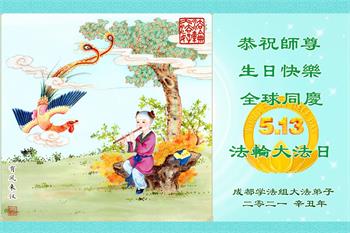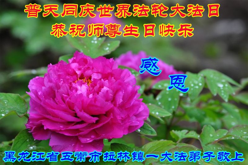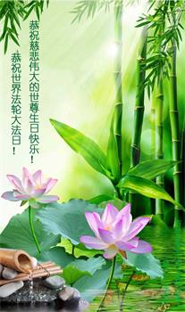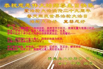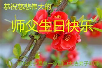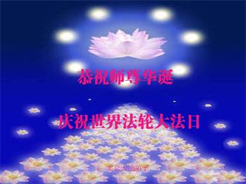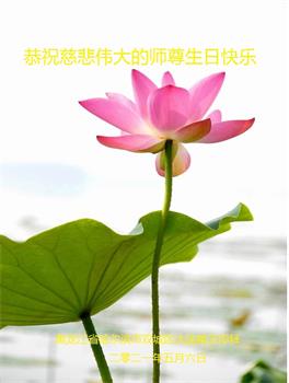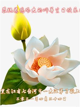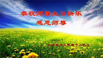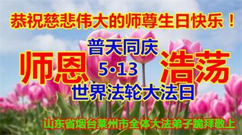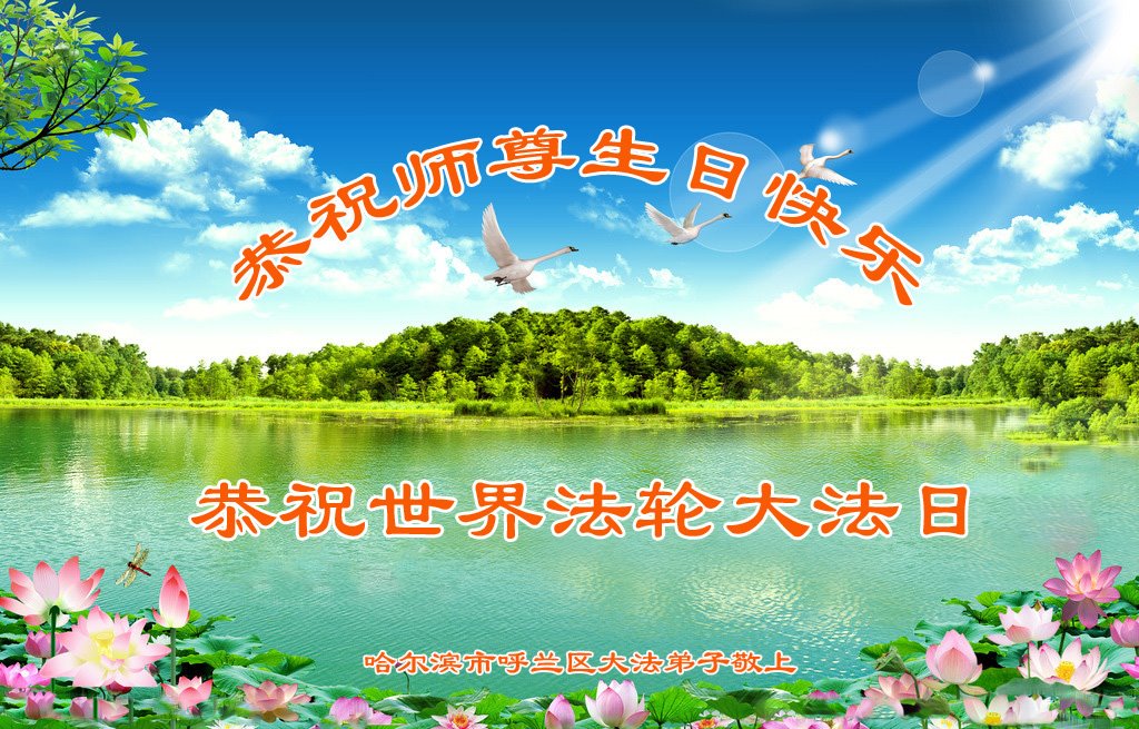师尊您好!弟子恭祝师尊华诞!恭贺世界法轮大法日!在这普天同庆的日子里,弟子同歌同颂师尊之无量慈悲:感恩师尊把大法传给弟子,指引我们走上返本归真的大道;感恩师尊教导弟子做一个为他的生命,危难中不忘救度众生。弟子一定不忘使命,学好法,多救人,带领众生圆满随师还!弟子叩谢师恩!