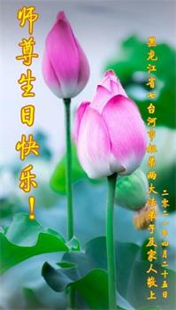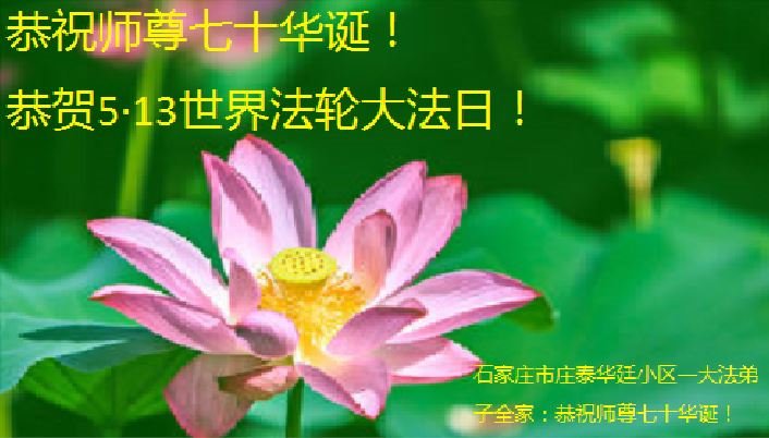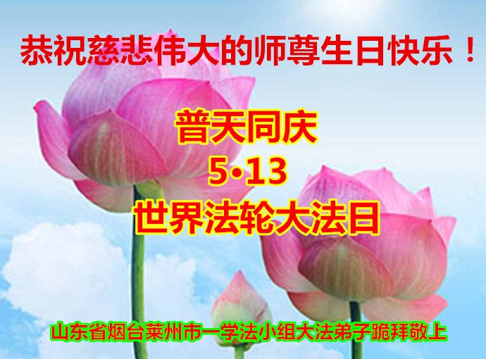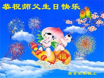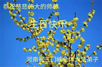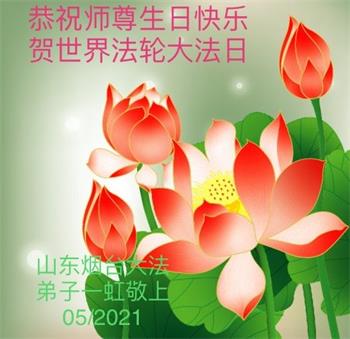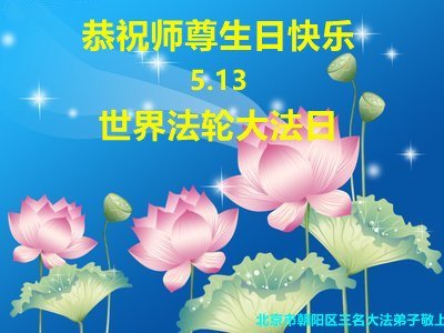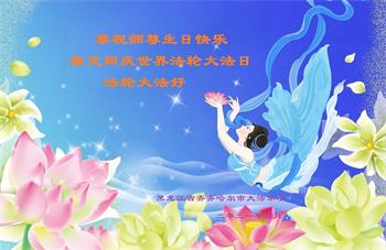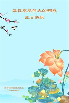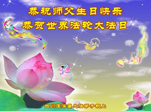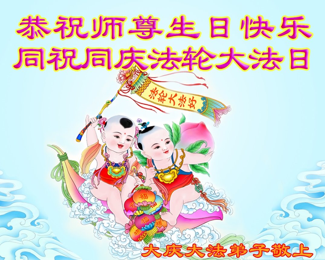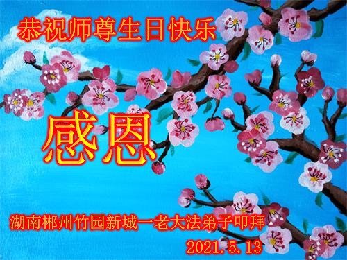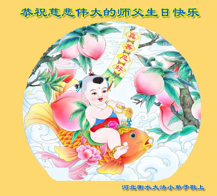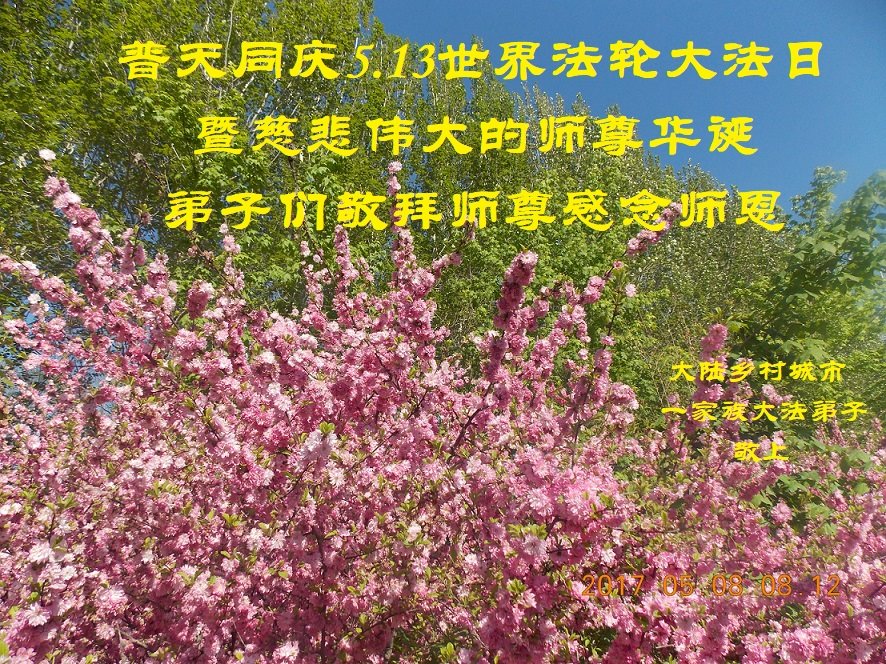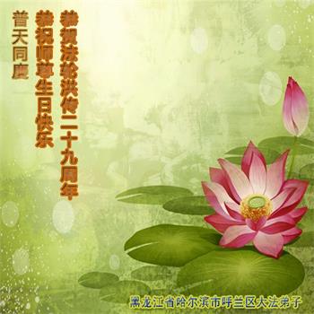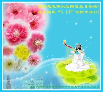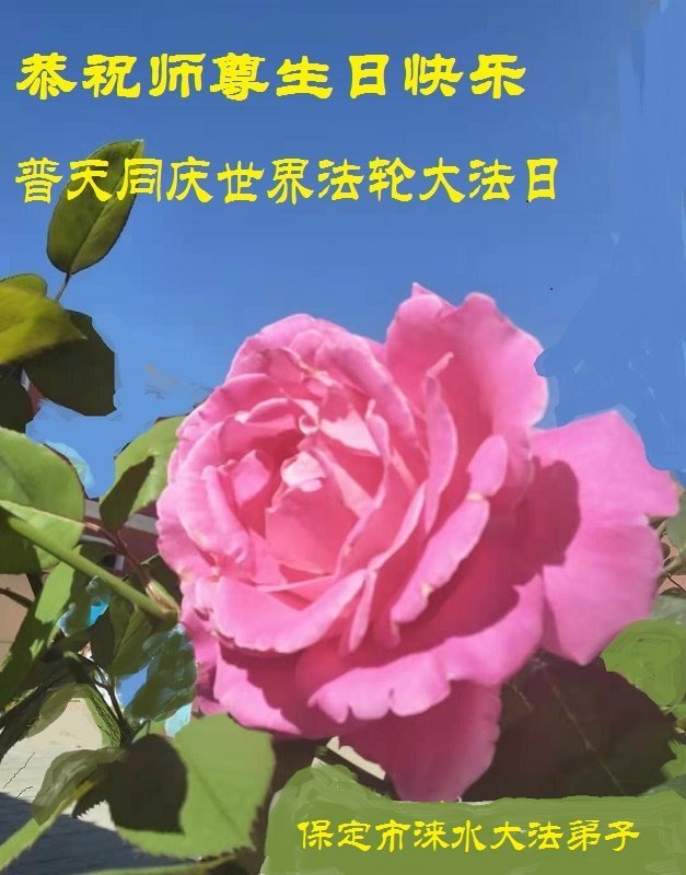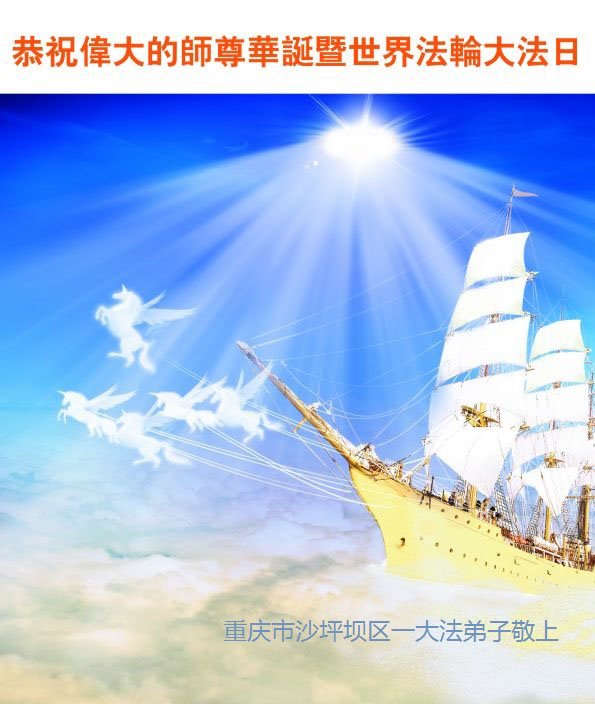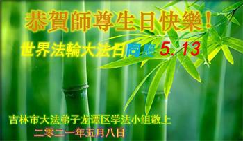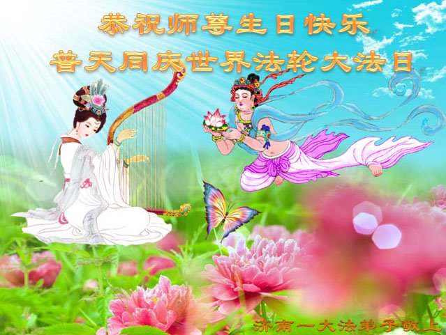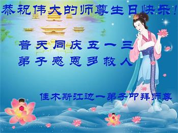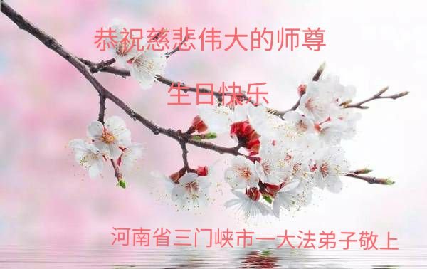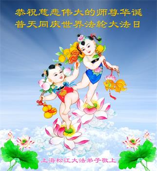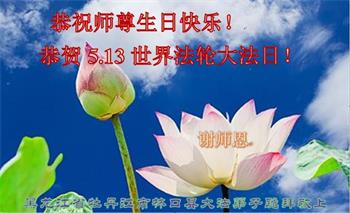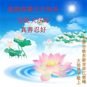 师尊您好!弟子恭祝师尊华诞!恭贺世界法轮大法日!在这普天同庆的日子里,弟子同歌同颂师尊之无量慈悲:感恩师尊把大法传给弟子,指引我们走上返本归真的大道;感恩师尊教导弟子做一个为他的生命,危难中不忘救度众生。弟子一定不忘使命,学好法,多救人,带领众生圆满随师还!弟子叩谢师恩!
