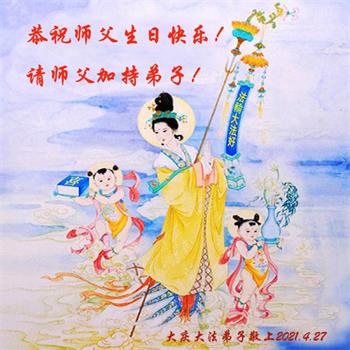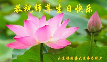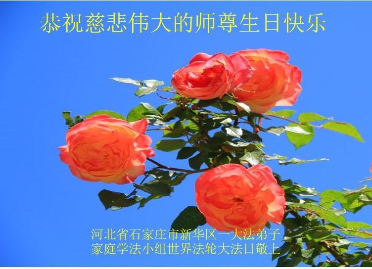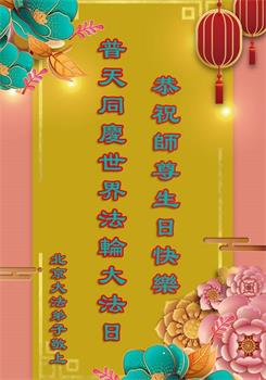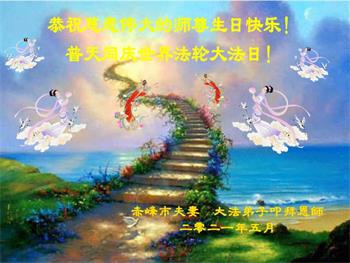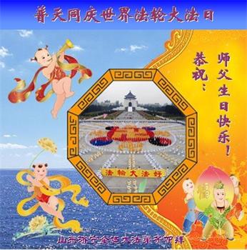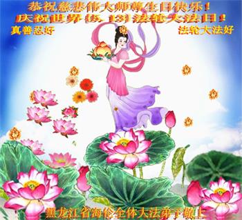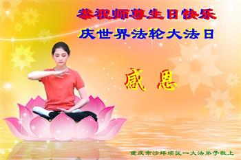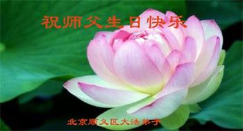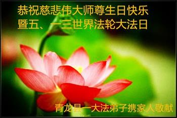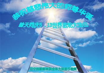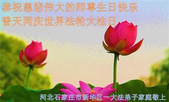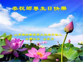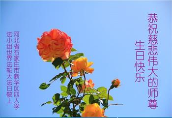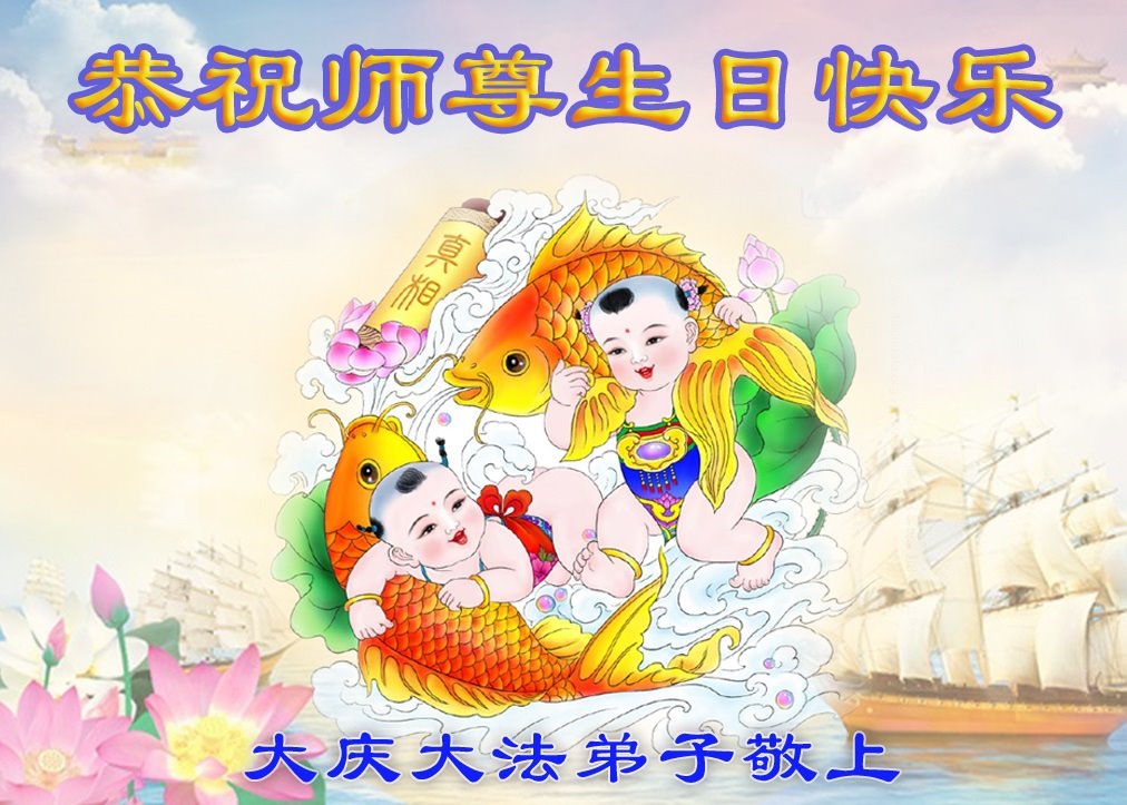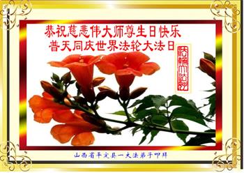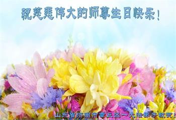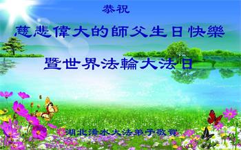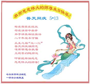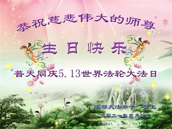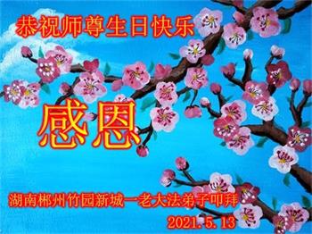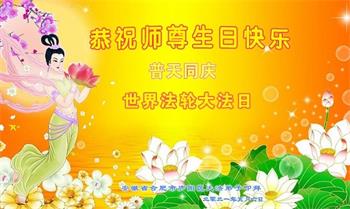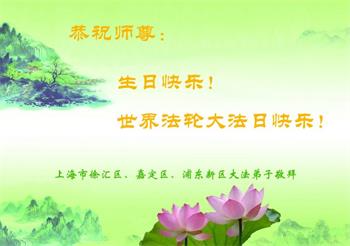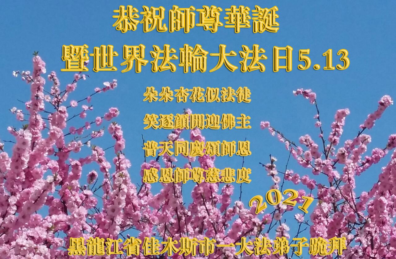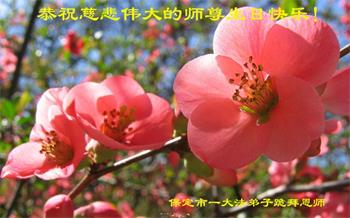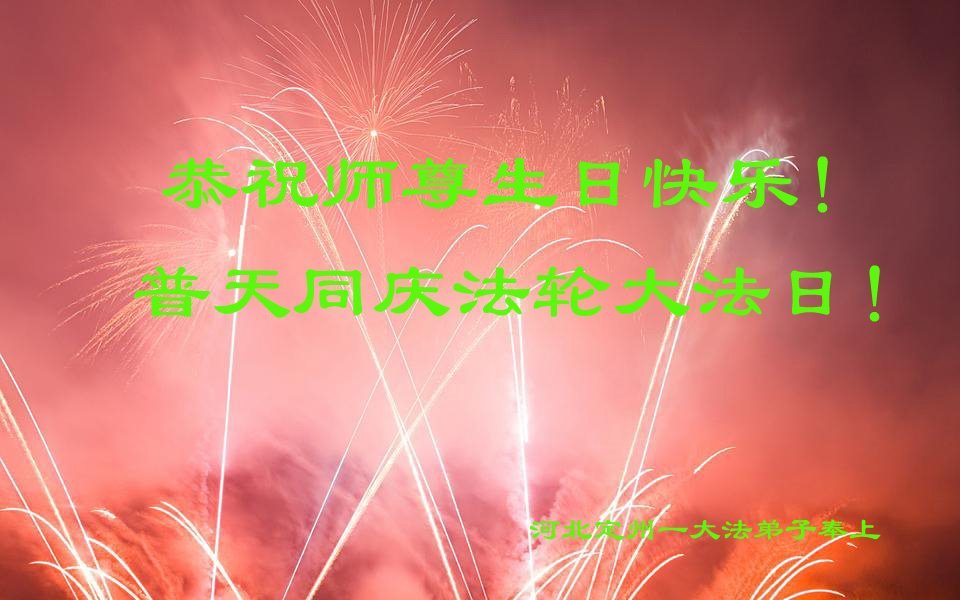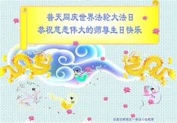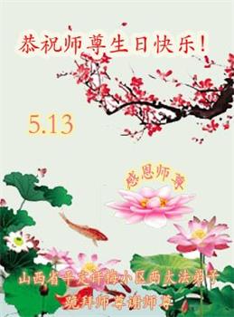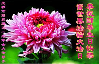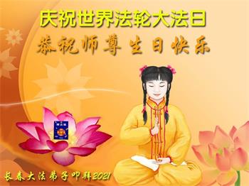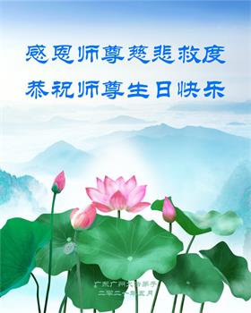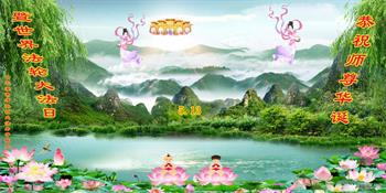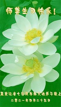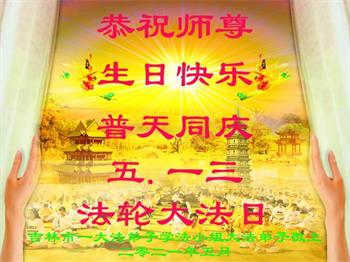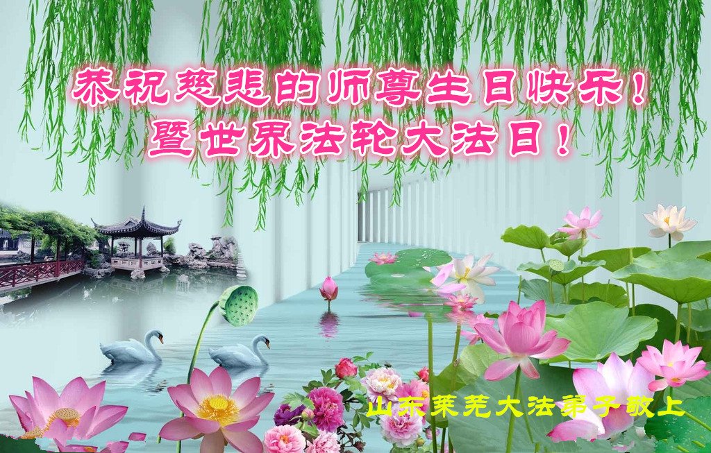 师尊您好!弟子恭祝师尊华诞!恭贺世界法轮大法日!在这普天同庆的日子里,弟子同歌同颂师尊之无量慈悲:感恩师尊把大法传给弟子,指引我们走上返本归真的大道;感恩师尊教导弟子做一个为他的生命,危难中不忘救度众生。弟子一定不忘使命,学好法,多救人,带领众生圆满随师还!弟子叩谢师恩!