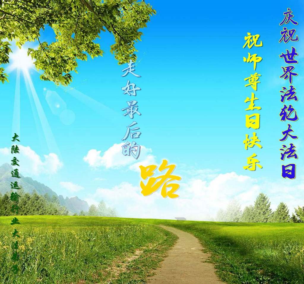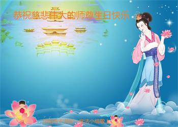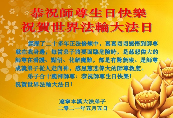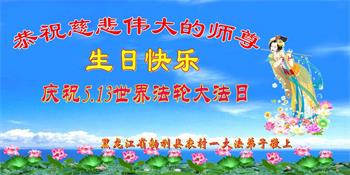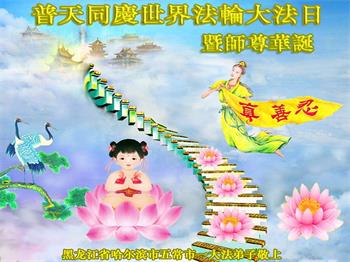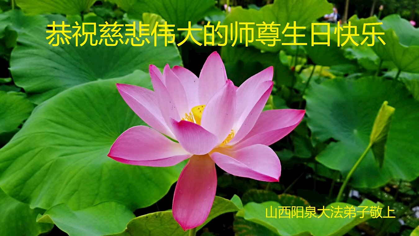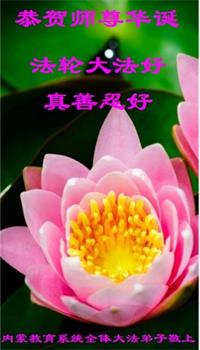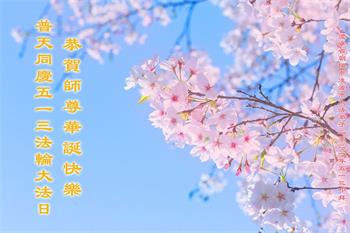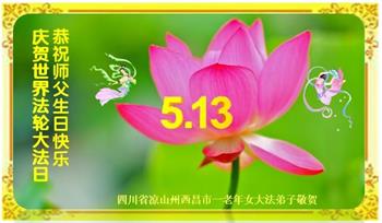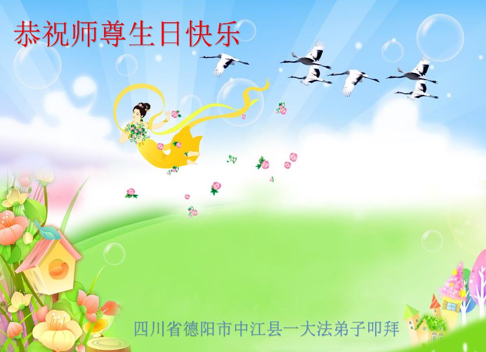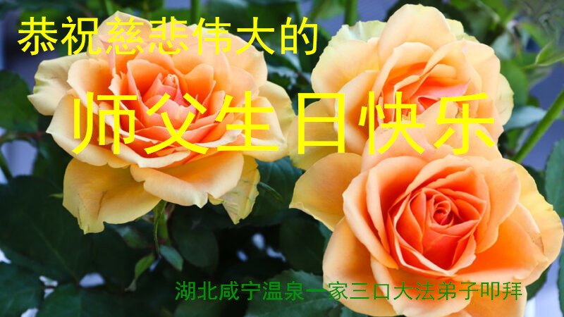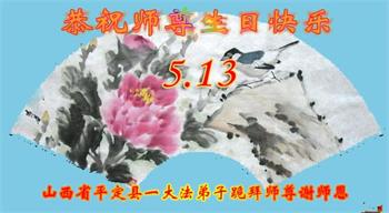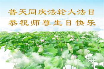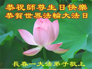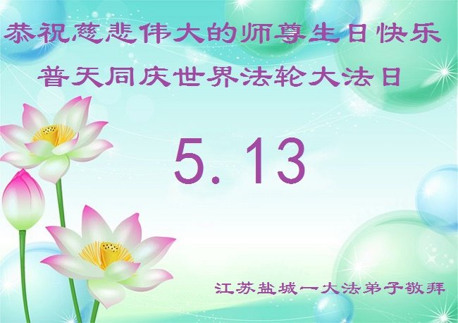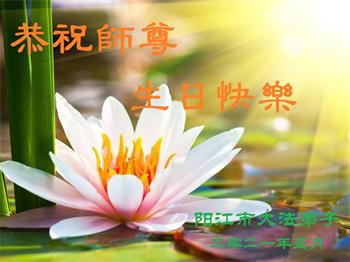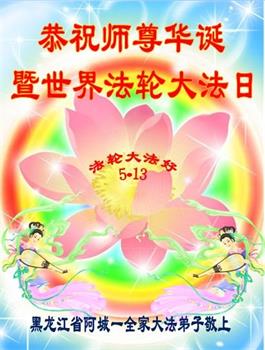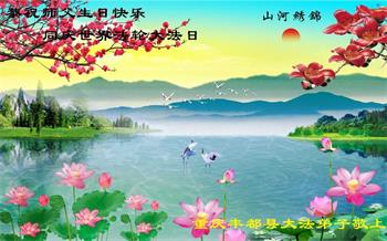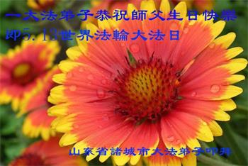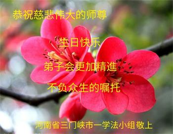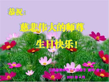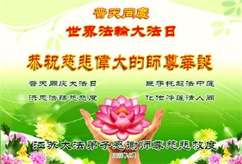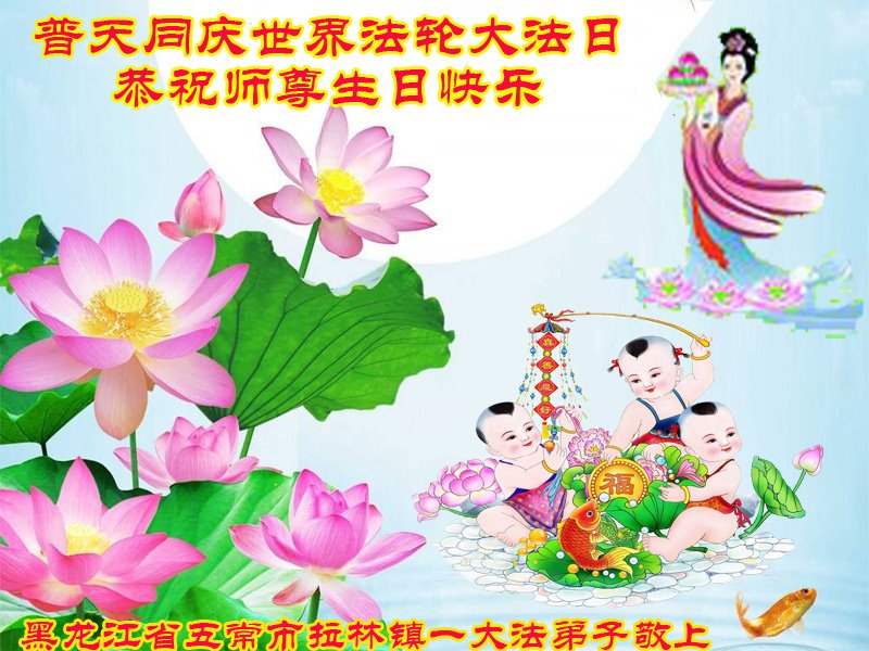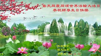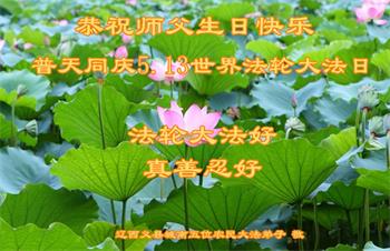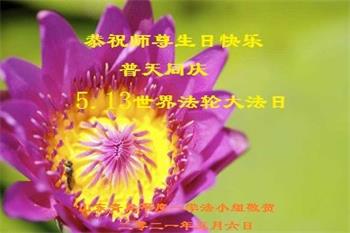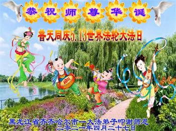 师尊您好!弟子恭祝师尊华诞!恭贺世界法轮大法日!在这普天同庆的日子里,弟子同歌同颂师尊之无量慈悲:感恩师尊把大法传给弟子,指引我们走上返本归真的大道;感恩师尊教导弟子做一个为他的生命,危难中不忘救度众生。弟子一定不忘使命,学好法,多救人,带领众生圆满随师还!弟子叩谢师恩!