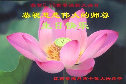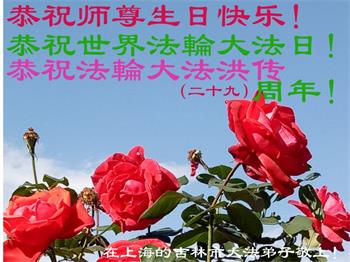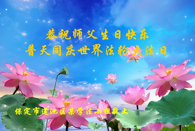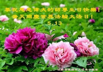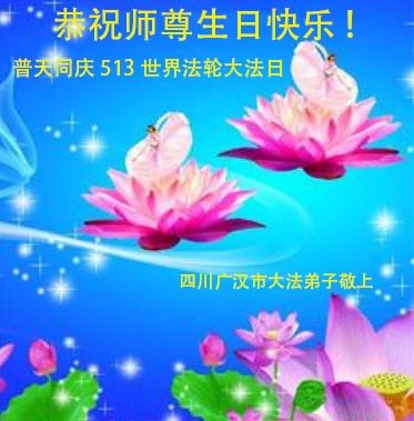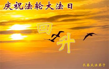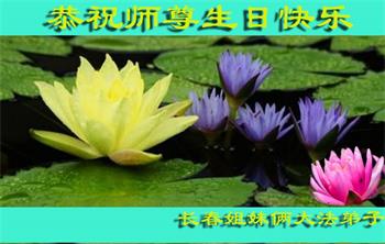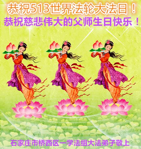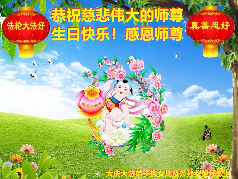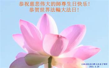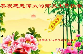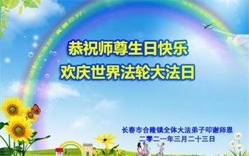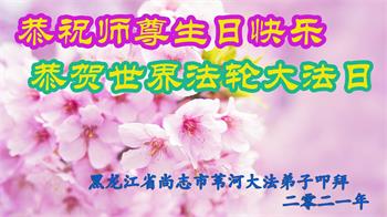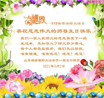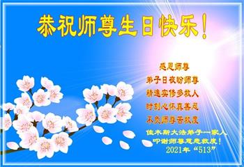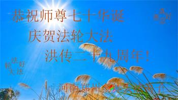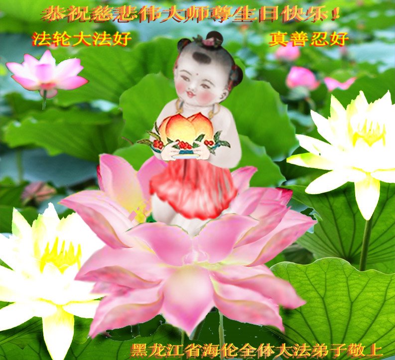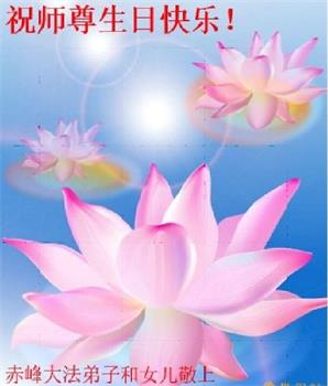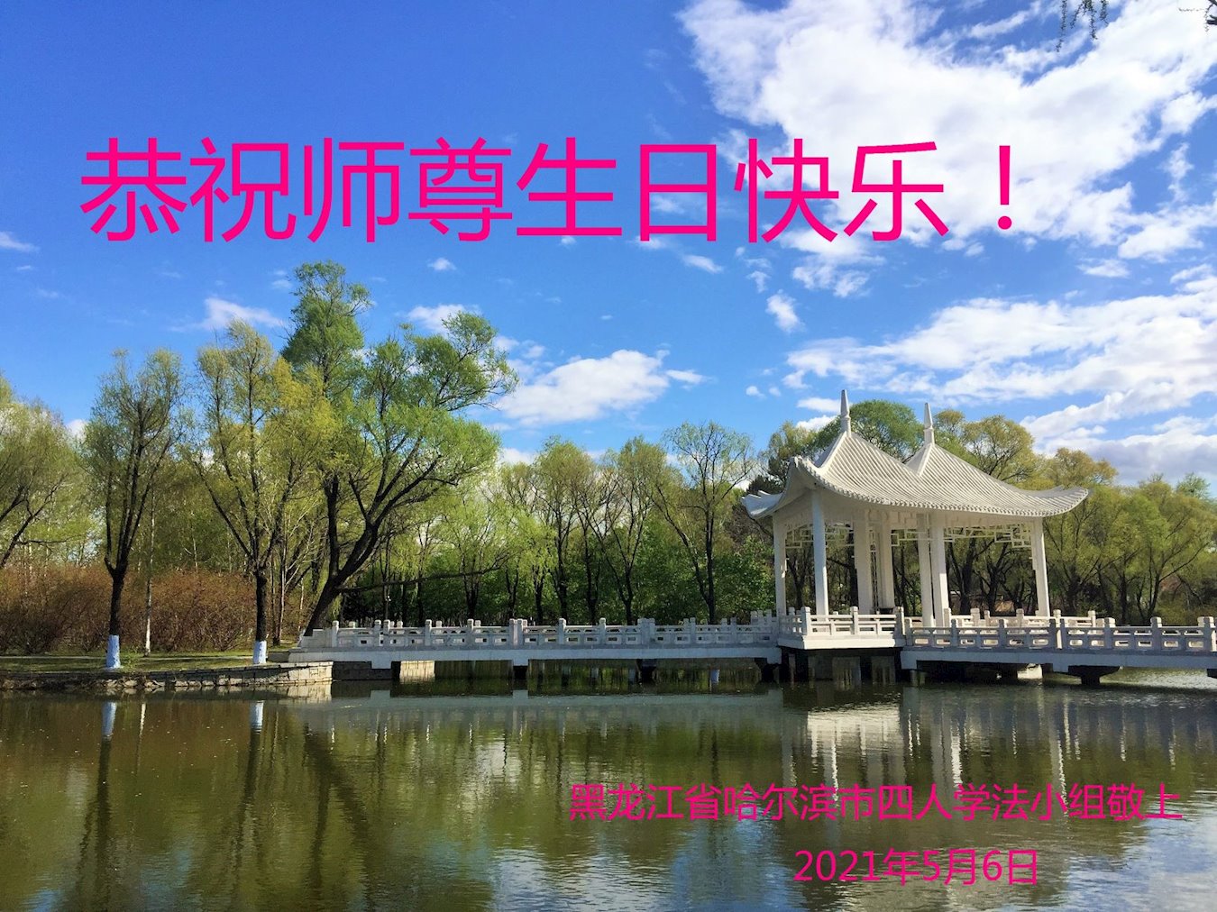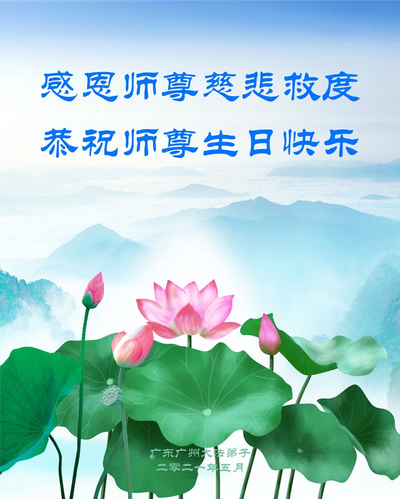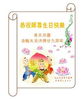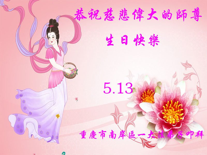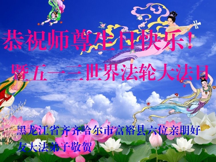 师尊您好!弟子恭祝师尊华诞!恭贺世界法轮大法日!在这普天同庆的日子里,弟子同歌同颂师尊之无量慈悲:感恩师尊把大法传给弟子,指引我们走上返本归真的大道;感恩师尊教导弟子做一个为他的生命,危难中不忘救度众生。弟子一定不忘使命,学好法,多救人,带领众生圆满随师还!弟子叩谢师恩!