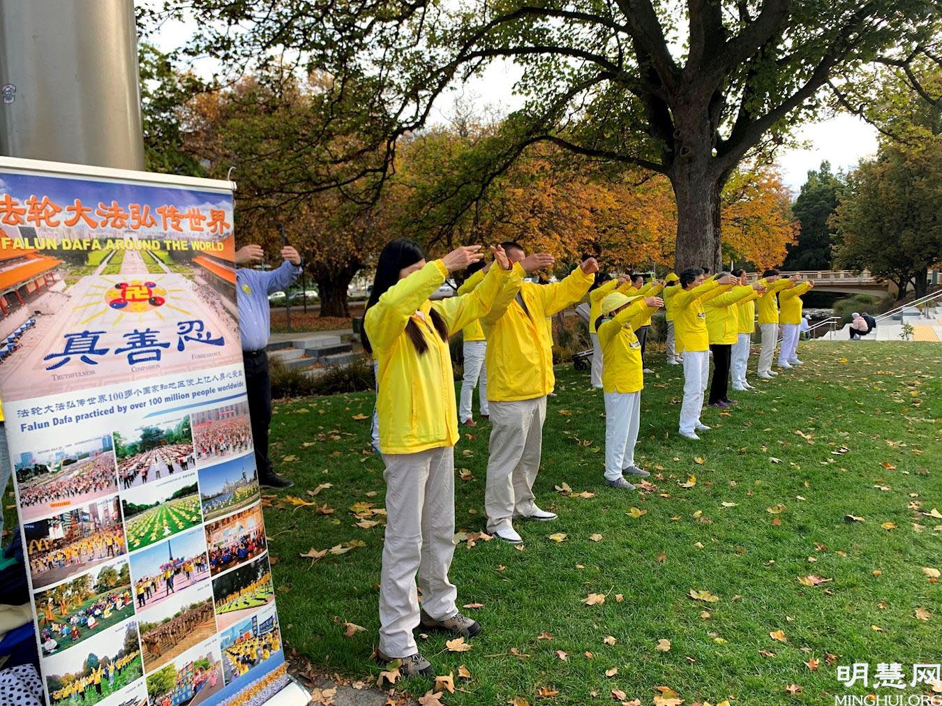 集会现场,法轮功学员向当地居民展示法轮大法功法,介绍了他们在大法修炼中受益的真实故事,优美欢快的中国传统腰鼓表达了法轮功学员的喜悦心情。活动现场引来许多市民驻足观看、拍照,还有当地自媒体人前来制作视频,准备上传至社交媒体。