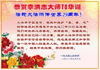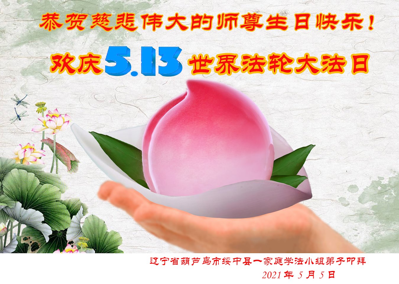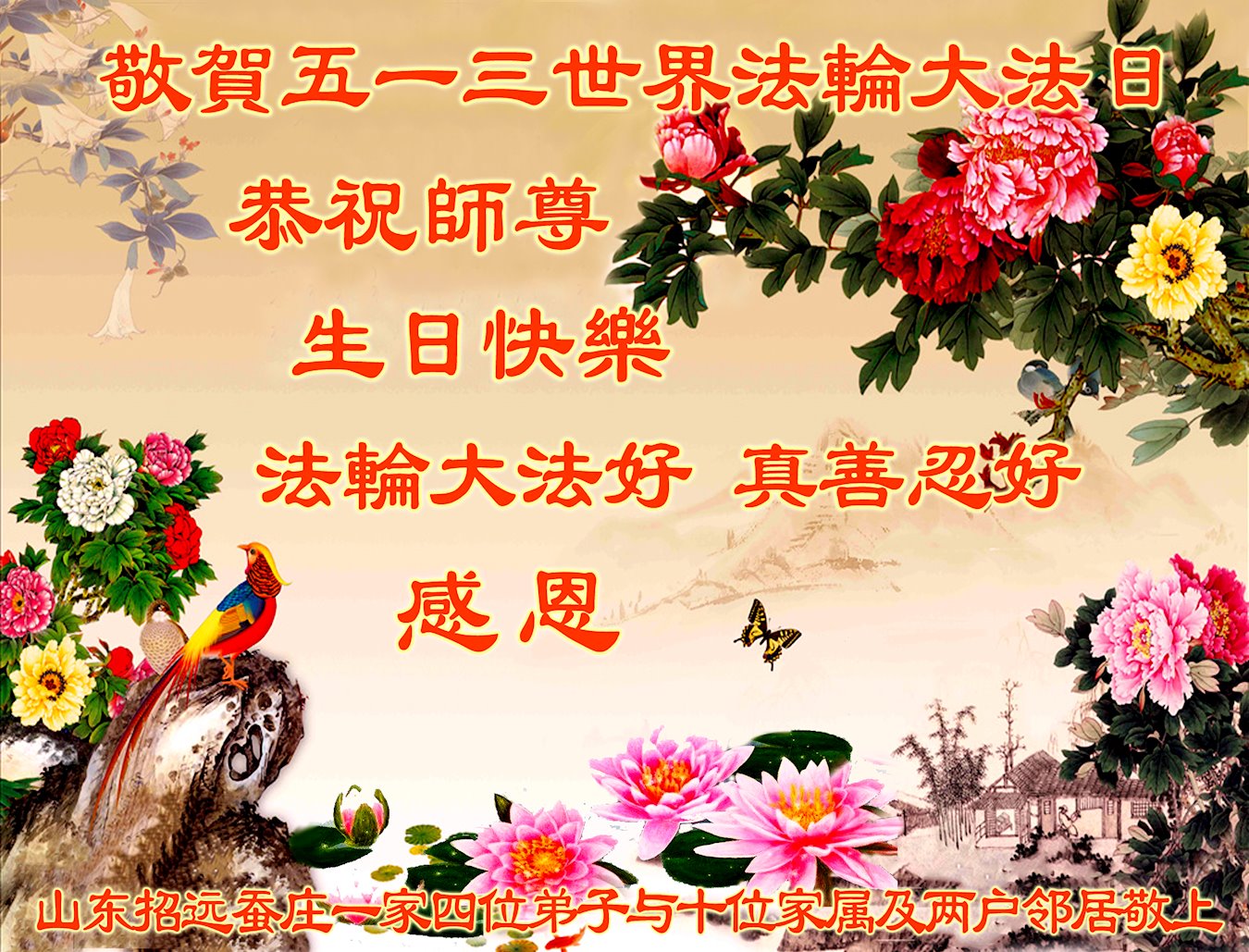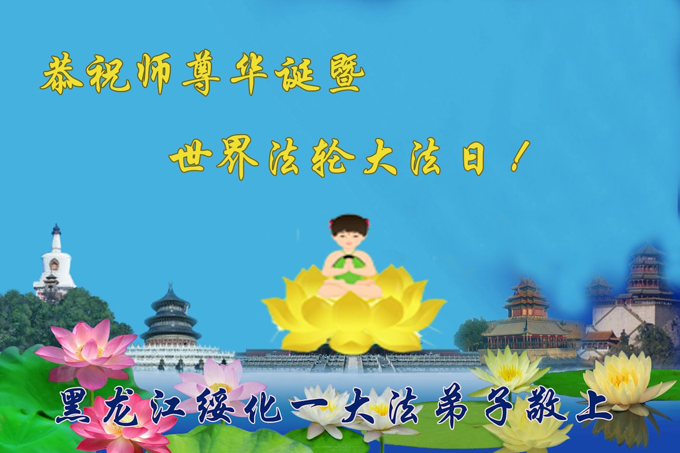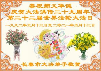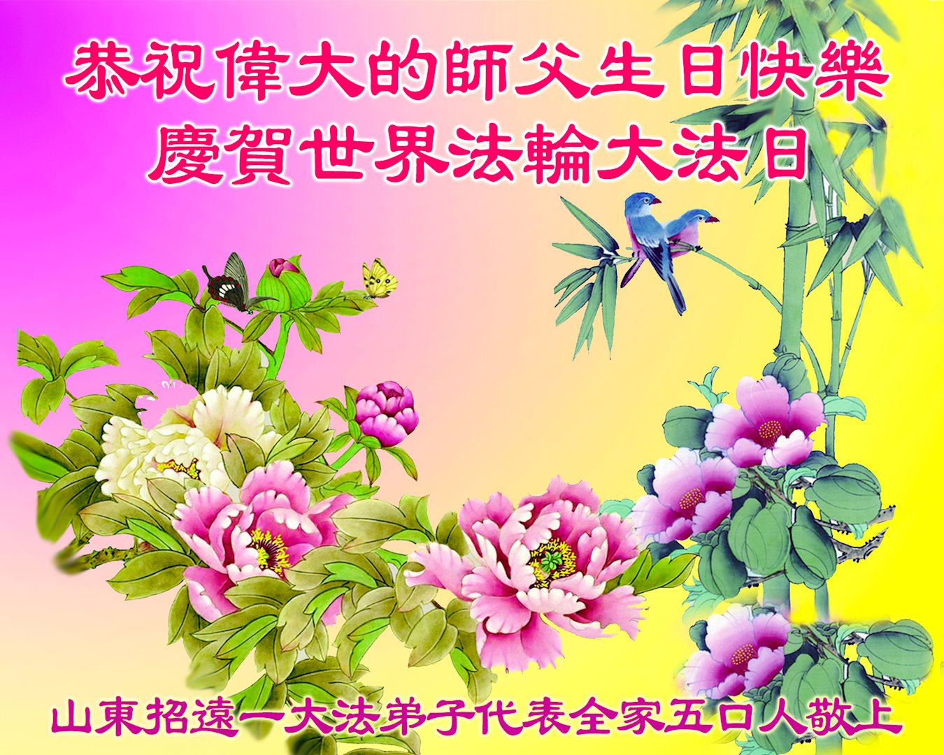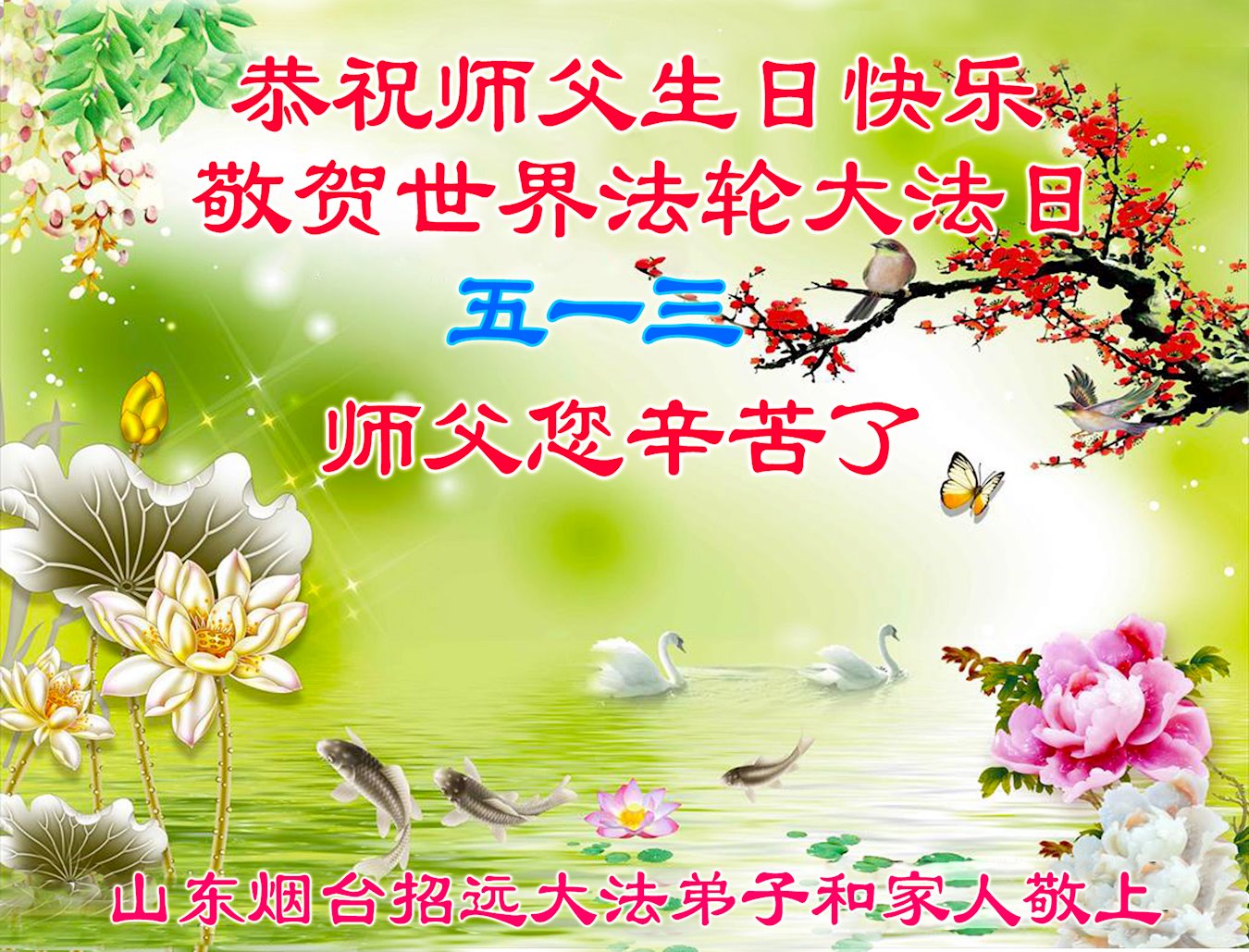 在师尊华诞暨世界法轮大法日来临之际,中国大陆一新学员及家人同修恭祝慈悲伟大的师尊生日快乐!谢谢师尊的慈悲苦度!