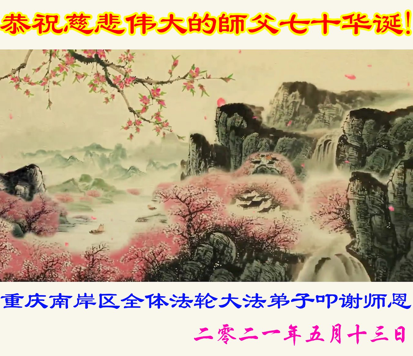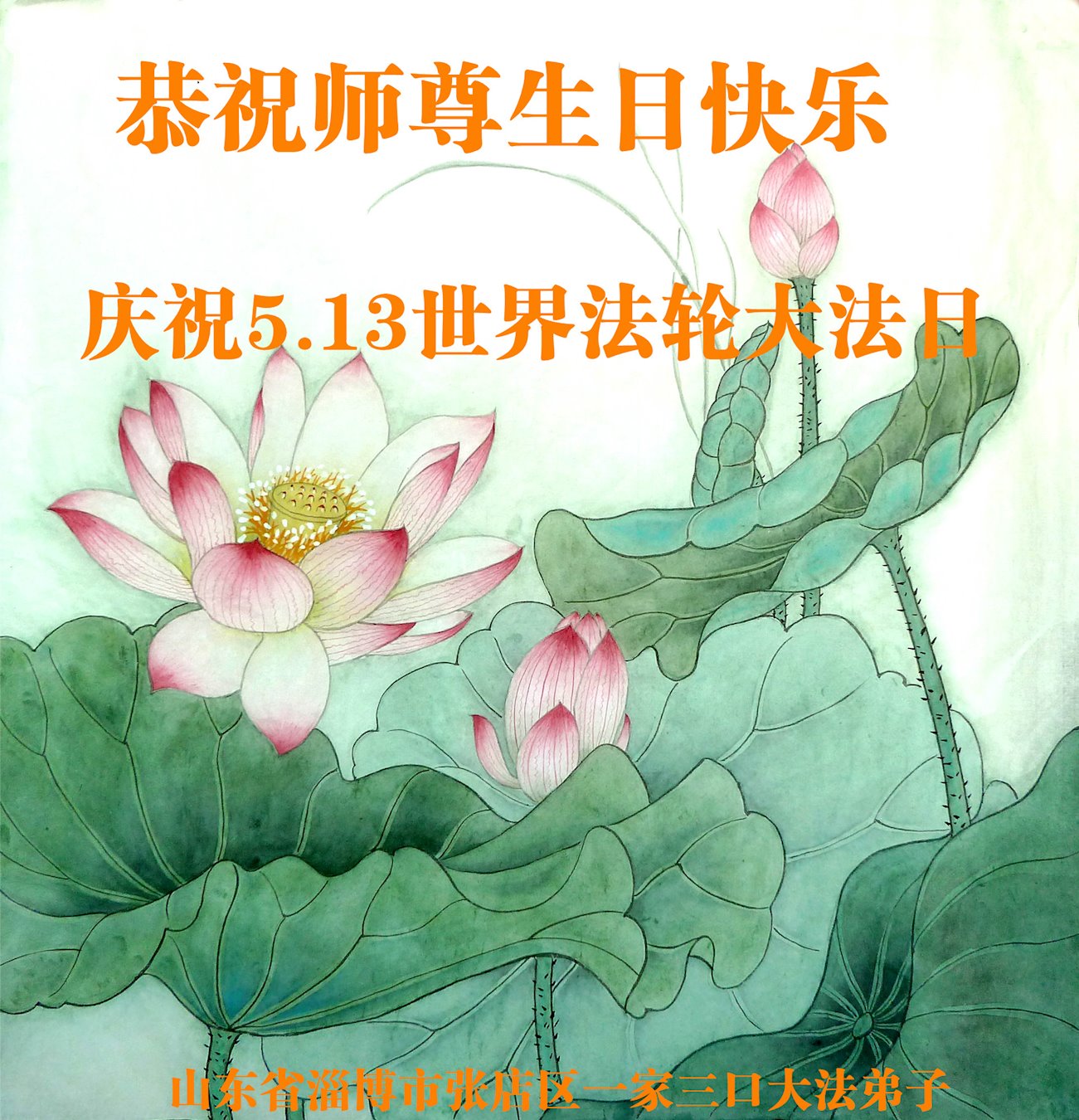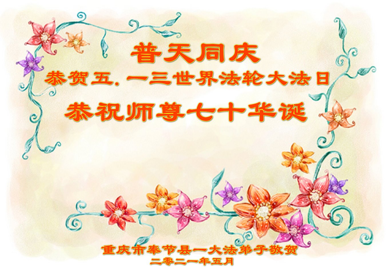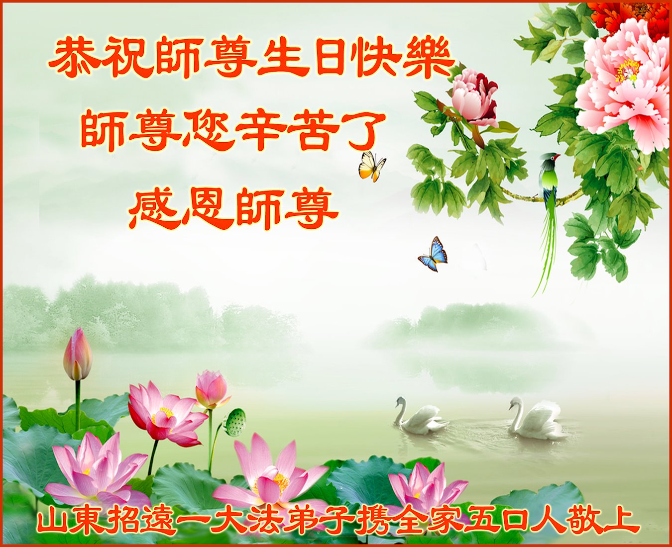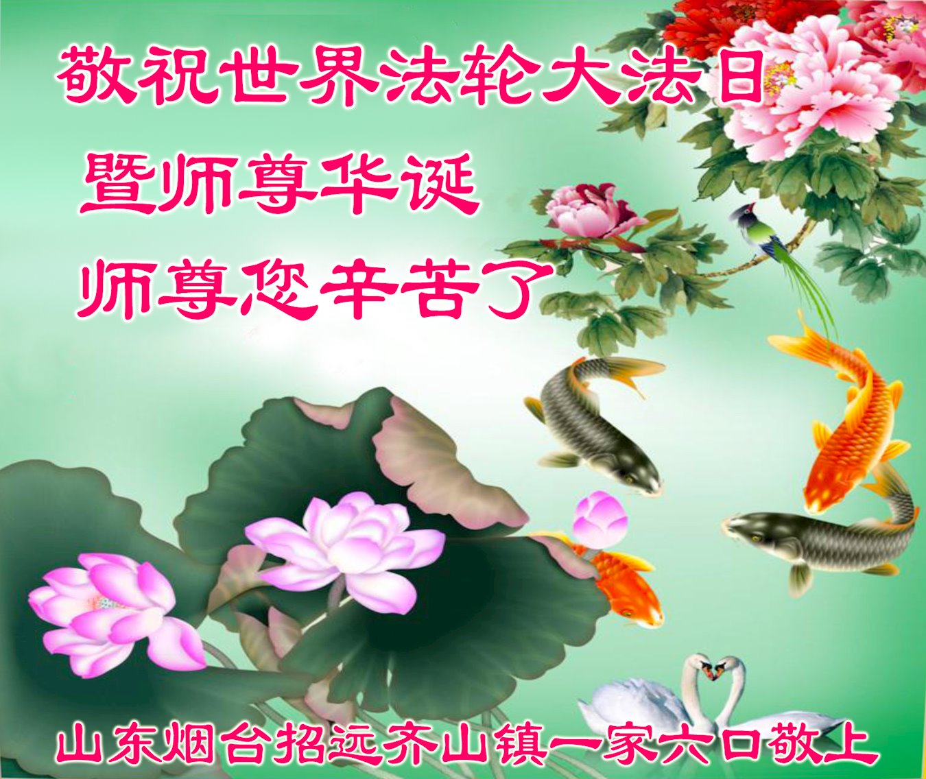 在师尊华诞暨世界法轮大法日来临之际,中国大陆一新学员及家人同修恭祝慈悲伟大的师尊生日快乐!谢谢师尊的慈悲苦度!