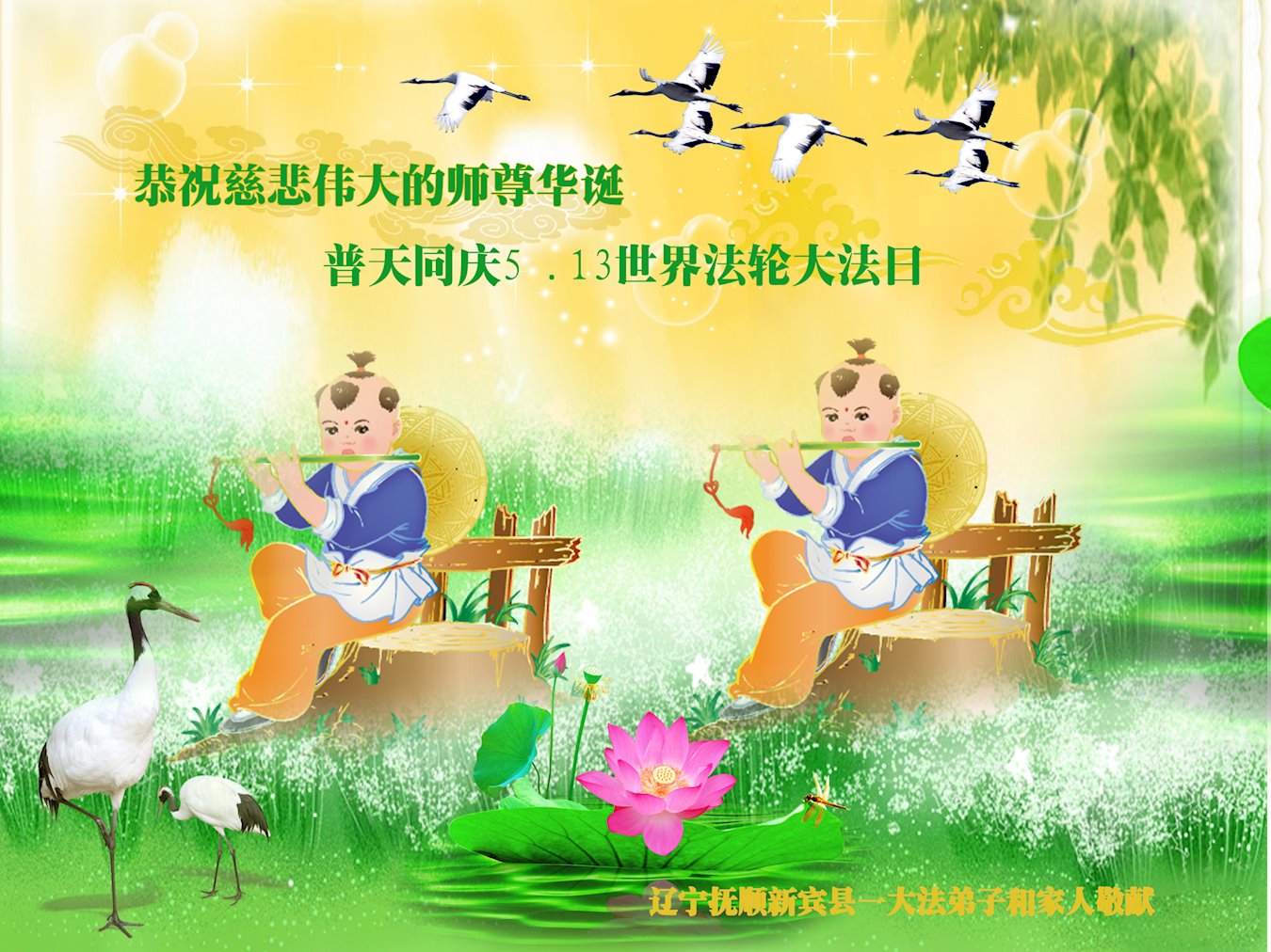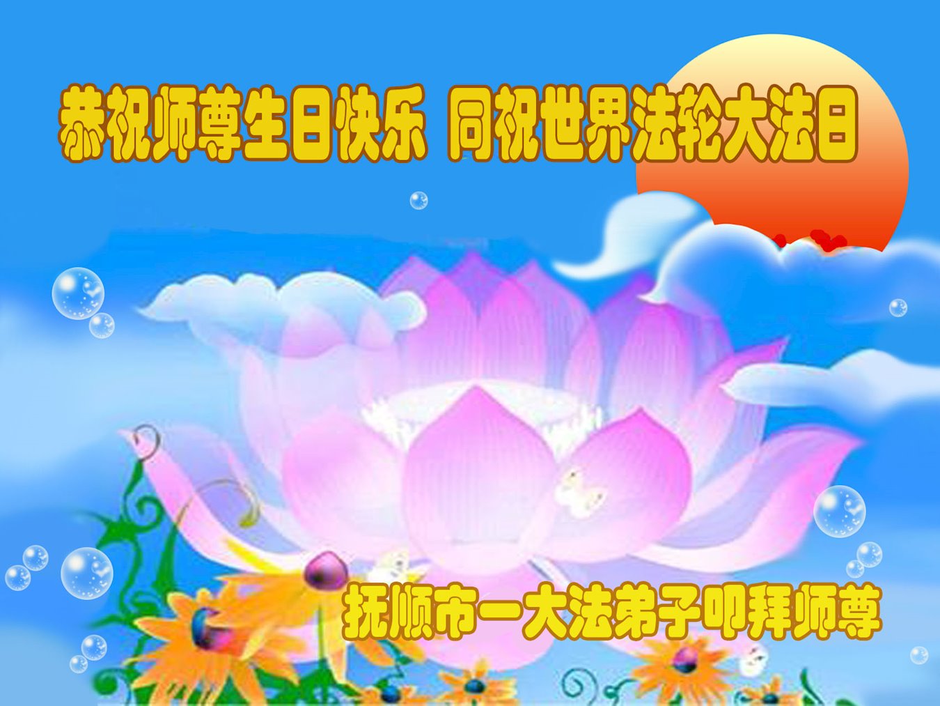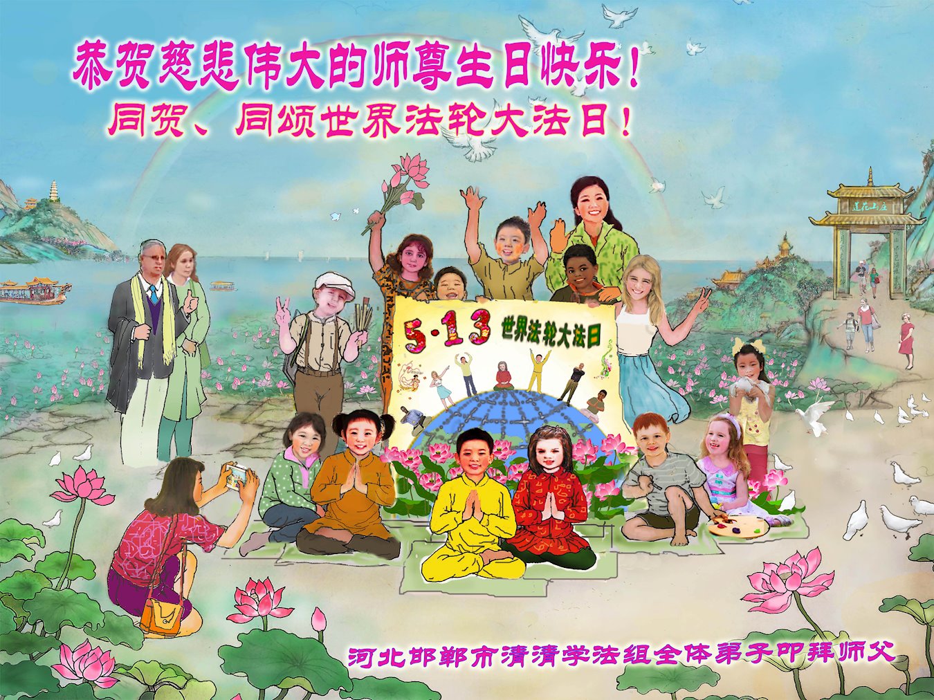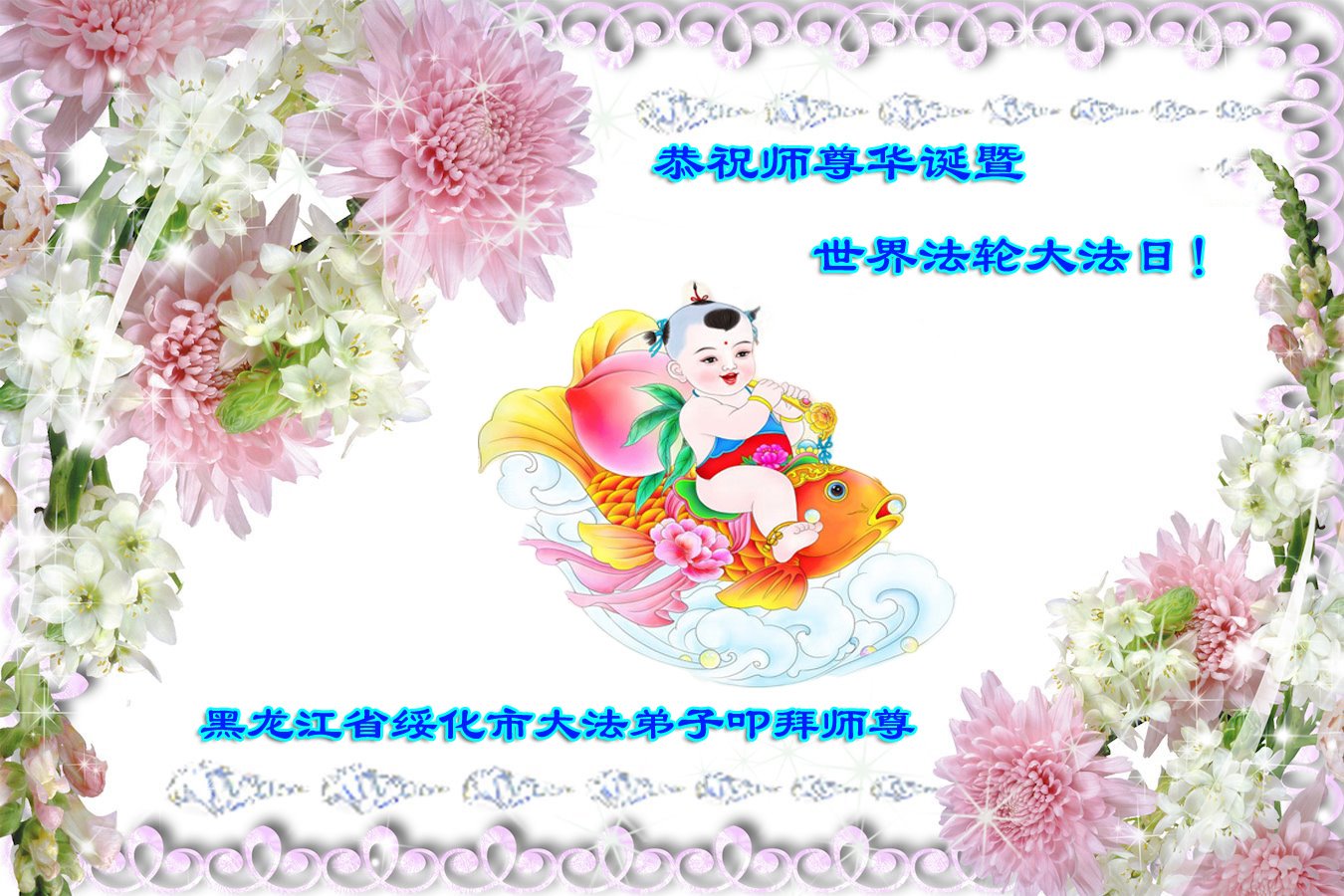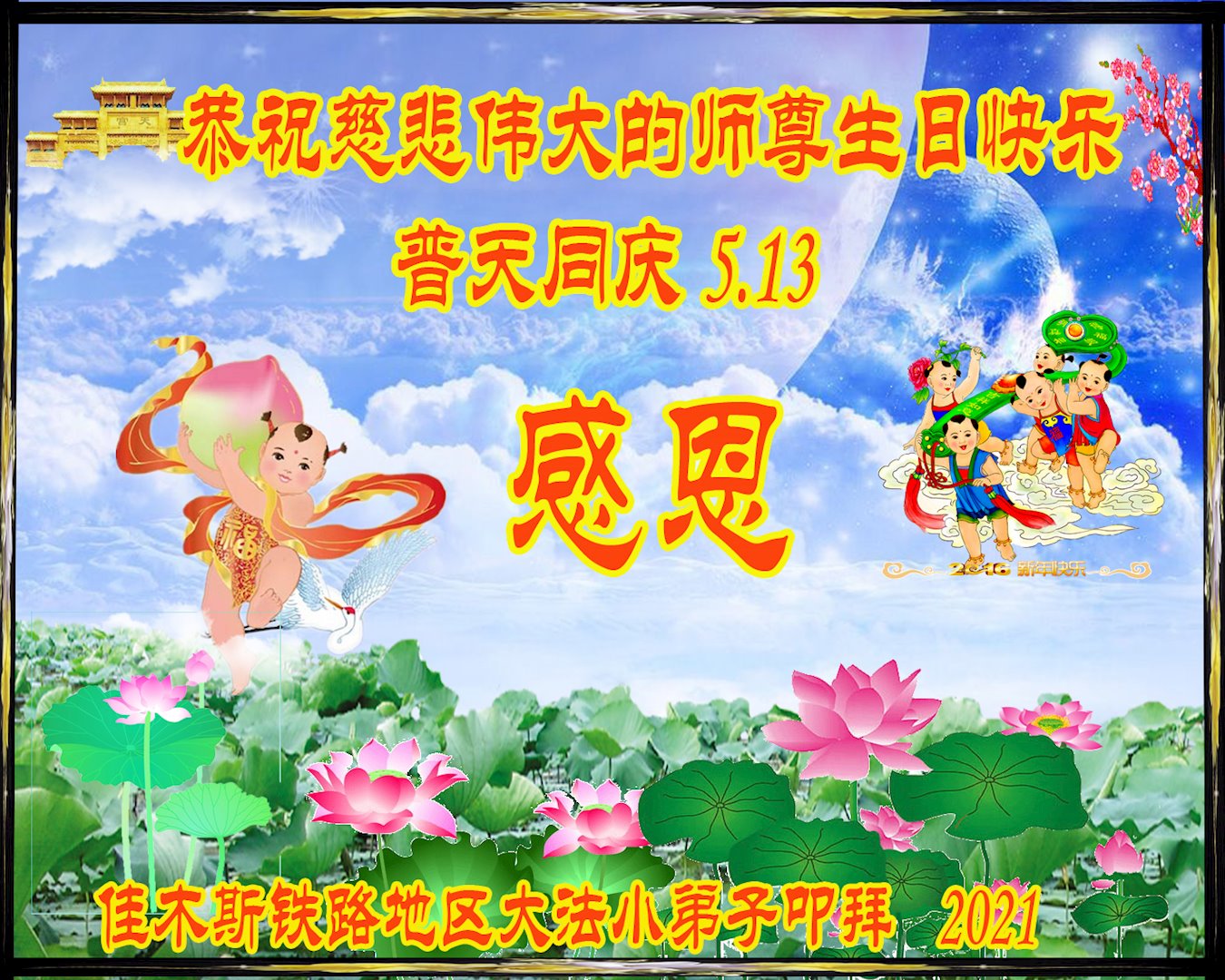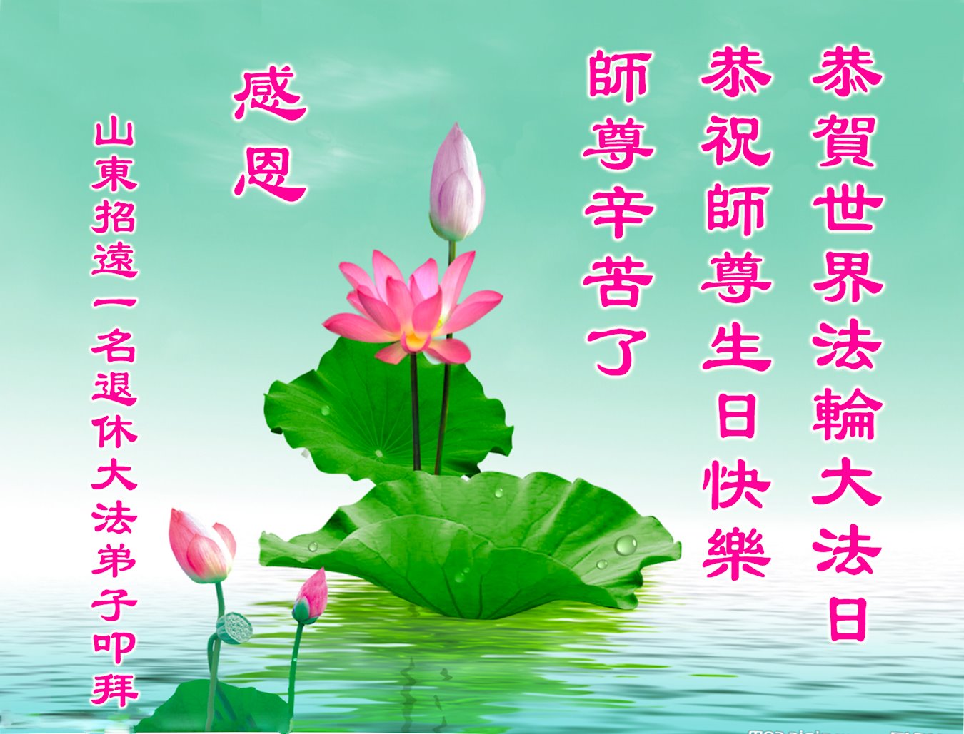 在师尊华诞暨世界法轮大法日来临之际,中国大陆一新学员及家人同修恭祝慈悲伟大的师尊生日快乐!谢谢师尊的慈悲苦度!