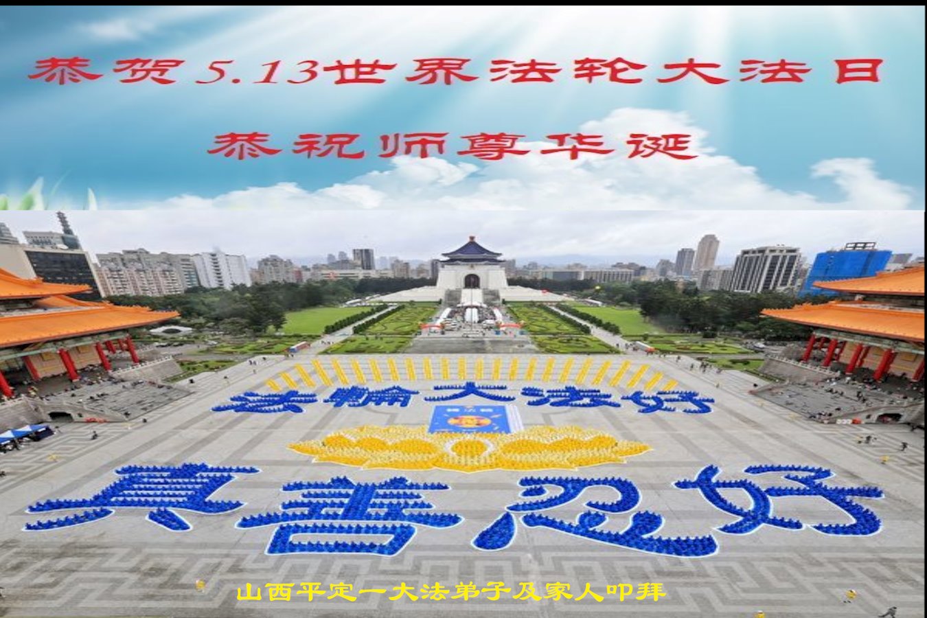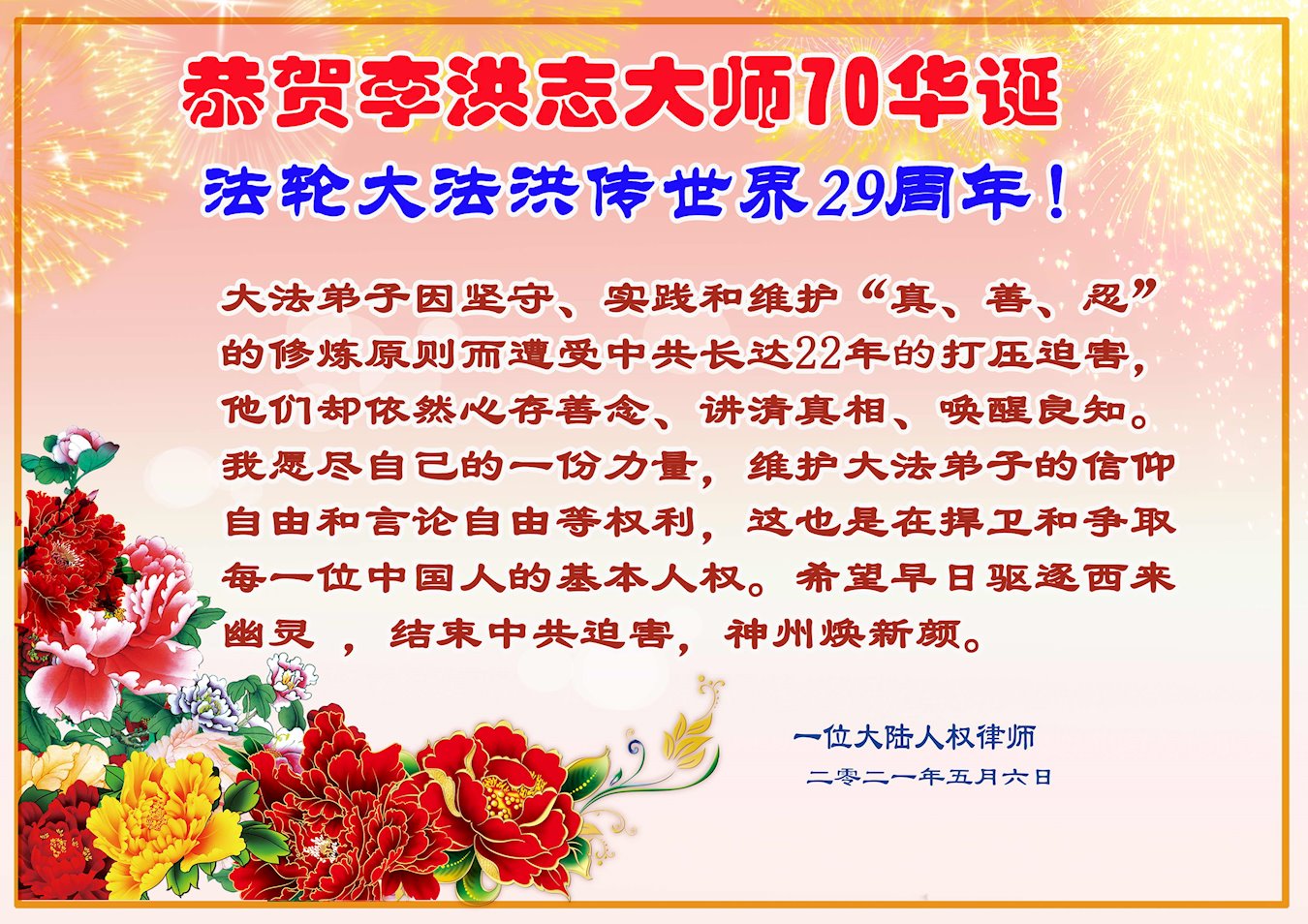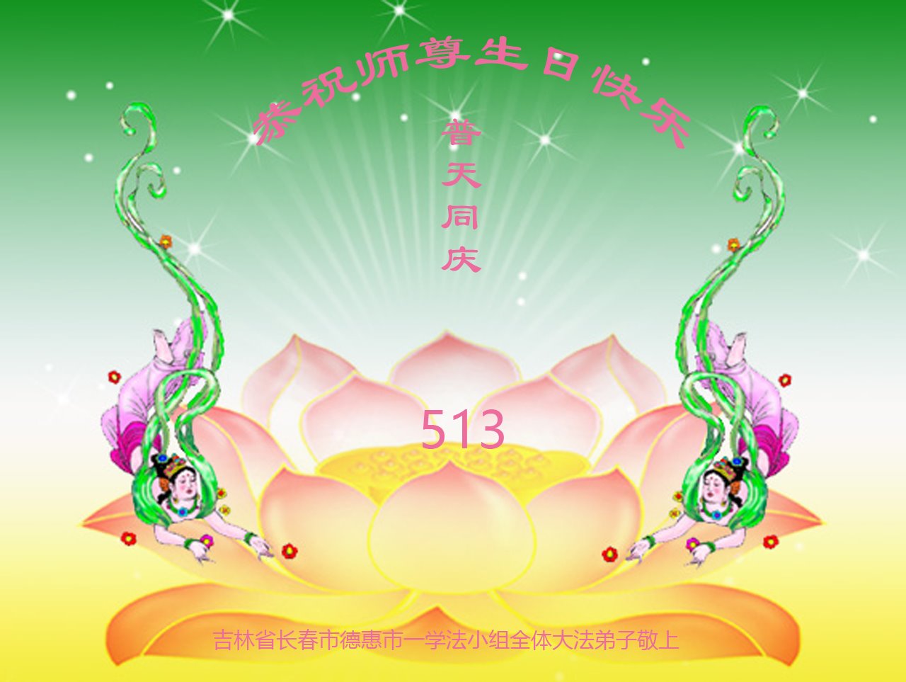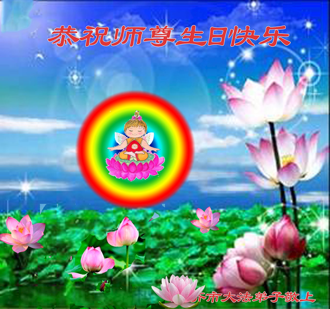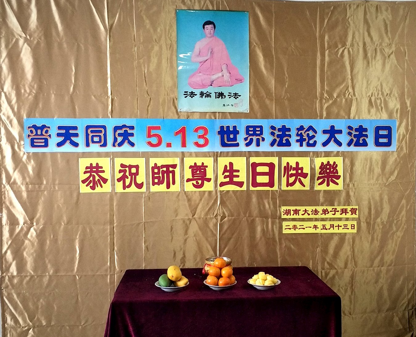 在师尊华诞暨世界法轮大法日来临之际,中国大陆一新学员及家人同修恭祝慈悲伟大的师尊生日快乐!谢谢师尊的慈悲苦度!
