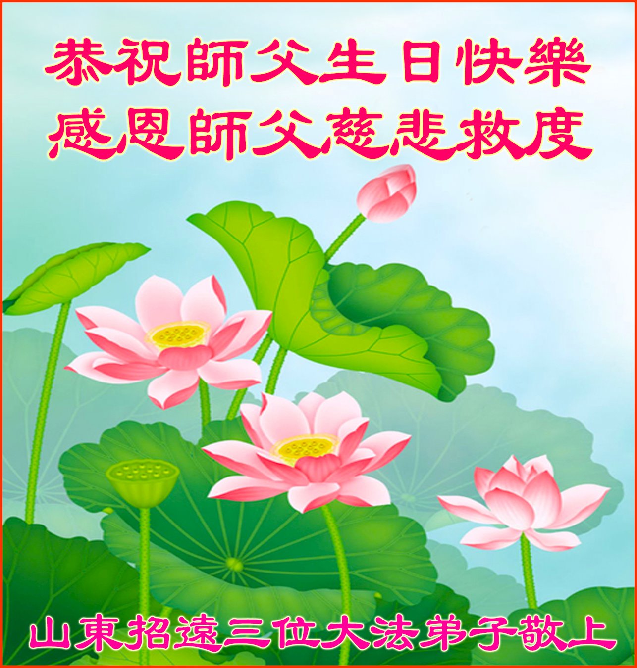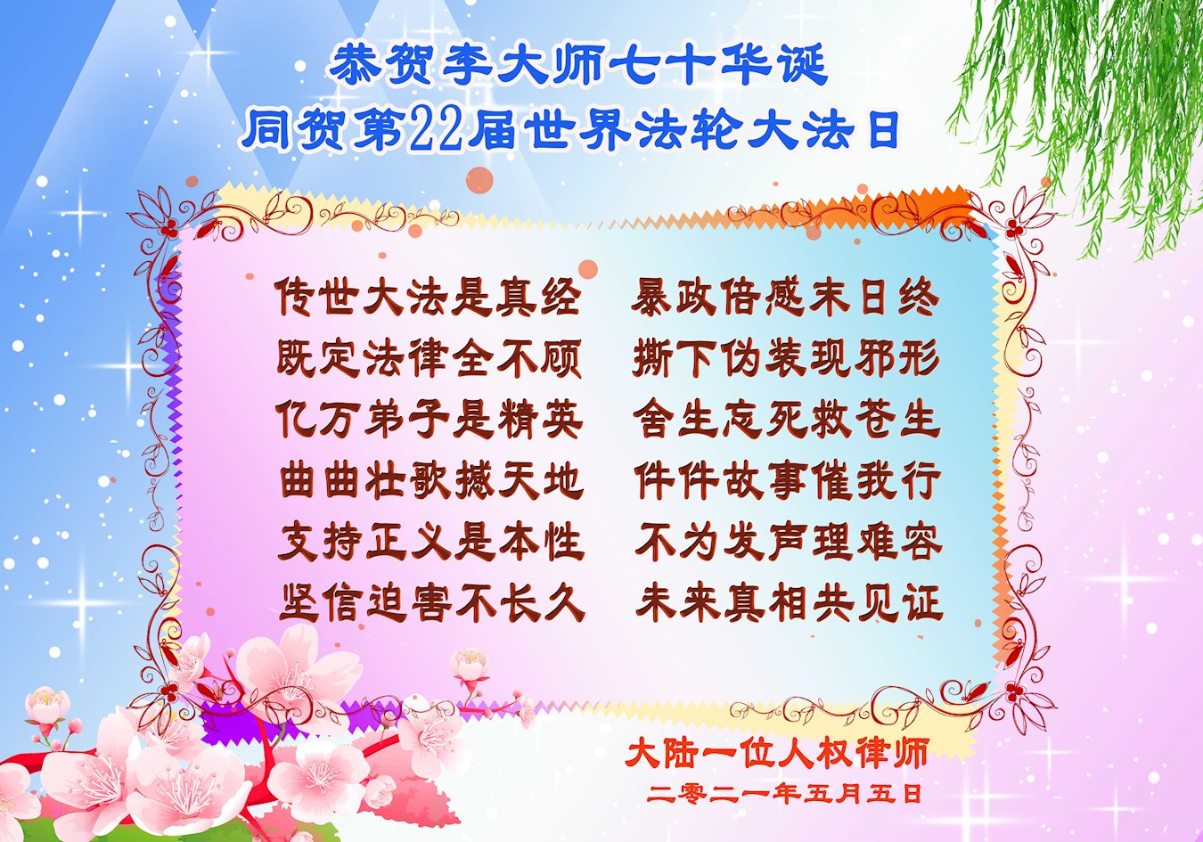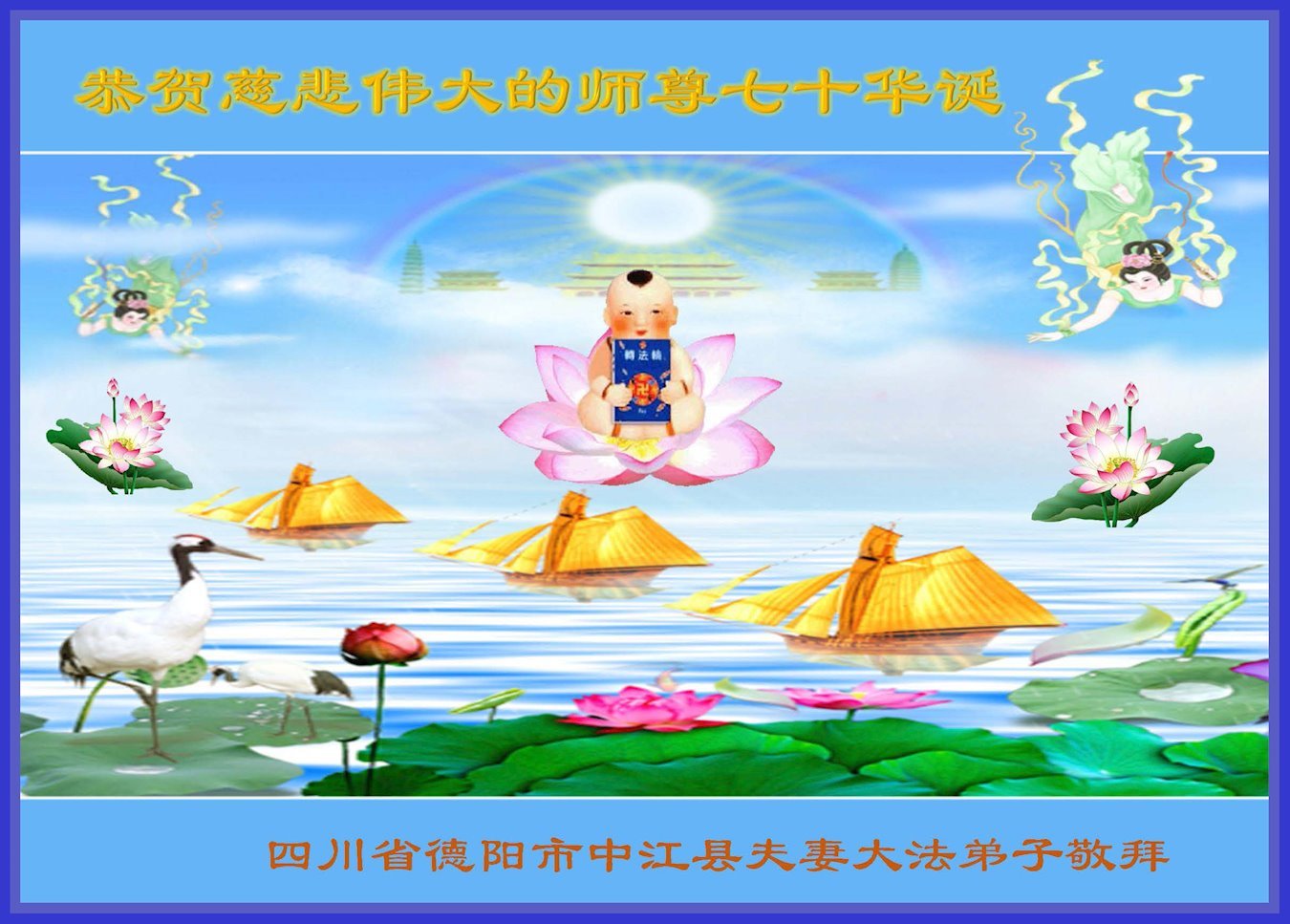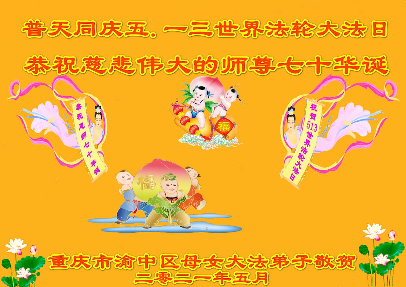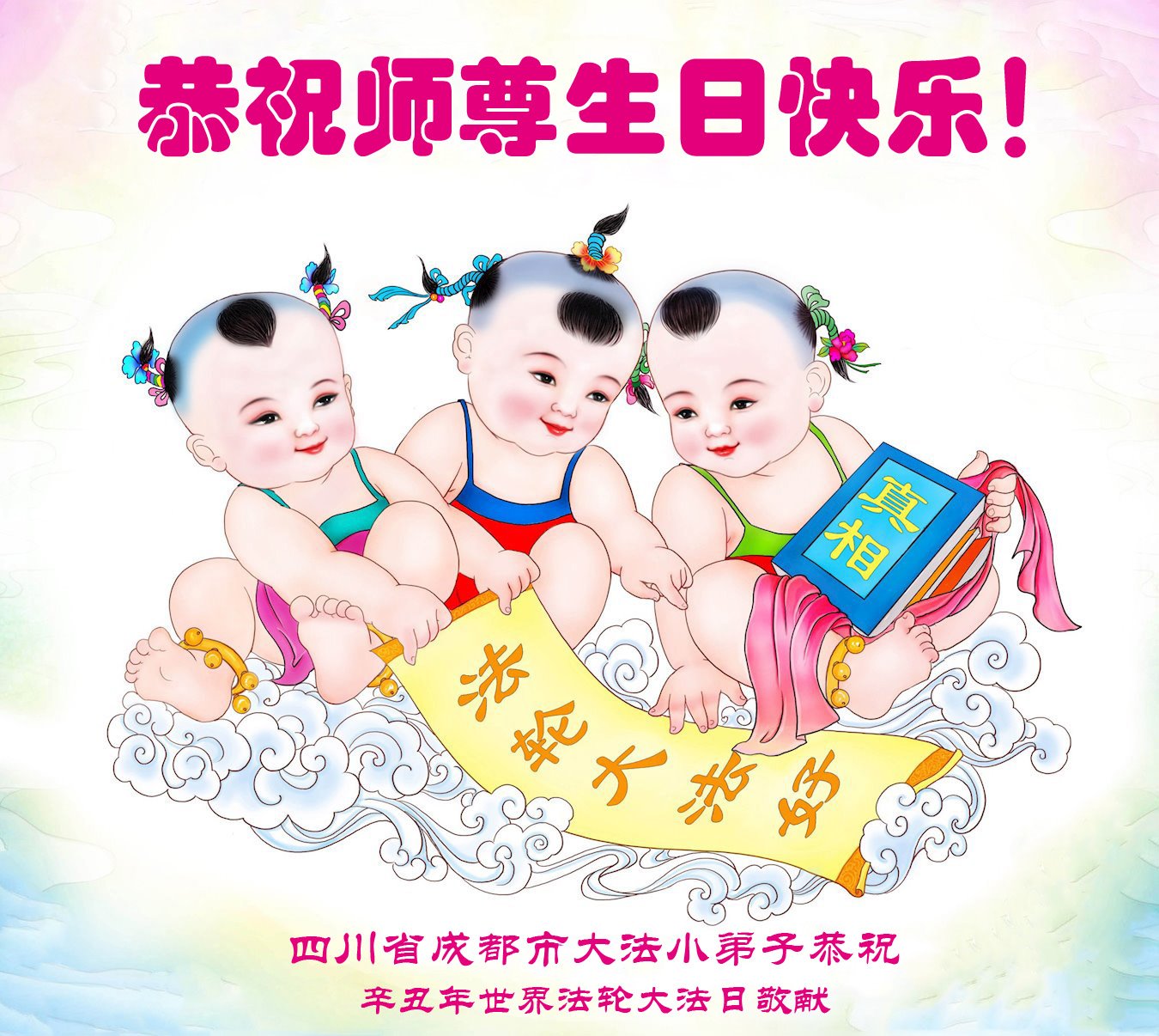 在师尊华诞暨世界法轮大法日来临之际,中国大陆一新学员及家人同修恭祝慈悲伟大的师尊生日快乐!谢谢师尊的慈悲苦度!