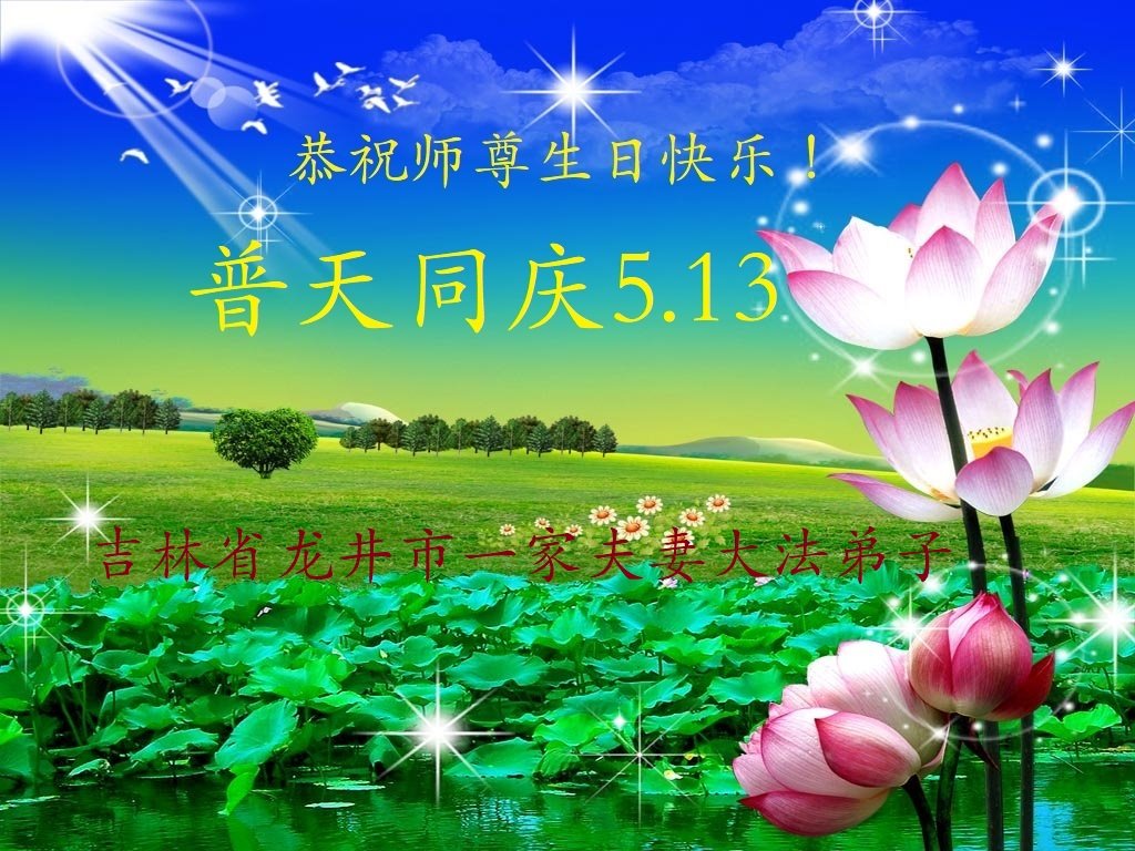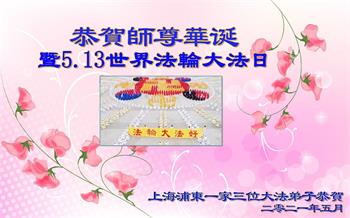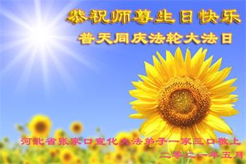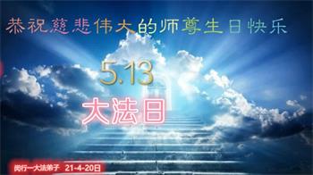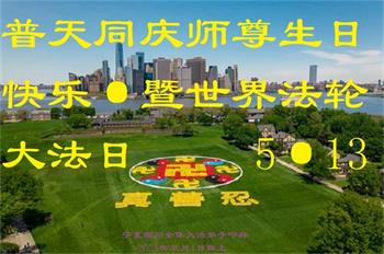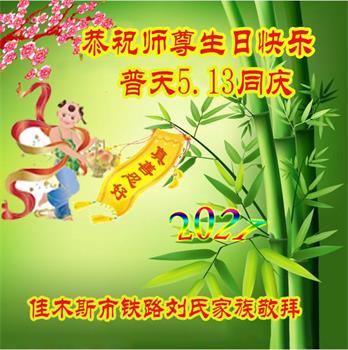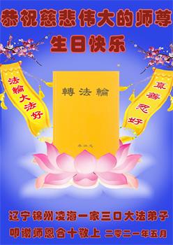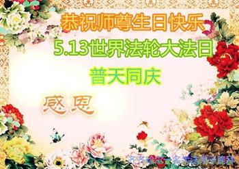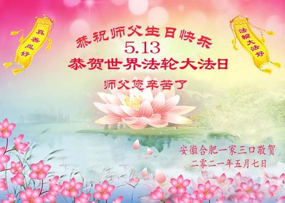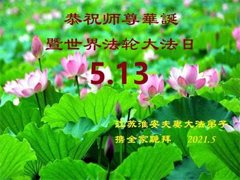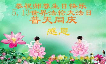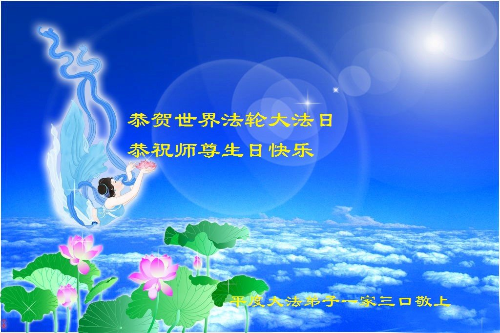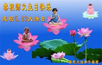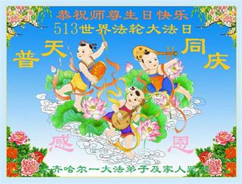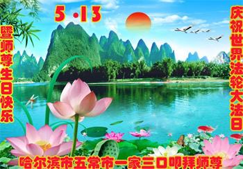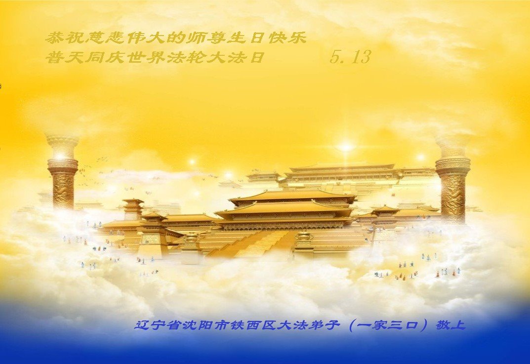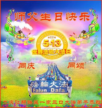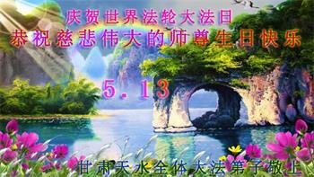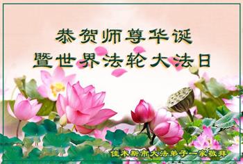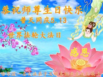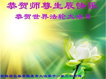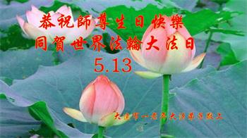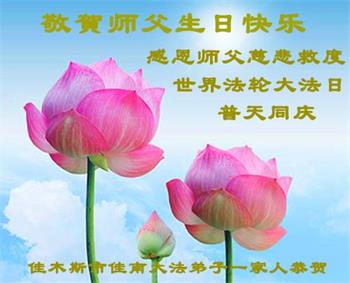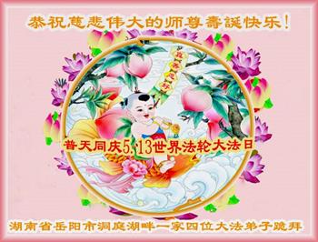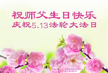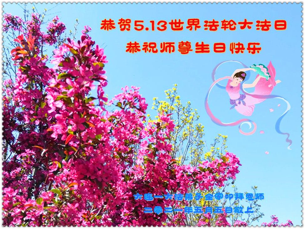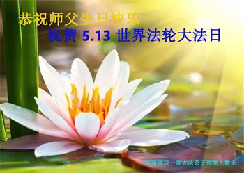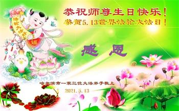 在全世界庆祝“五·一三”法轮大法日之际,我们全家人满怀喜悦庆贺法轮大法洪传世界这个特殊的日子!感恩大法师父救度之恩!恭祝师父生日快乐!