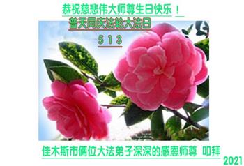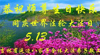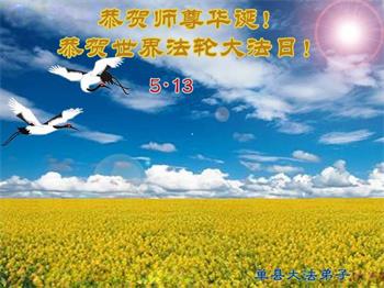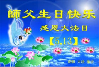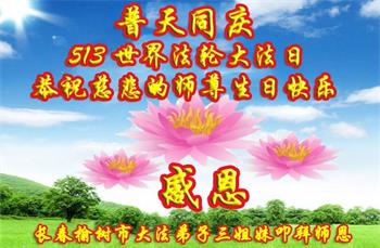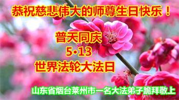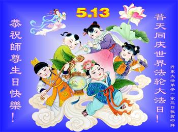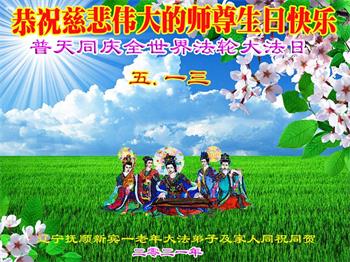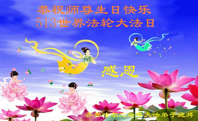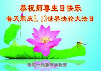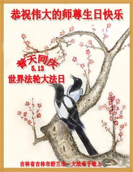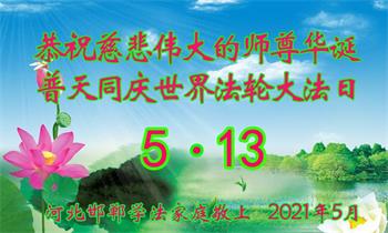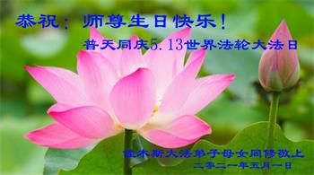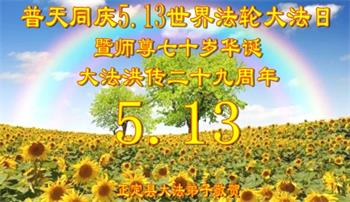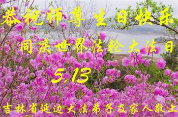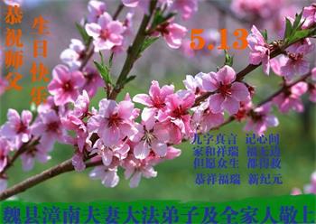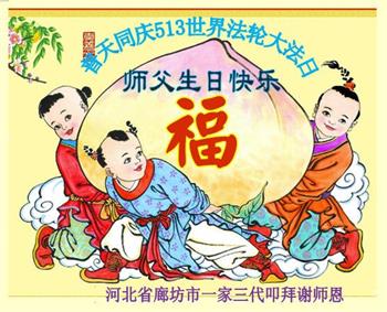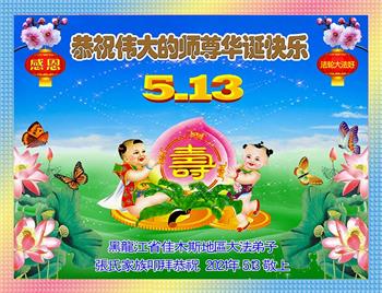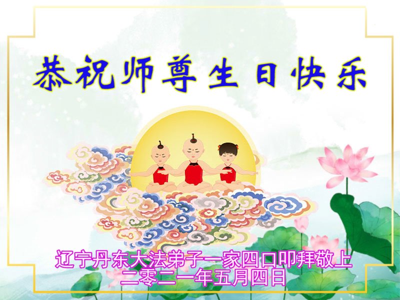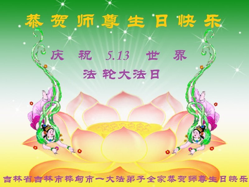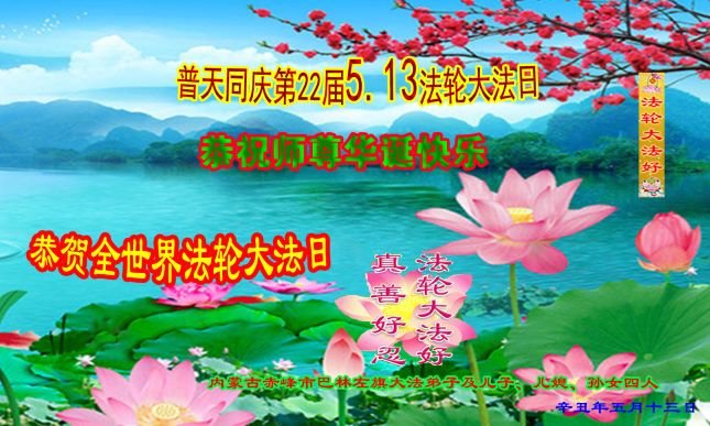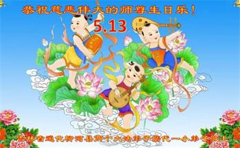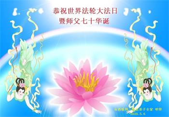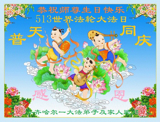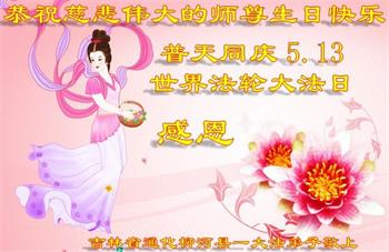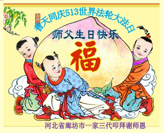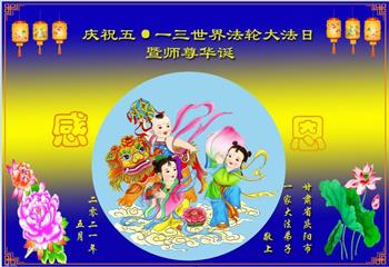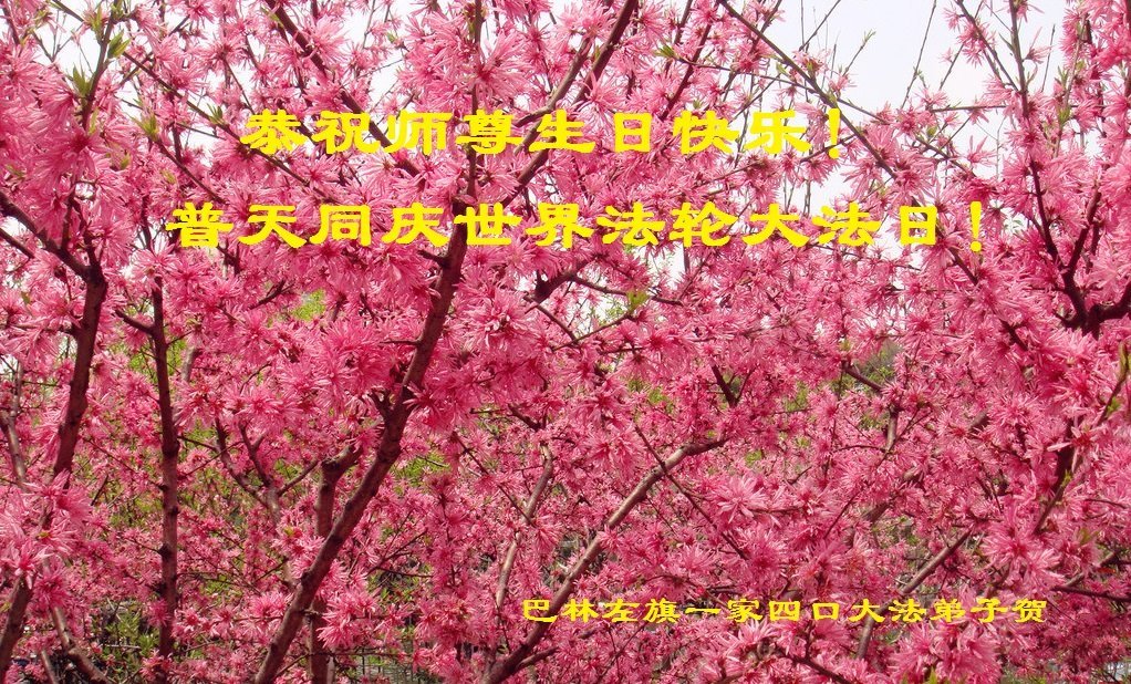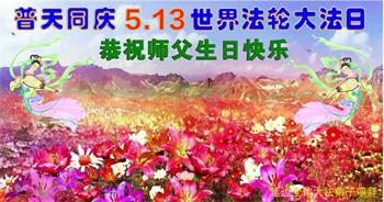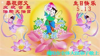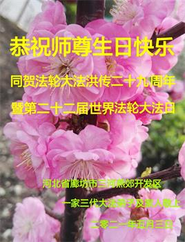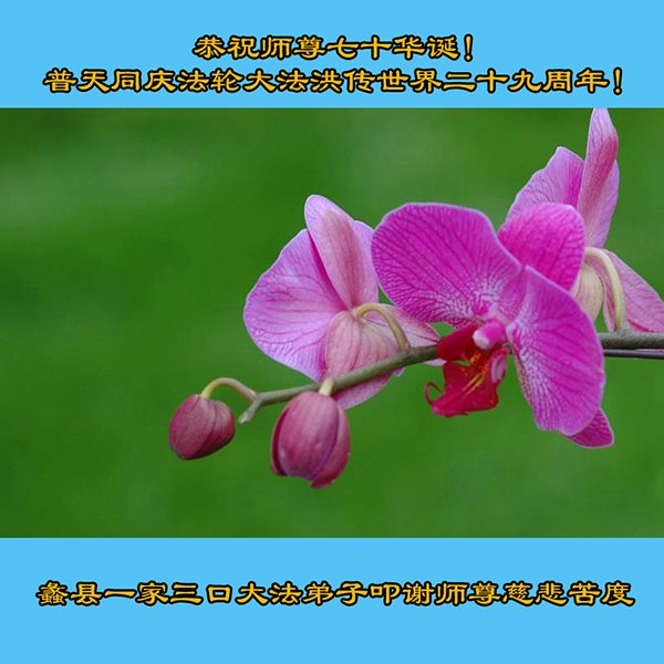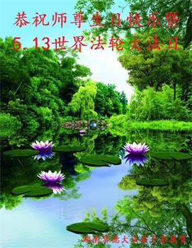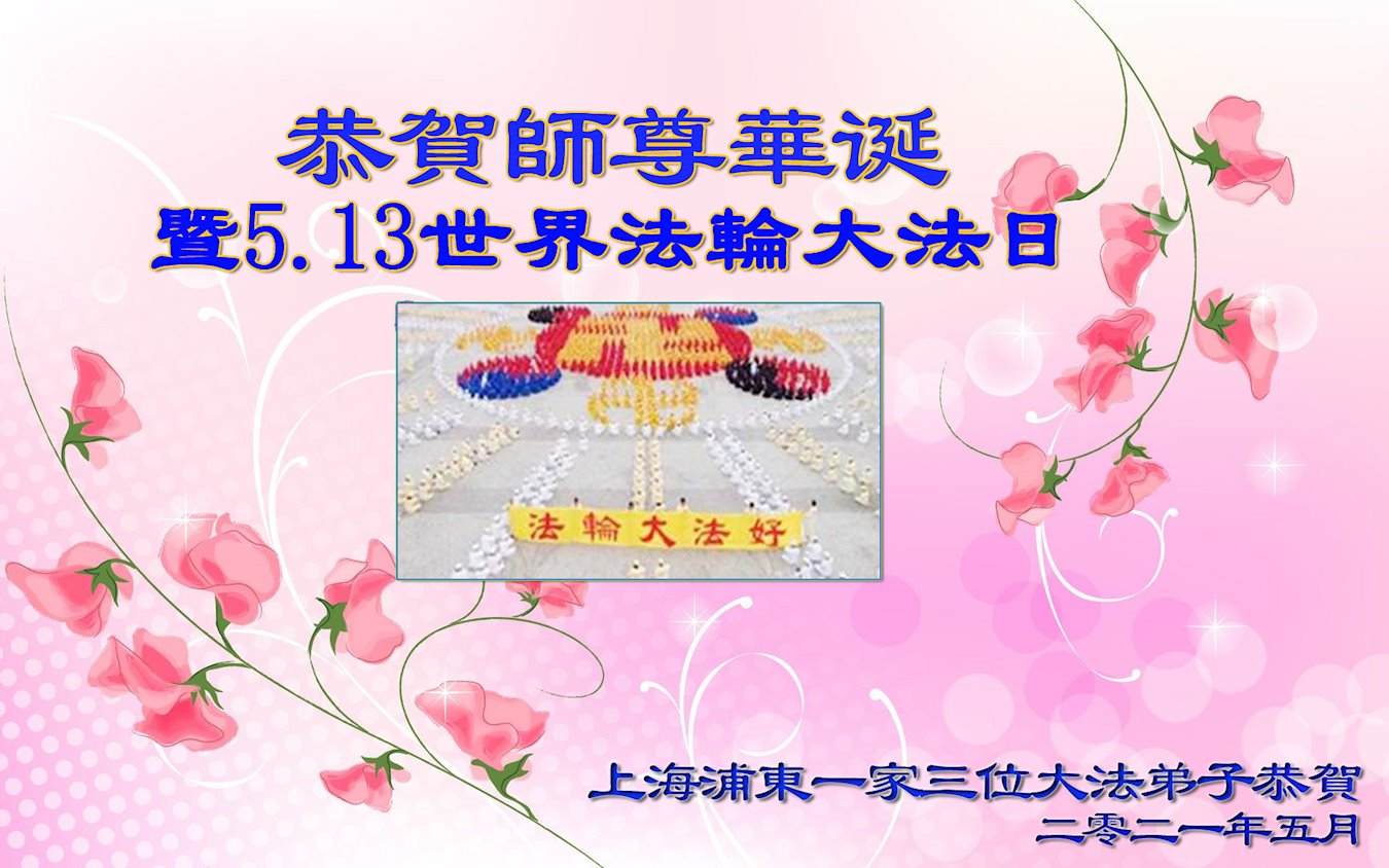 在全世界庆祝“五·一三”法轮大法日之际,我们全家人满怀喜悦庆贺法轮大法洪传世界这个特殊的日子!感恩大法师父救度之恩!恭祝师父生日快乐!