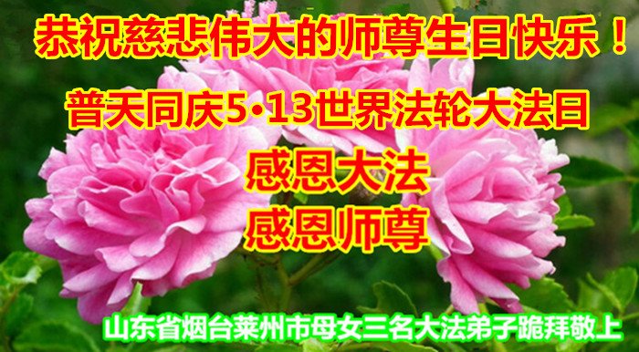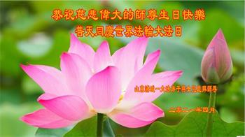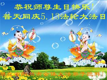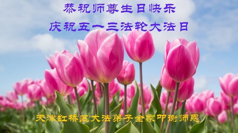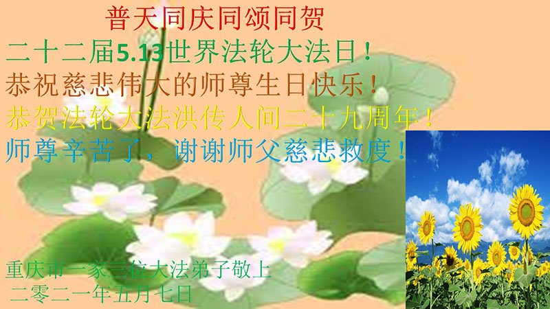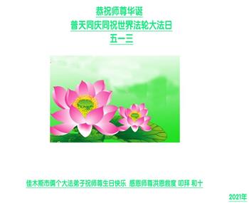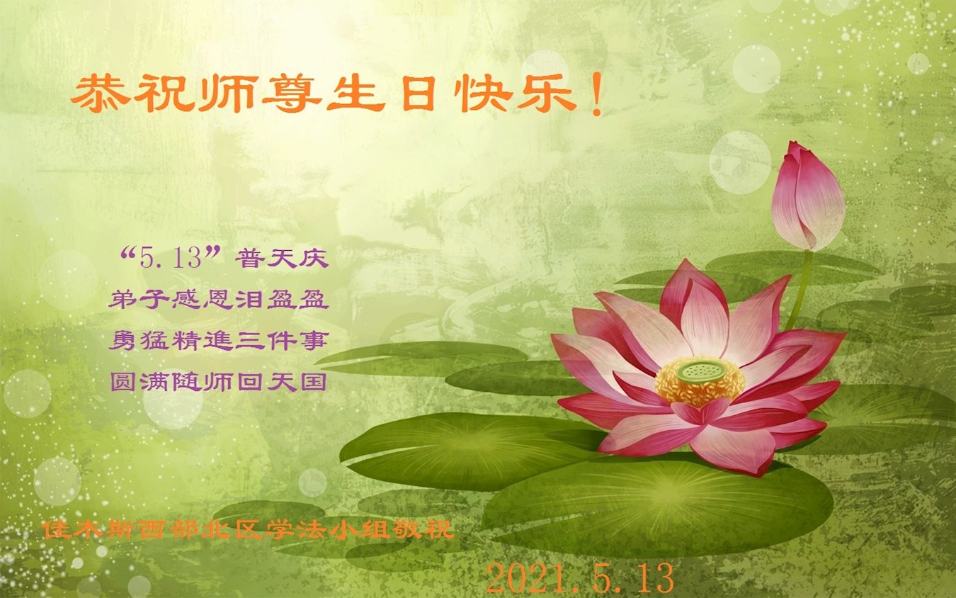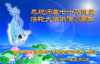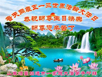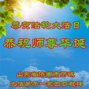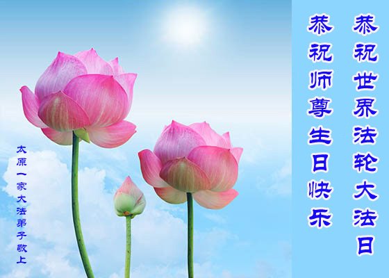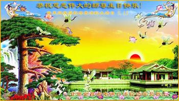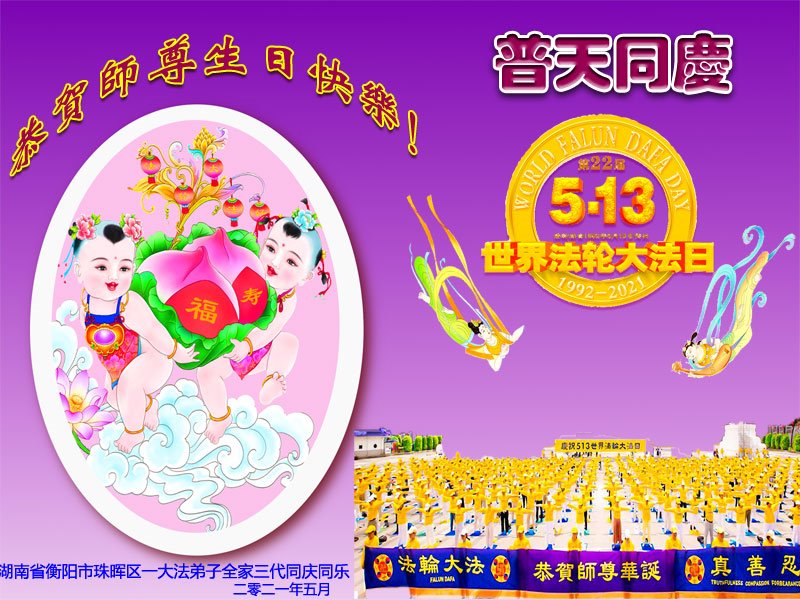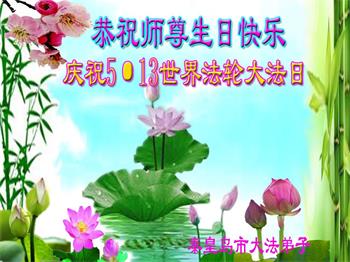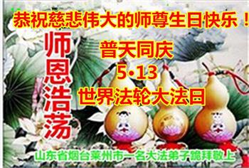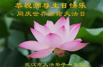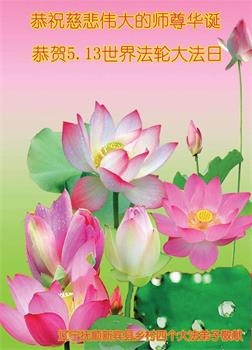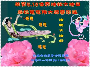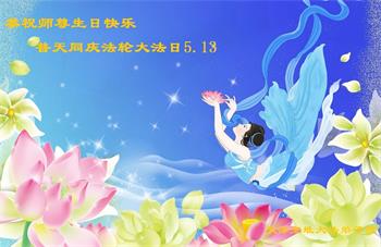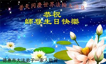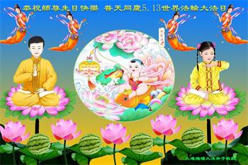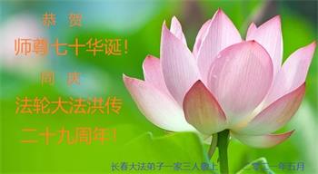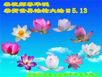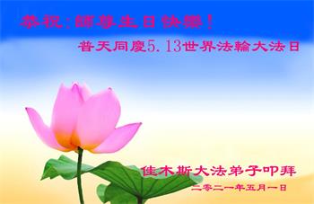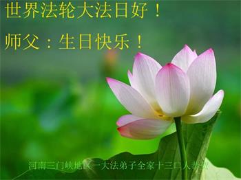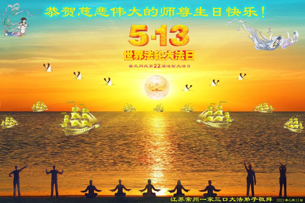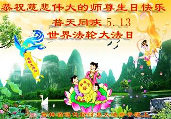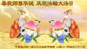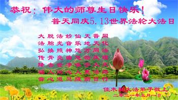 在全世界庆祝“五·一三”法轮大法日之际,我们全家人满怀喜悦庆贺法轮大法洪传世界这个特殊的日子!感恩大法师父救度之恩!恭祝师父生日快乐!