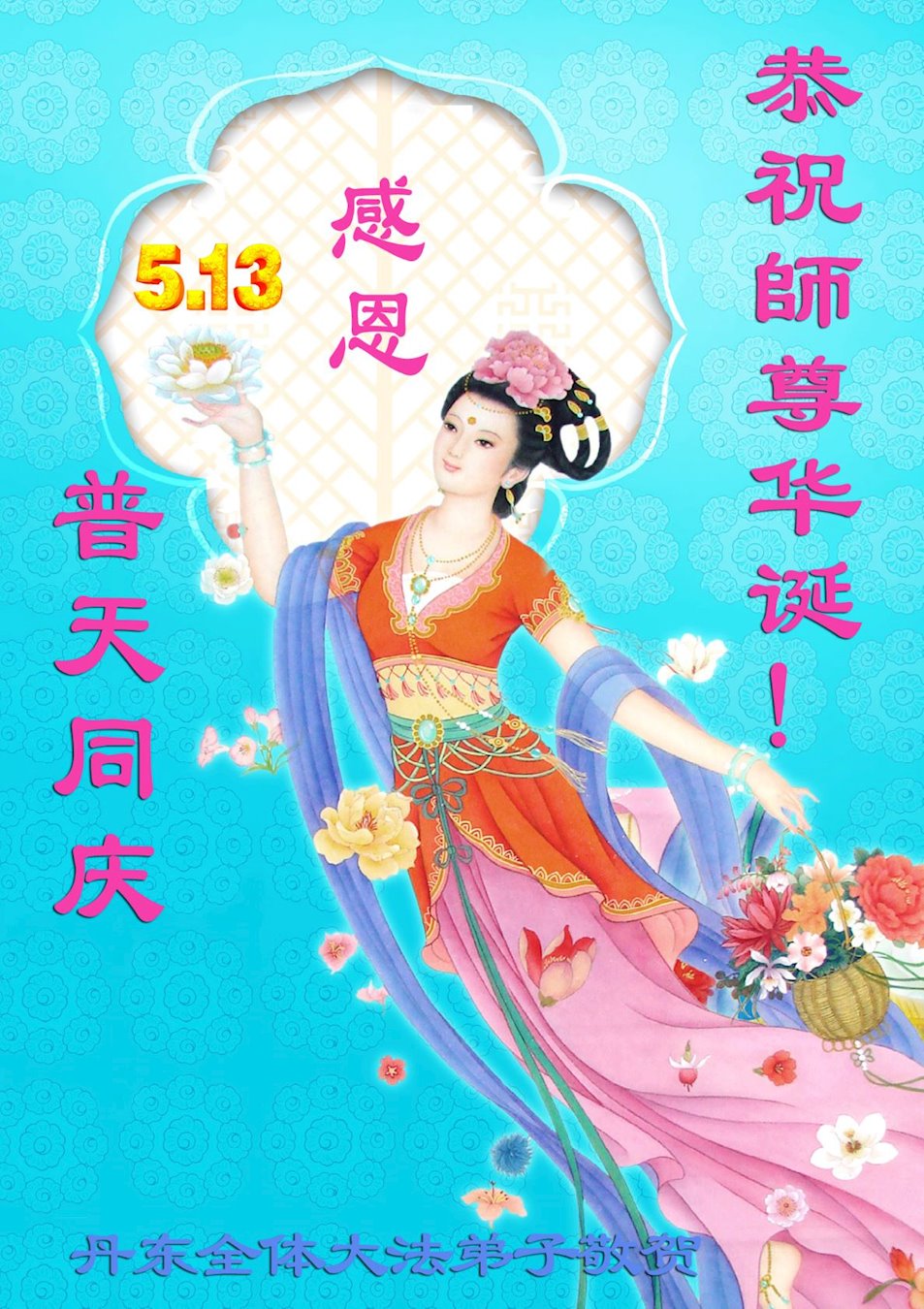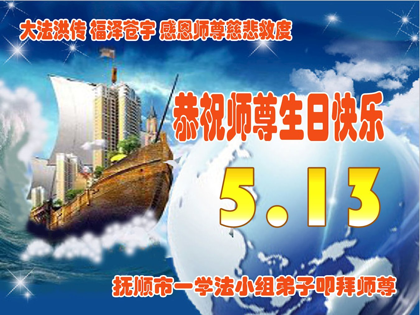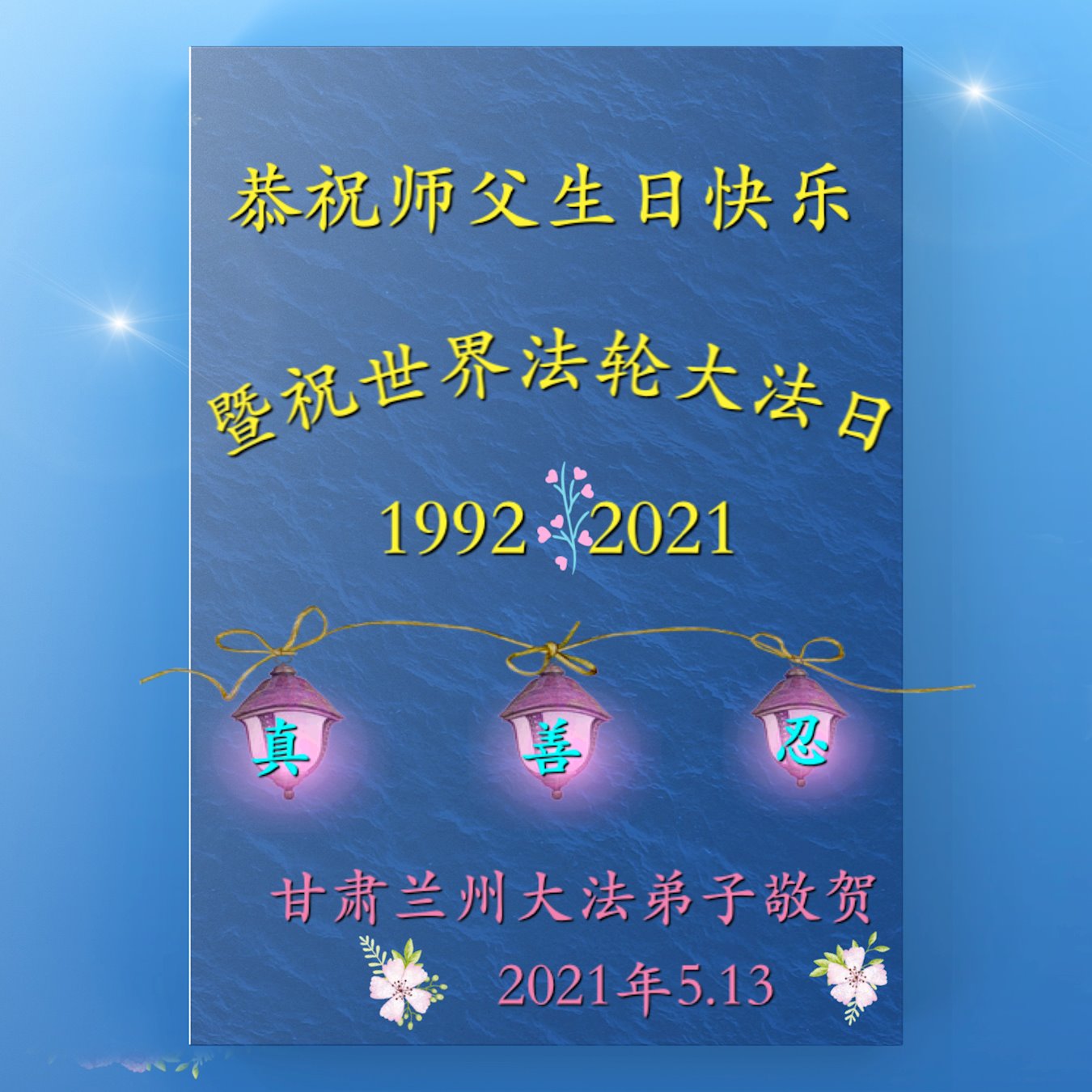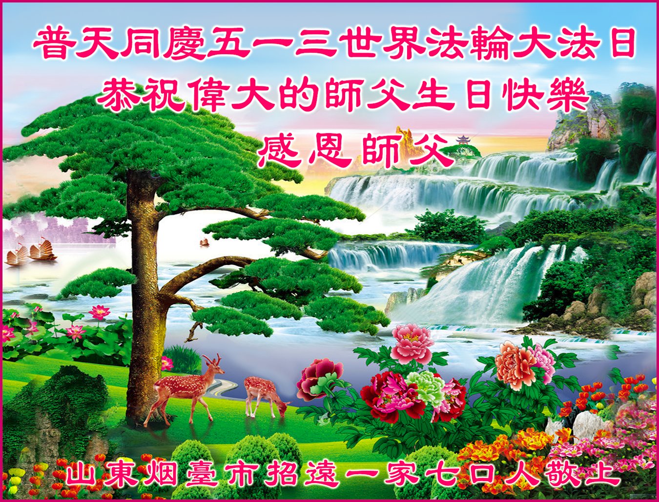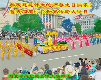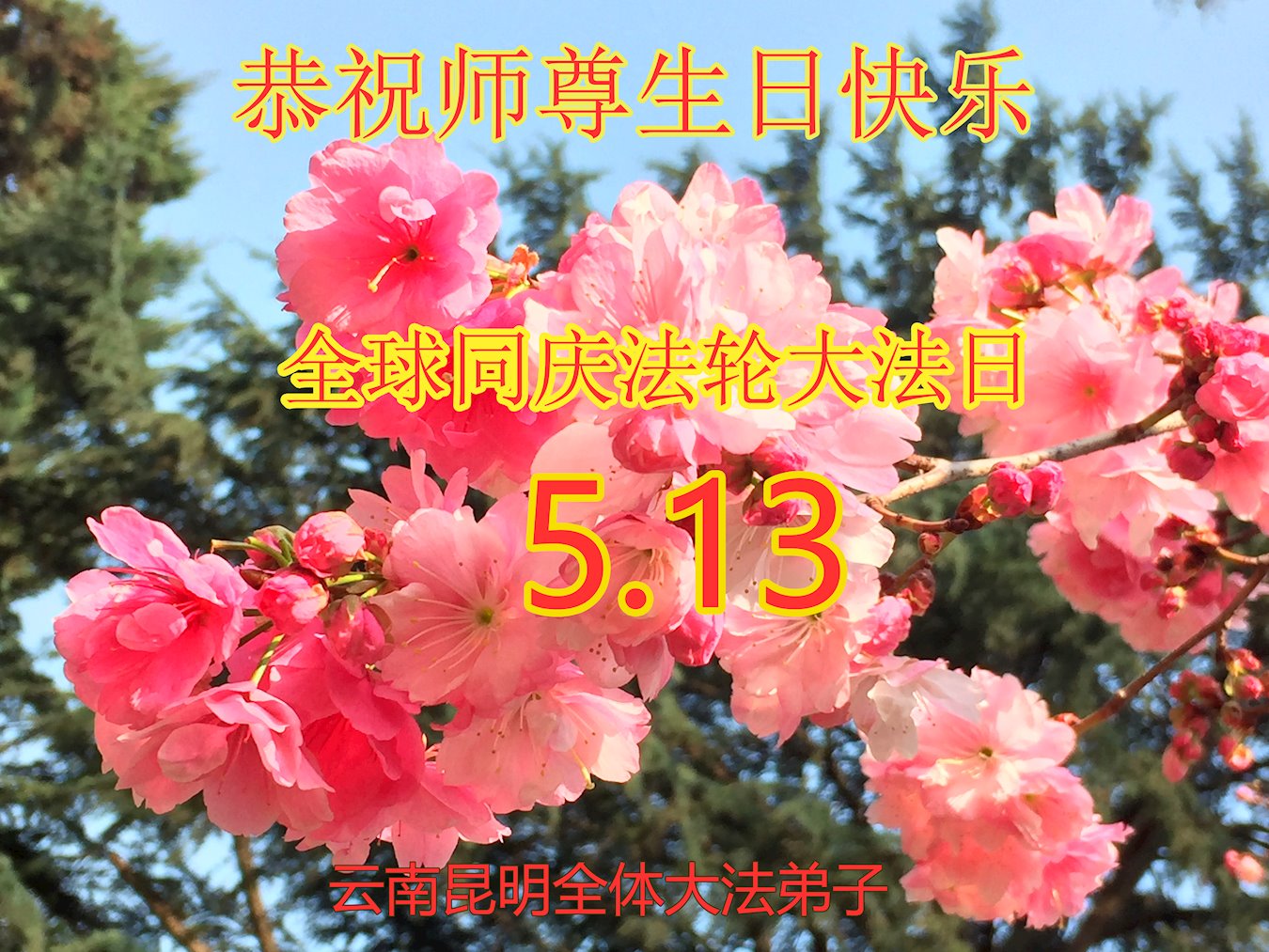 在全世界庆祝“五·一三”法轮大法日之际,我们全家人满怀喜悦庆贺法轮大法洪传世界这个特殊的日子!感恩大法师父救度之恩!恭祝师父生日快乐!