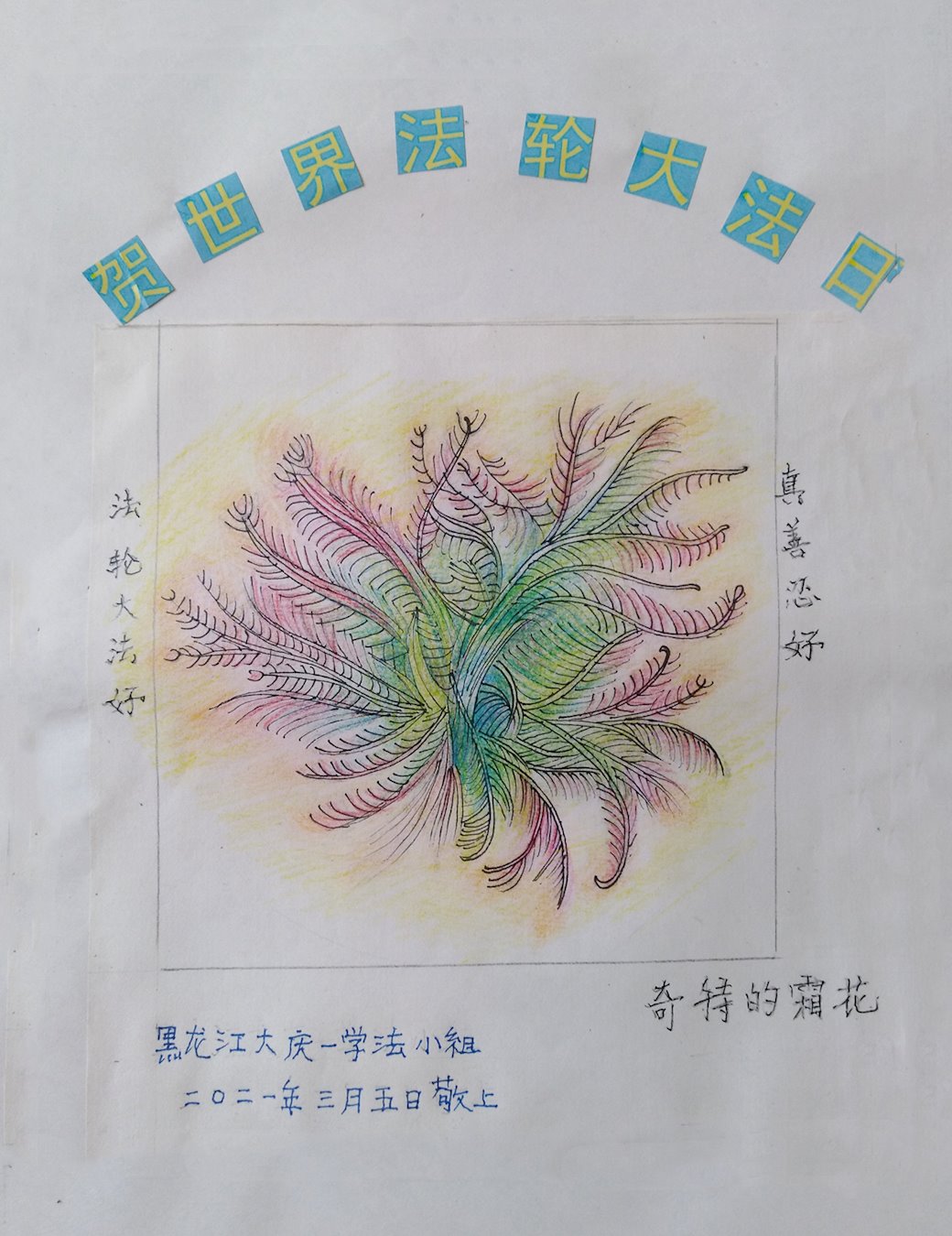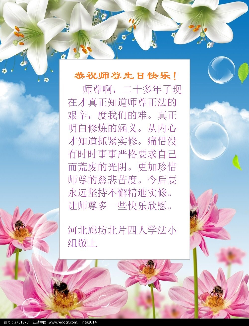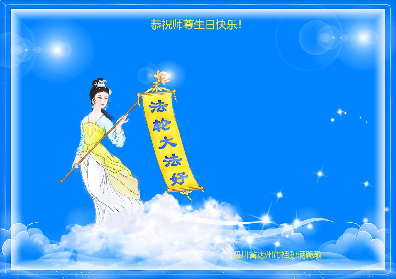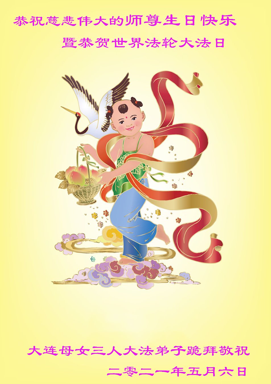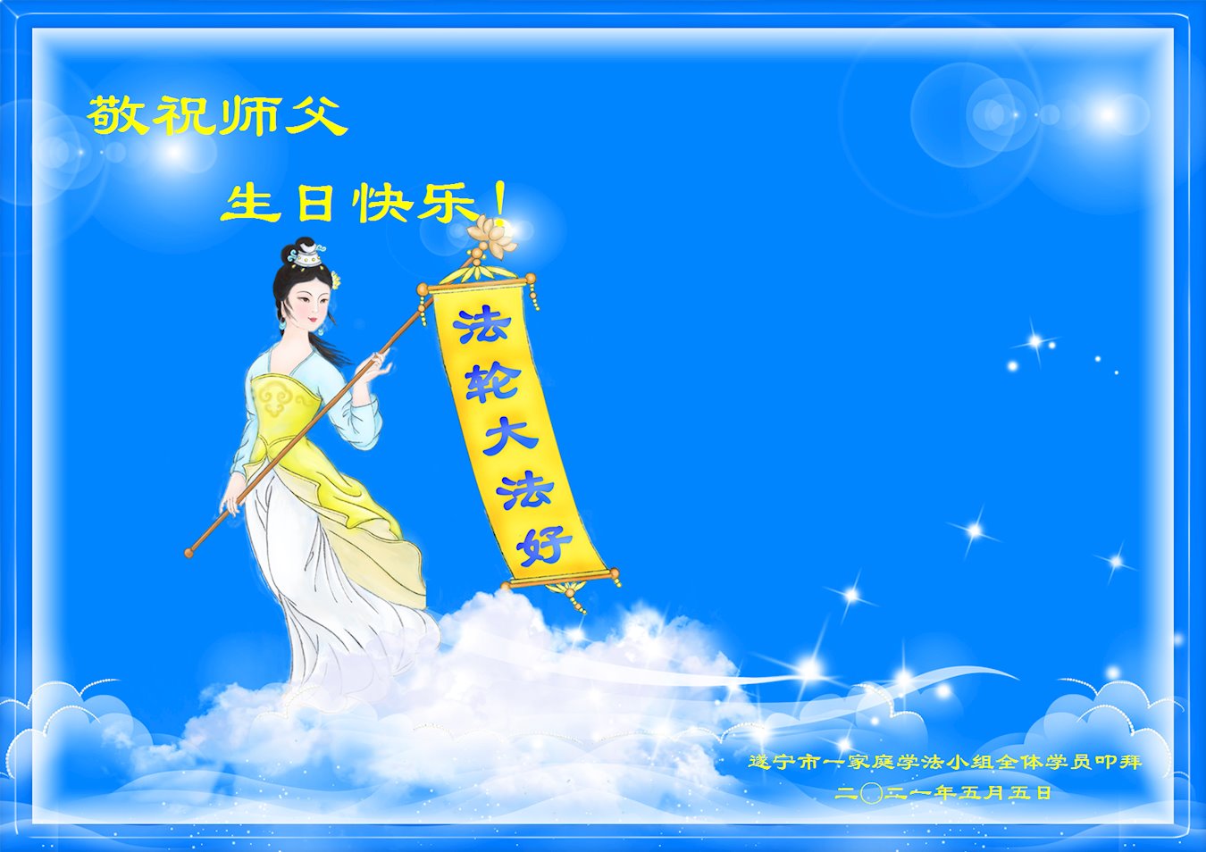 我是一个得法很晚的新学员。新学员祝师尊生日快乐!请师尊放心,我会用我很虔诚的一颗心把三件事做好,我会好好修炼,成为师尊的真修弟子,跟师尊回到我真正的家园。
