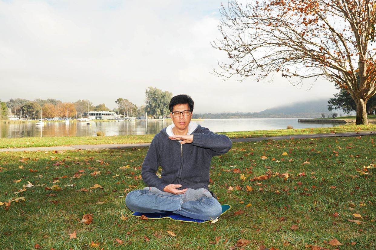 图3:堪培拉学员李健荣在公园炼法轮功第五套功法——神通加持法。