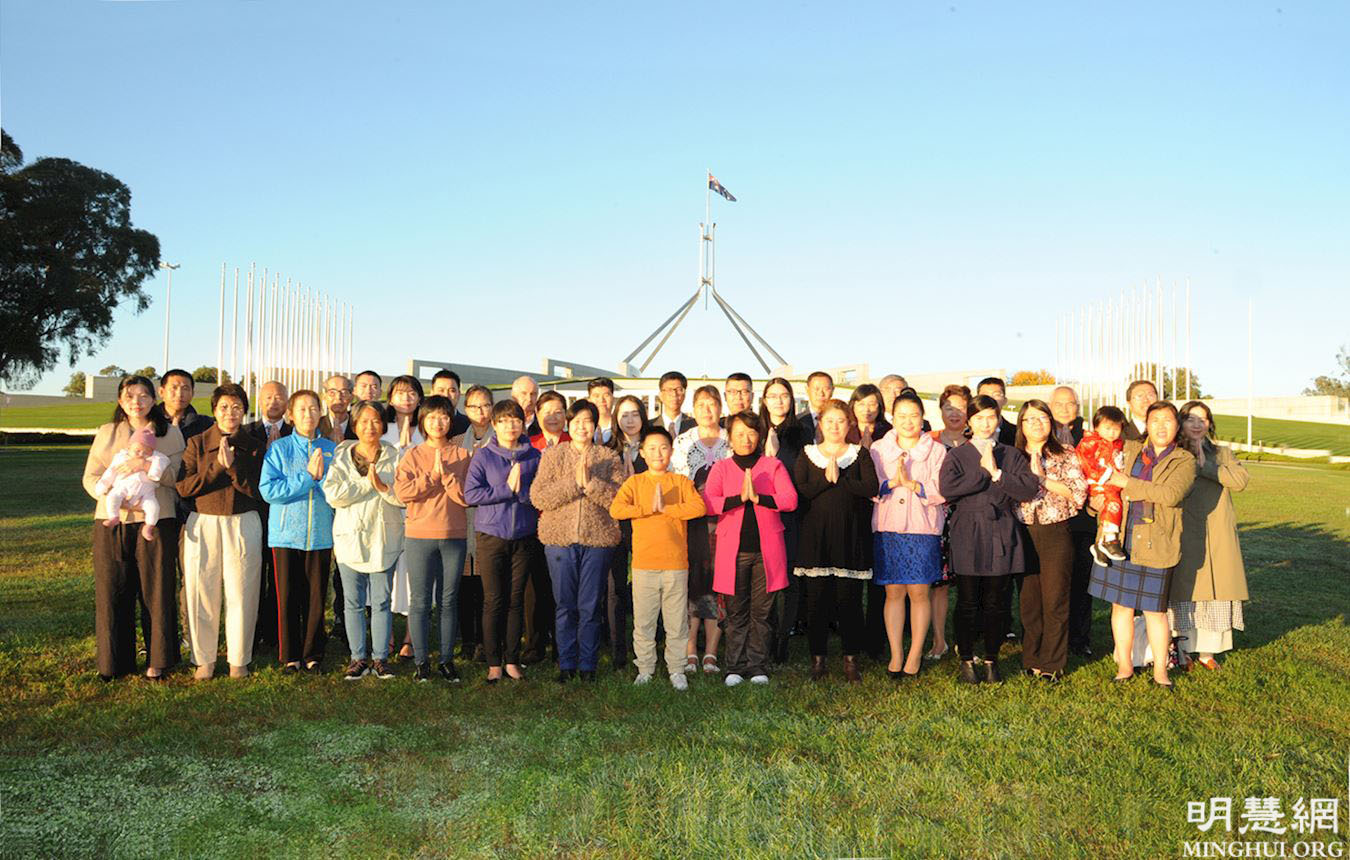 图1:堪培拉法轮功学员在澳洲国会大夏前,恭祝师尊生日快乐!