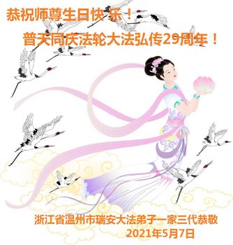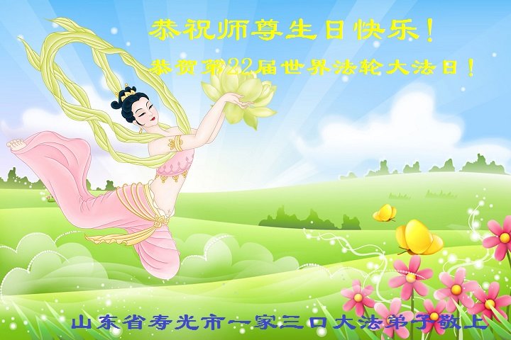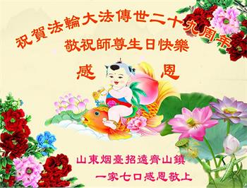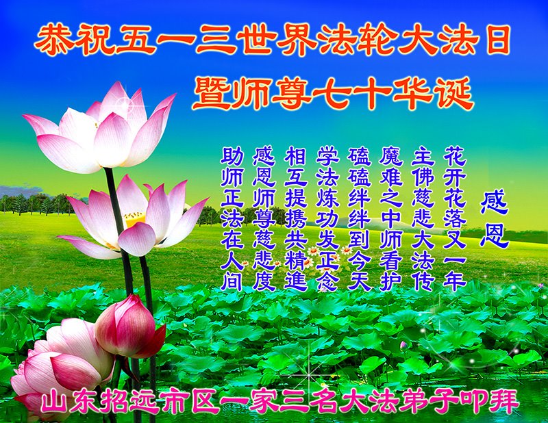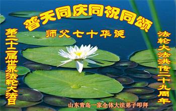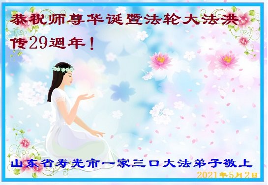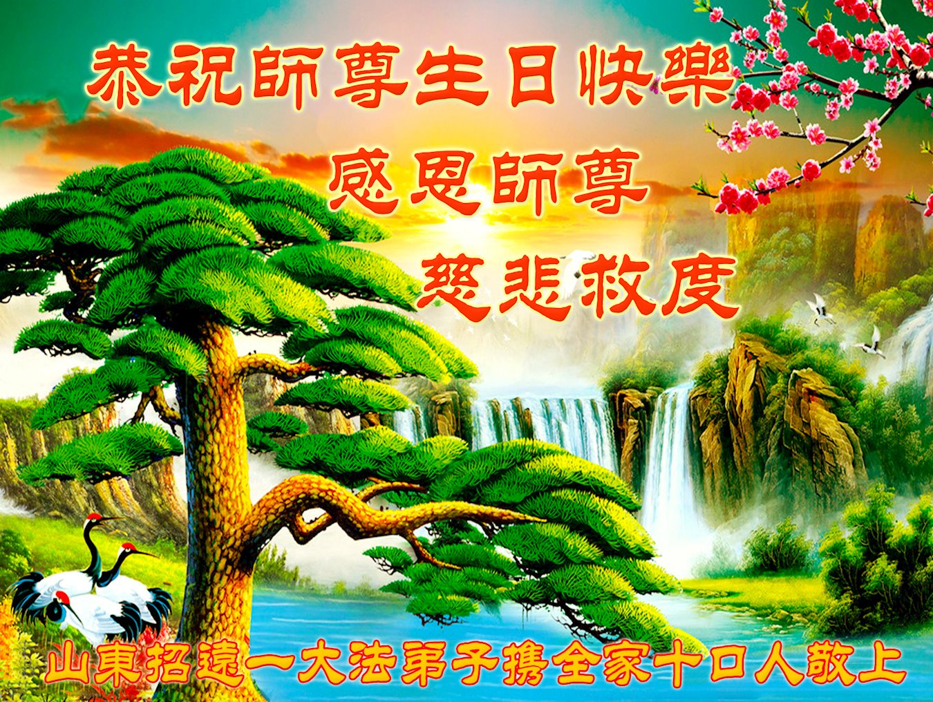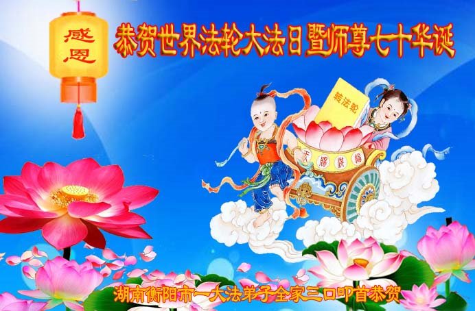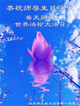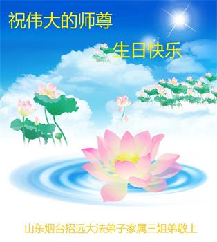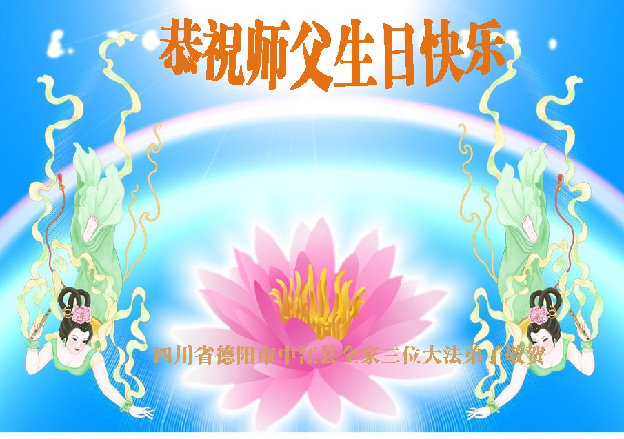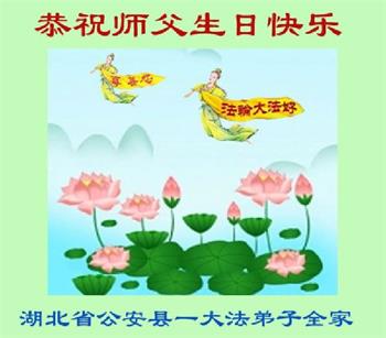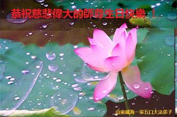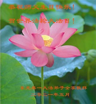感谢师父的救命之恩,我原来患有血小板减少,碰一下身上就会紫一块、颈椎病、哮喘病、胃病等痛苦不堪。98年得法炼功后,不久,所有症状都没有了,走路上楼跟有人推我一样。谢谢师父给了我第二次生命,我的家人也得到师父的保护。弟子唯有努力做好三件事,不辜负师父的慈悲苦度。我们全家人恭祝慈悲伟大的师父生日快乐!