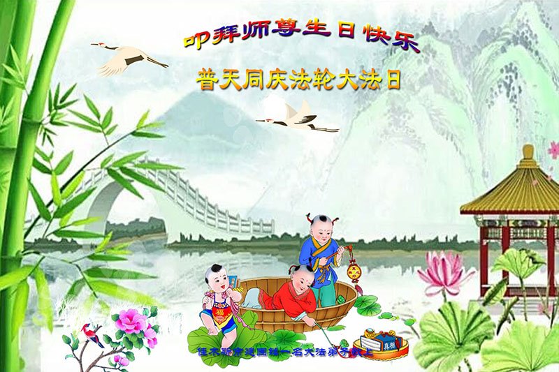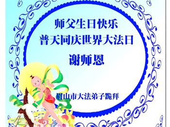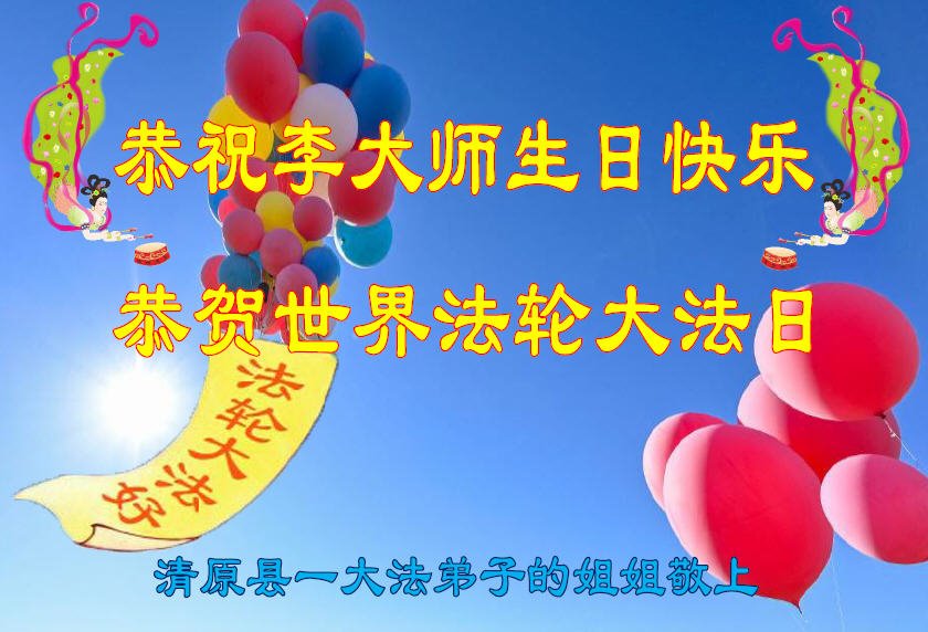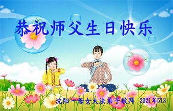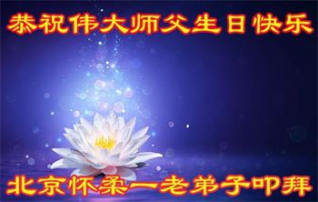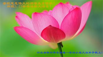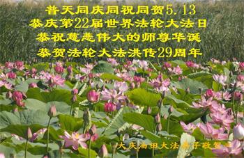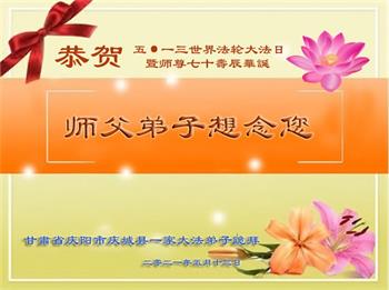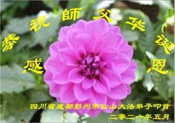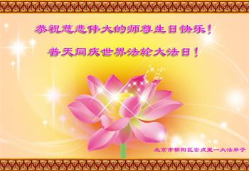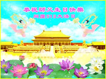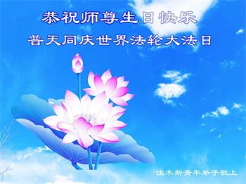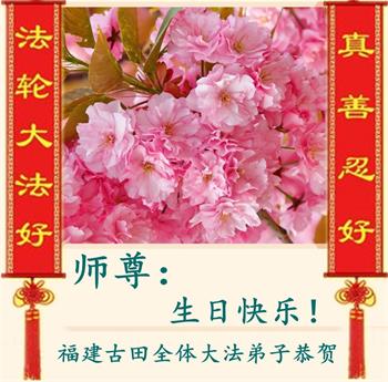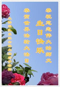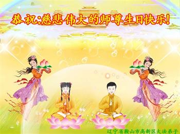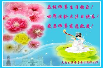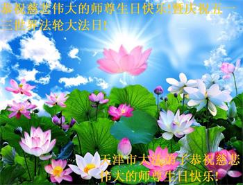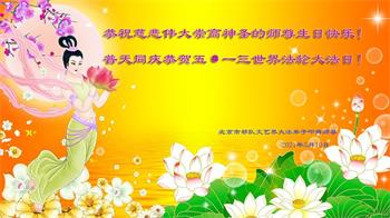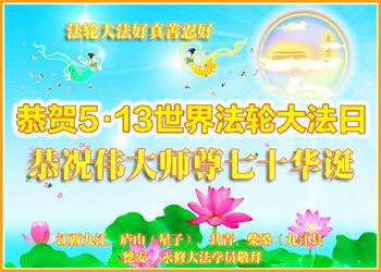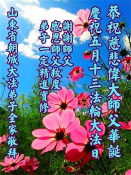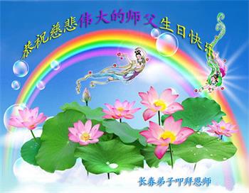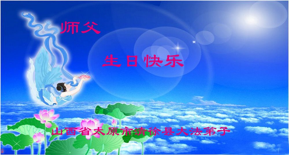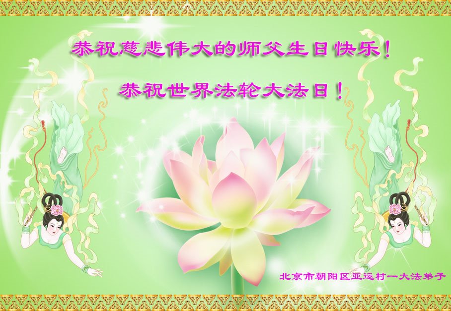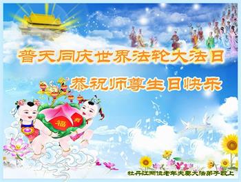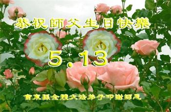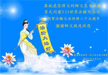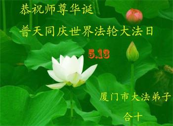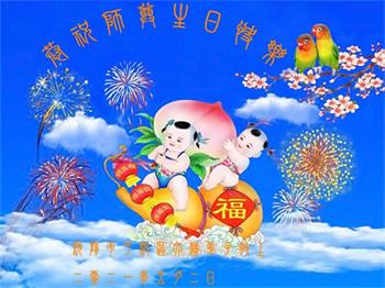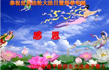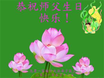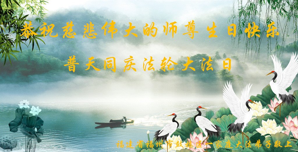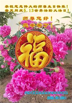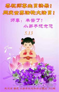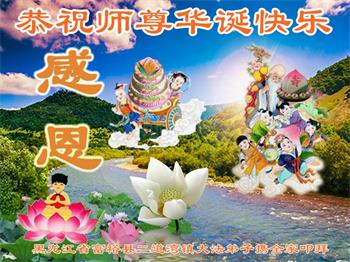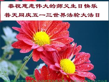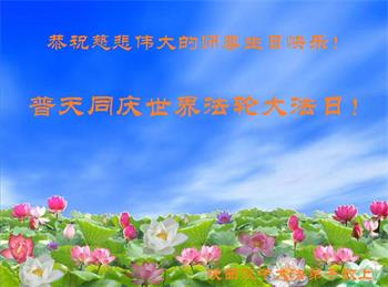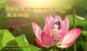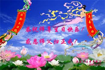 福建省福州市一大法弟子在贺词中说:“弟子双手合十,发自心底的恭祝慈悲伟大的师父华诞!每当5·13这辉煌的日子到来之际,弟子内心都充满对师父的无比感恩和思念。是师父把我脱胎换骨,重塑成一个全新的真我。”