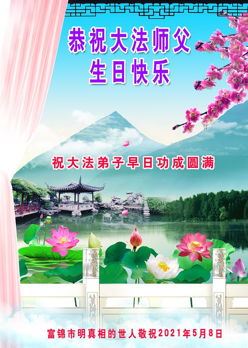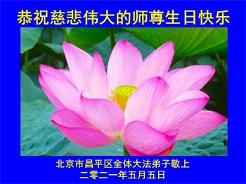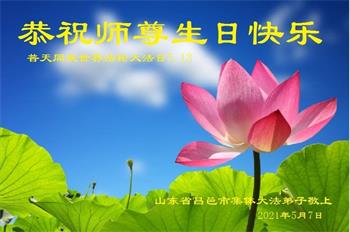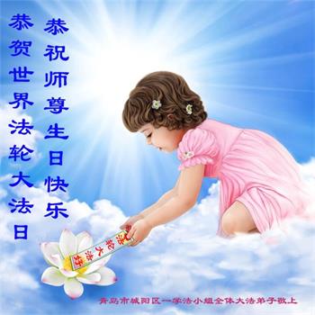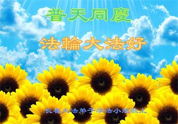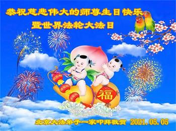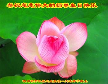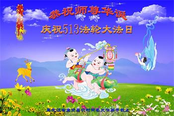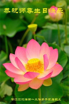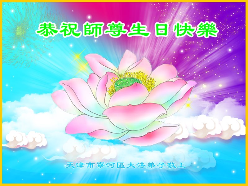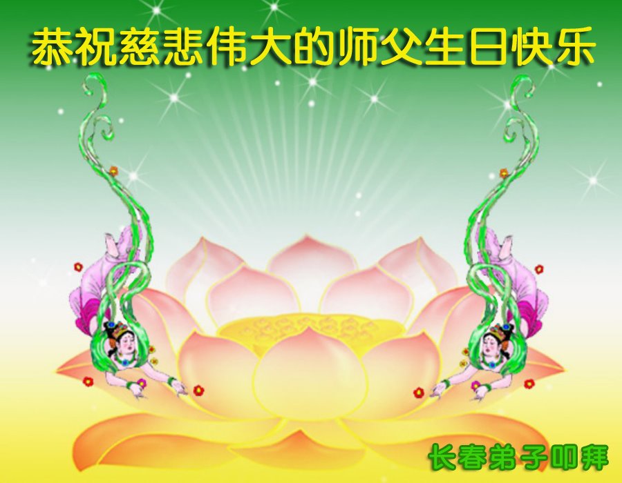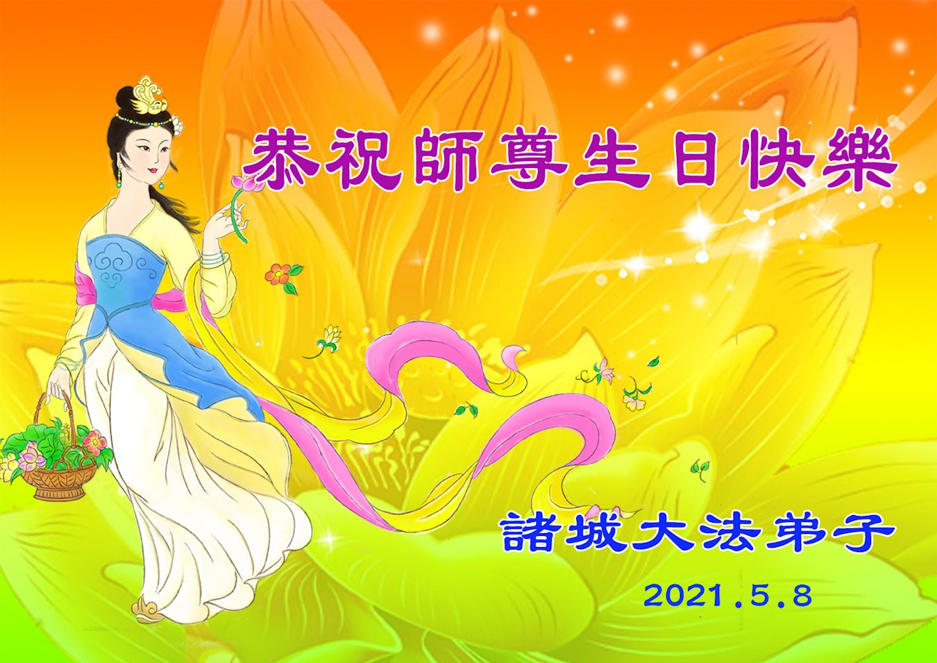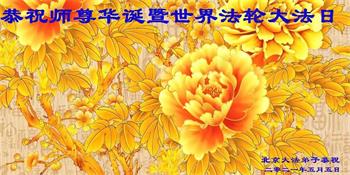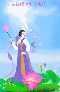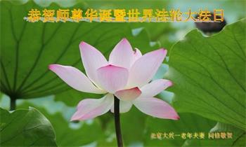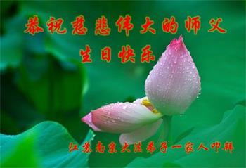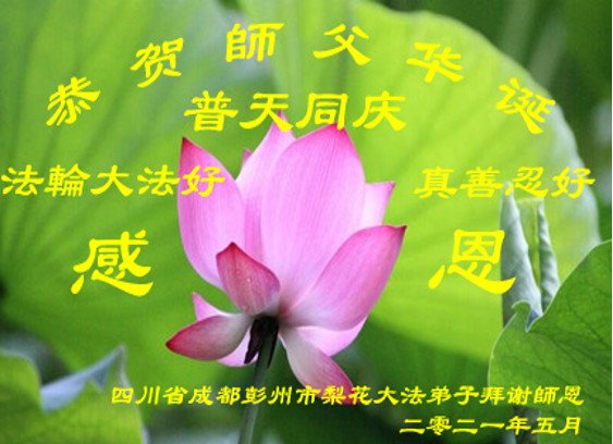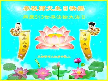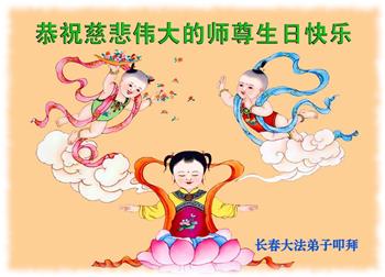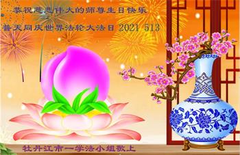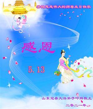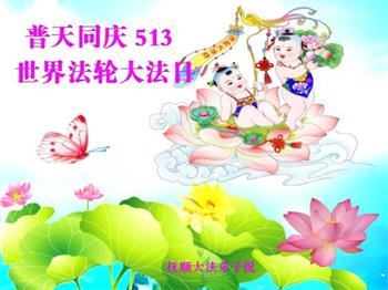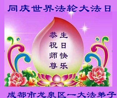 福建省福州市一大法弟子在贺词中说:“弟子双手合十,发自心底的恭祝慈悲伟大的师父华诞!每当5·13这辉煌的日子到来之际,弟子内心都充满对师父的无比感恩和思念。是师父把我脱胎换骨,重塑成一个全新的真我。”