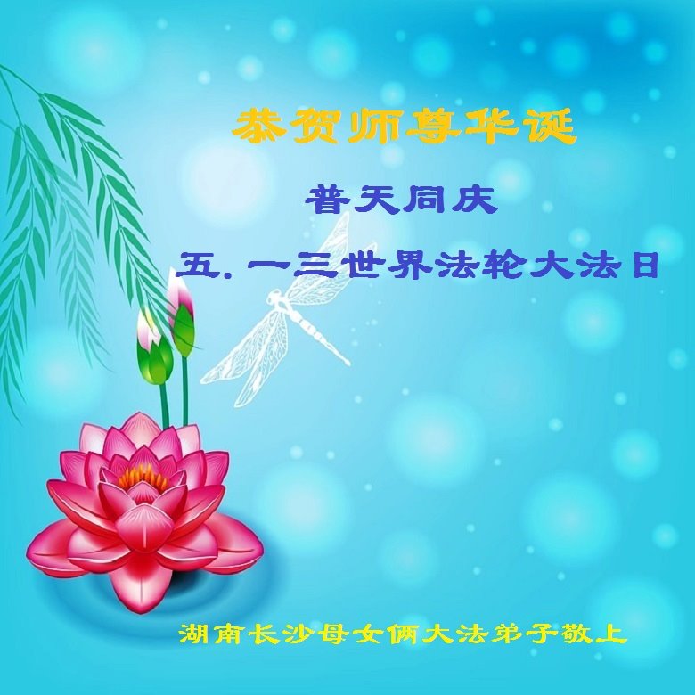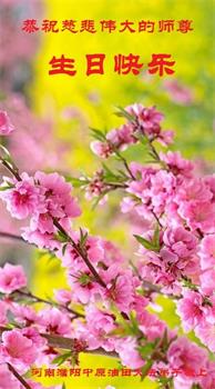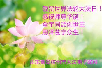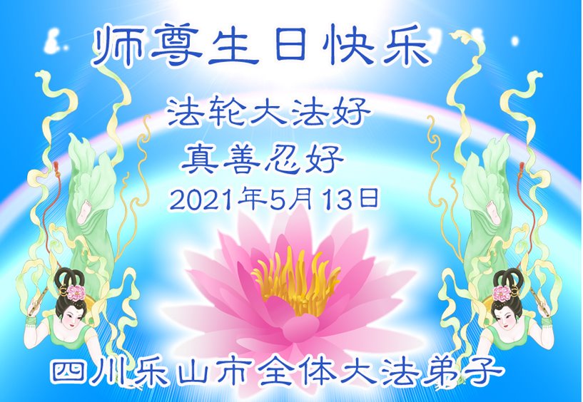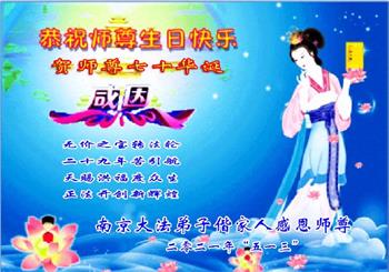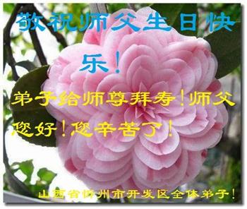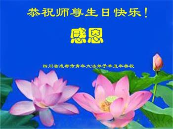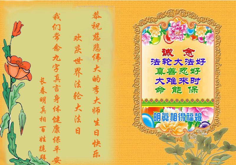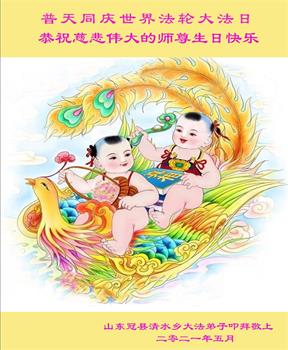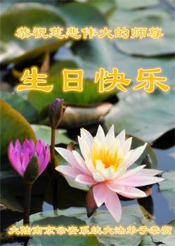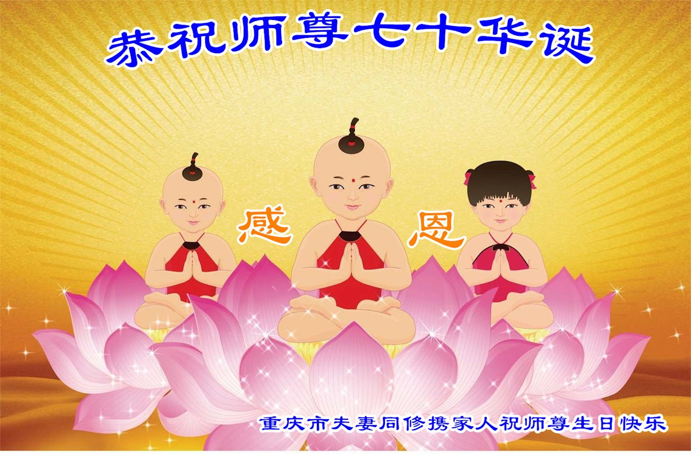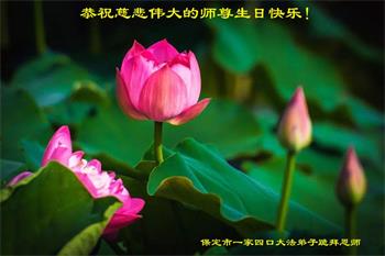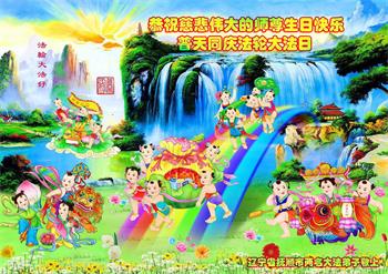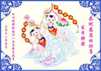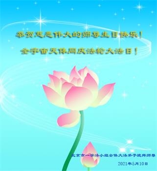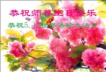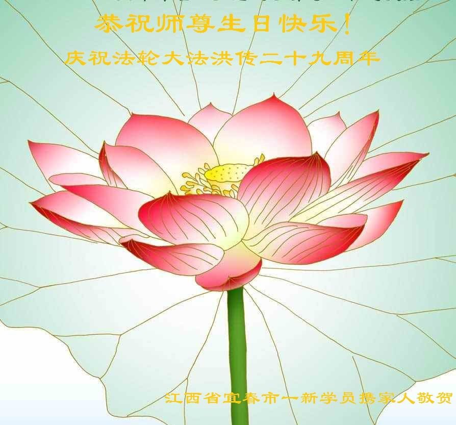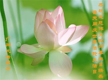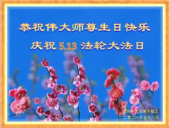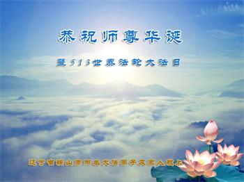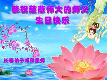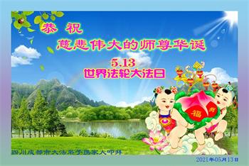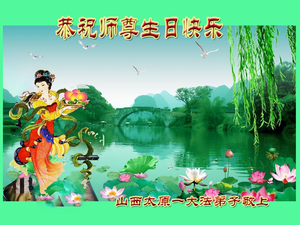 福建省福州市一大法弟子在贺词中说:“弟子双手合十,发自心底的恭祝慈悲伟大的师父华诞!每当5·13这辉煌的日子到来之际,弟子内心都充满对师父的无比感恩和思念。是师父把我脱胎换骨,重塑成一个全新的真我。”