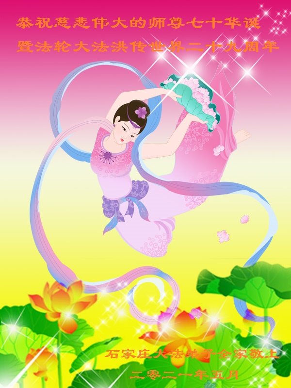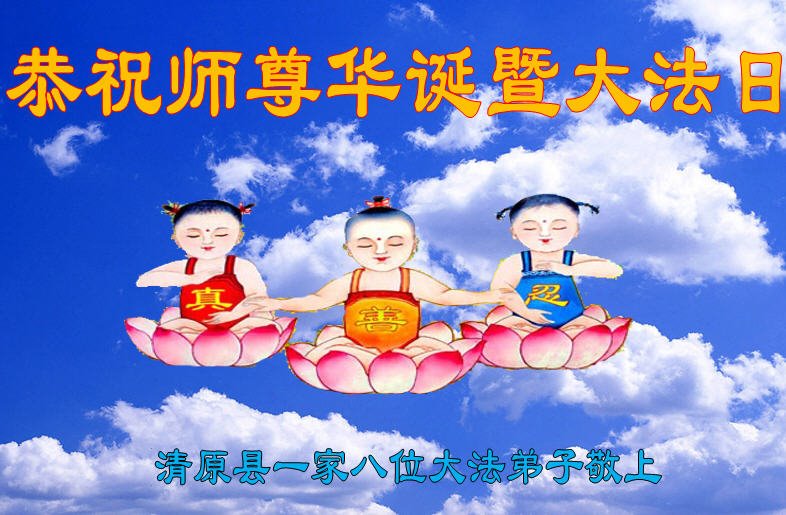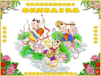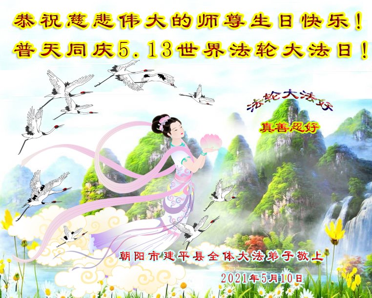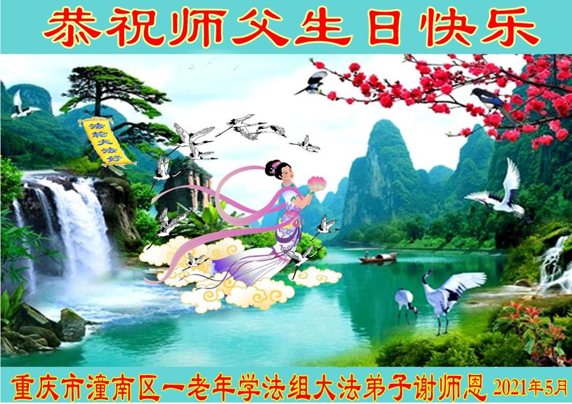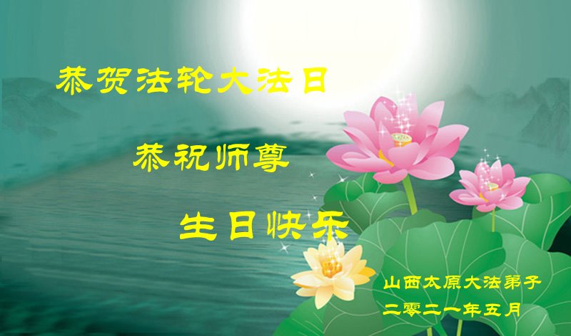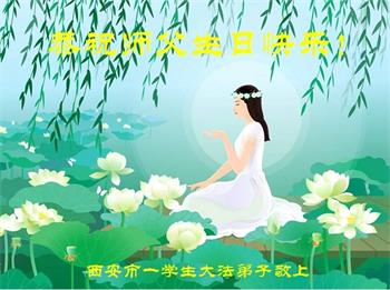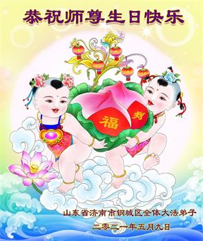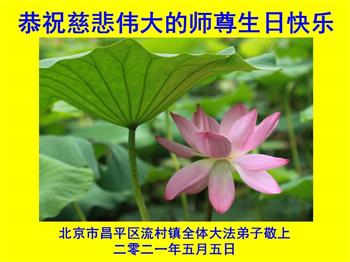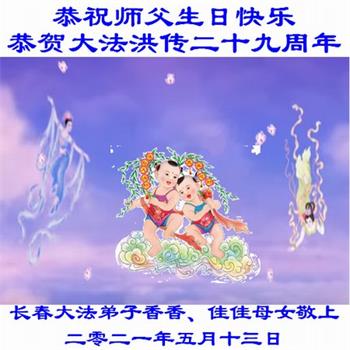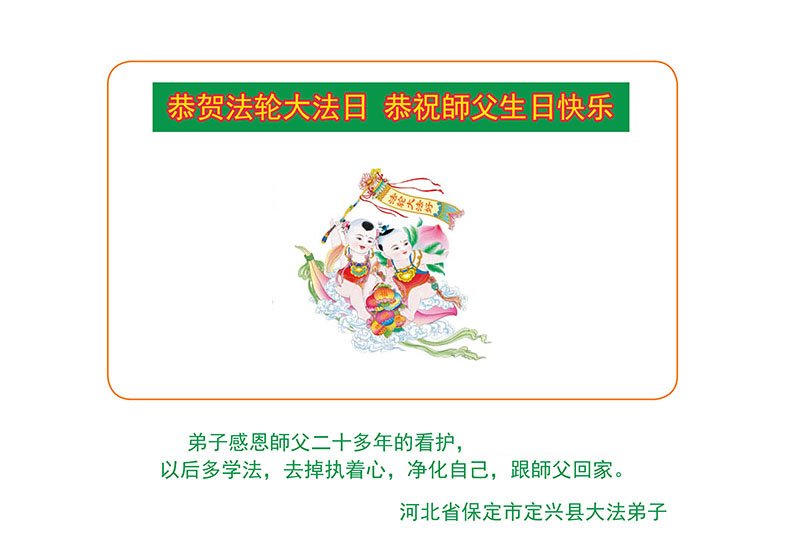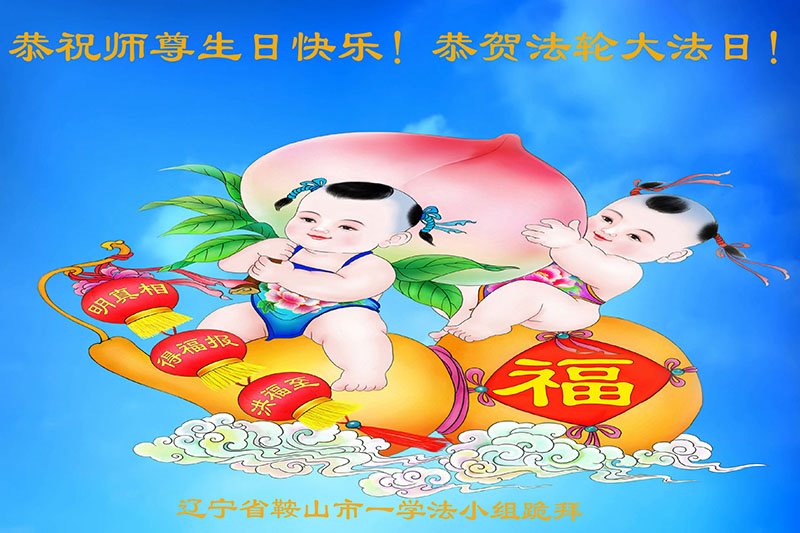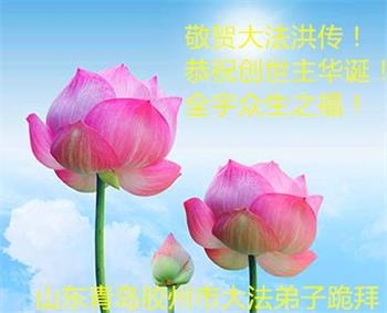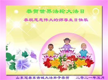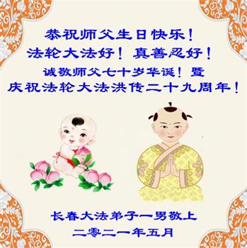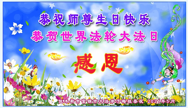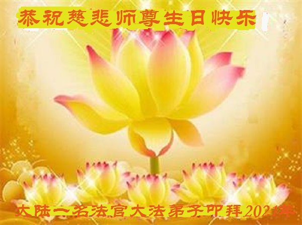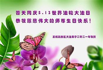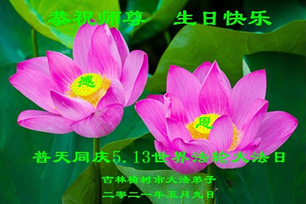 福建省福州市一大法弟子在贺词中说:“弟子双手合十,发自心底的恭祝慈悲伟大的师父华诞!每当5·13这辉煌的日子到来之际,弟子内心都充满对师父的无比感恩和思念。是师父把我脱胎换骨,重塑成一个全新的真我。”