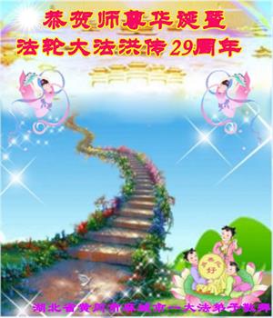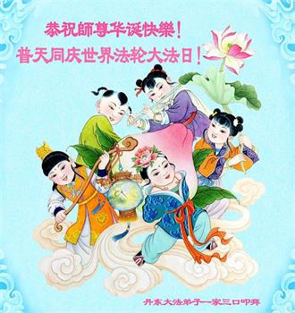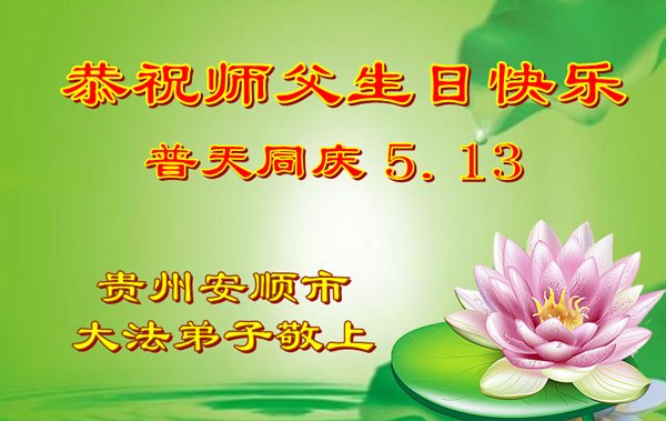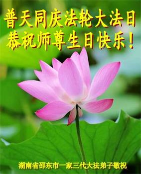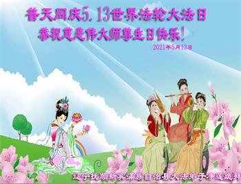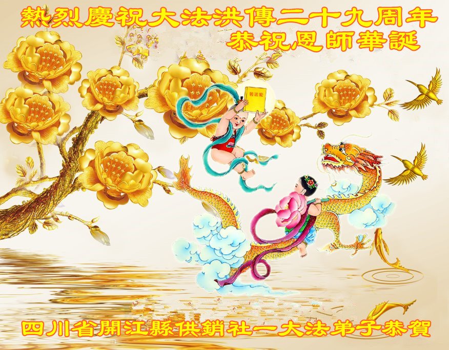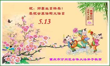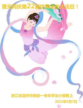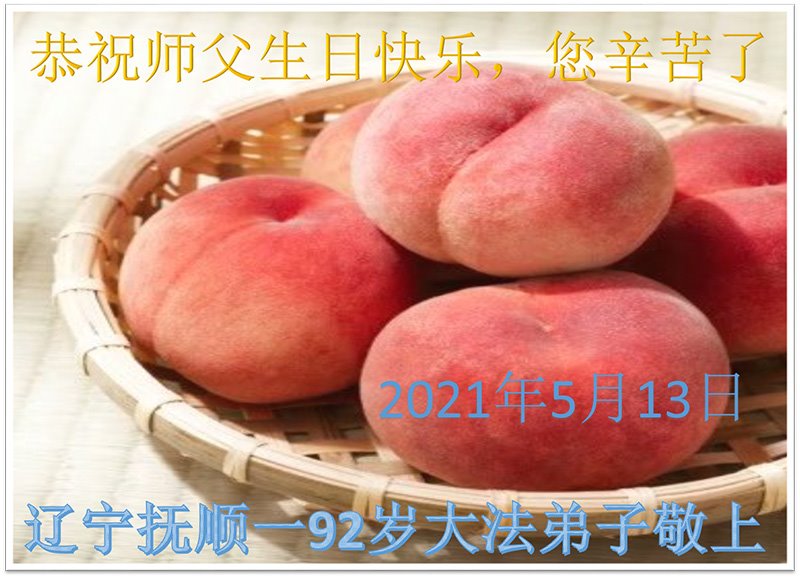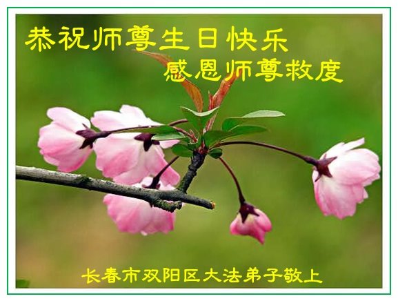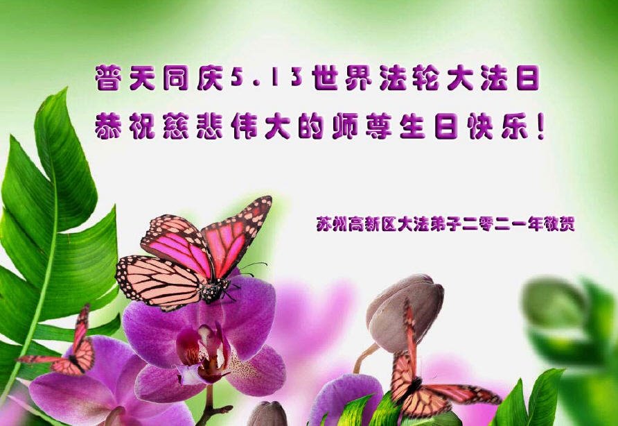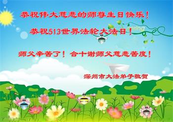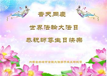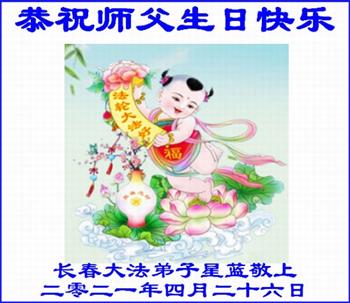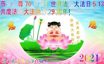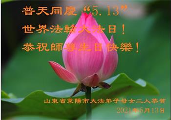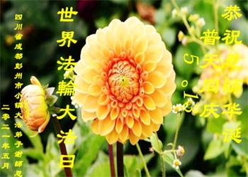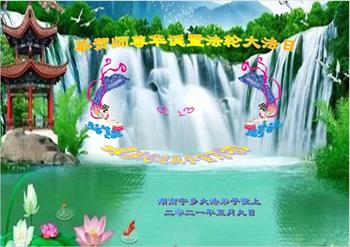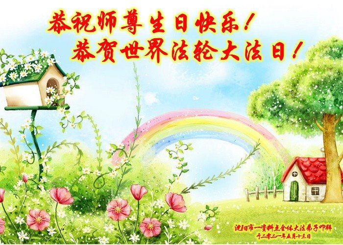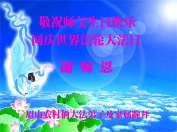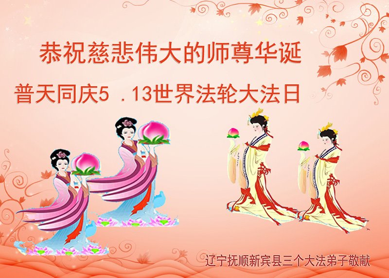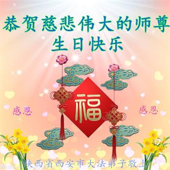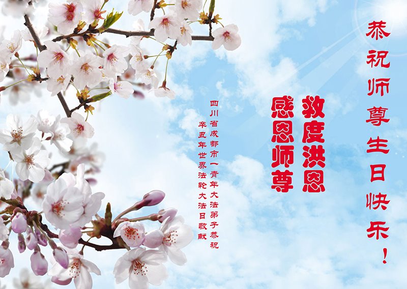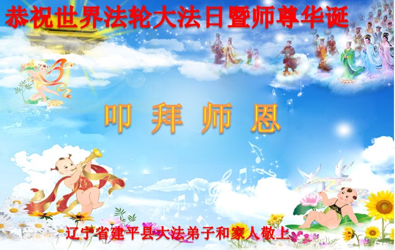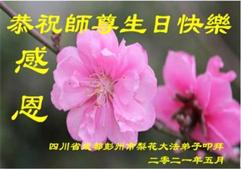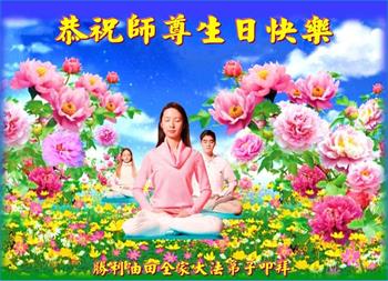 福建省福州市一大法弟子在贺词中说:“弟子双手合十,发自心底的恭祝慈悲伟大的师父华诞!每当5·13这辉煌的日子到来之际,弟子内心都充满对师父的无比感恩和思念。是师父把我脱胎换骨,重塑成一个全新的真我。”