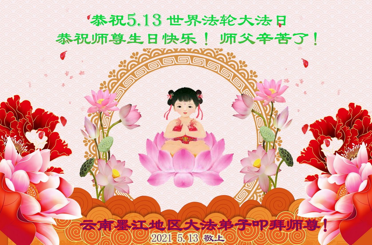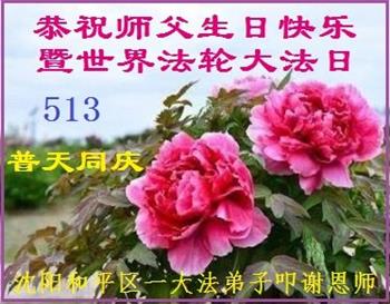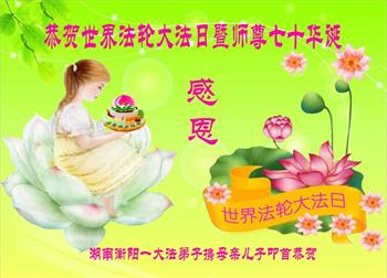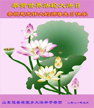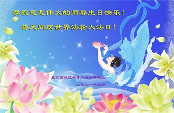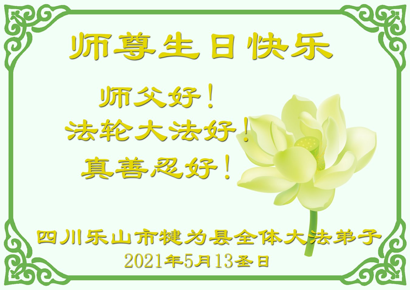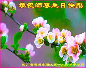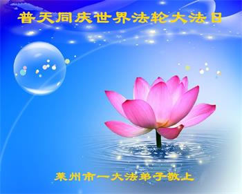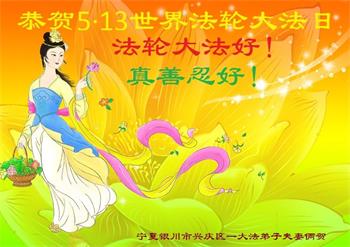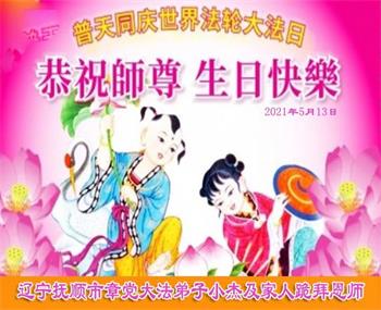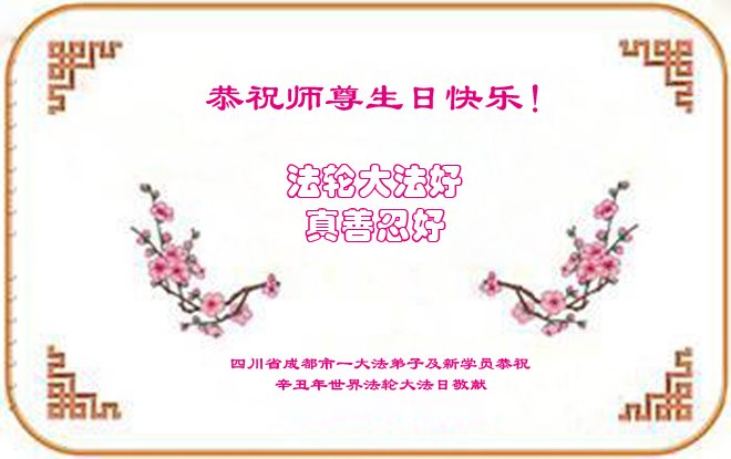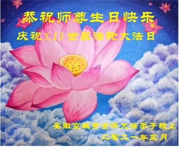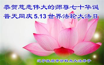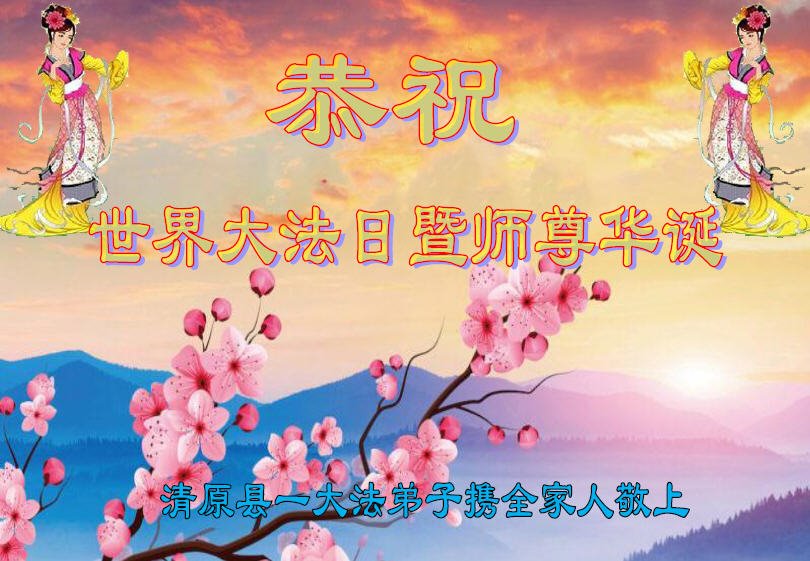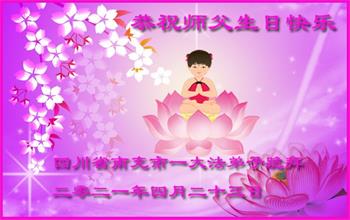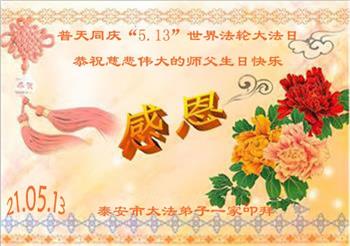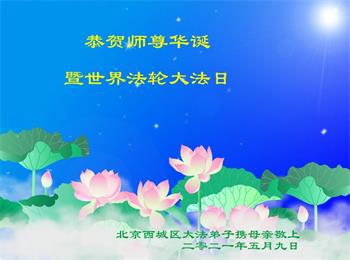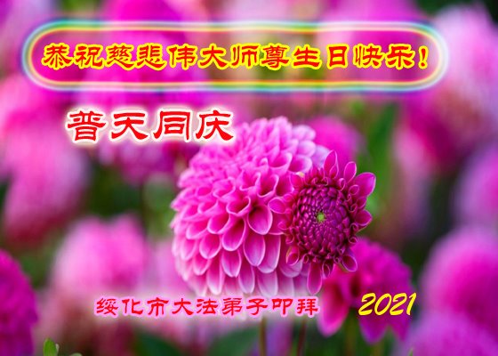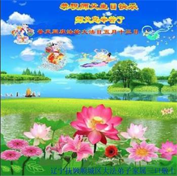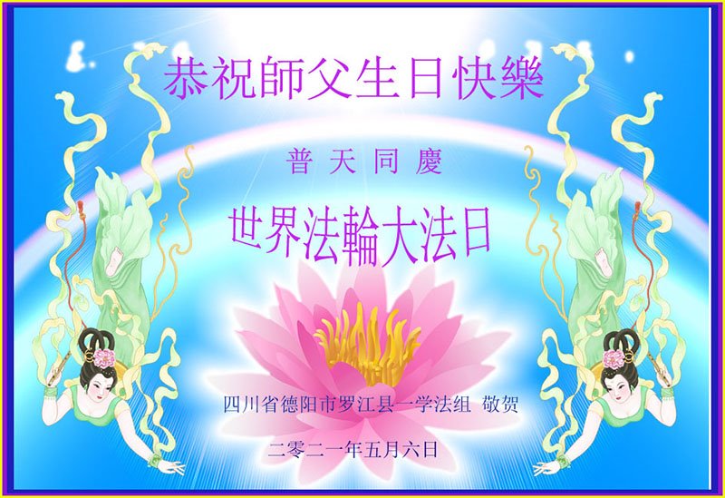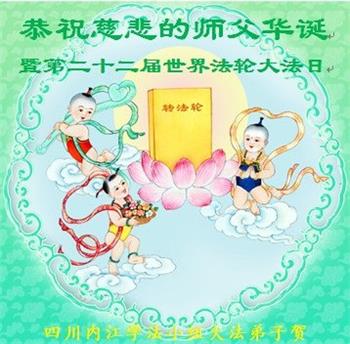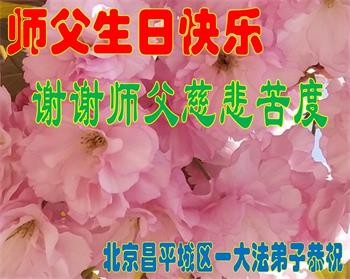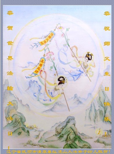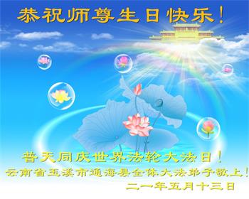 福建省福州市一大法弟子在贺词中说:“弟子双手合十,发自心底的恭祝慈悲伟大的师父华诞!每当5·13这辉煌的日子到来之际,弟子内心都充满对师父的无比感恩和思念。是师父把我脱胎换骨,重塑成一个全新的真我。”