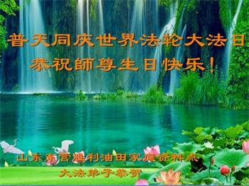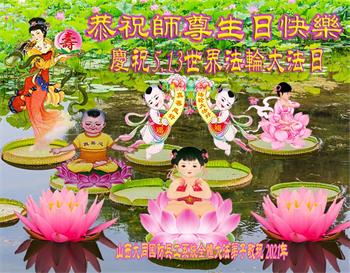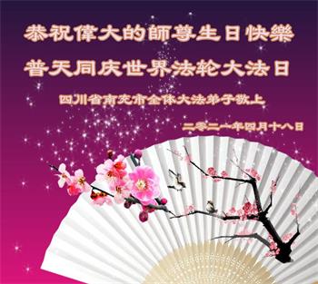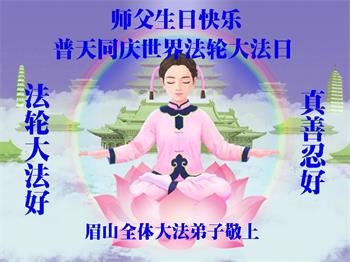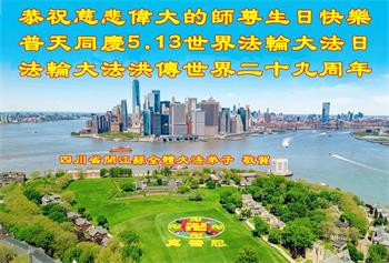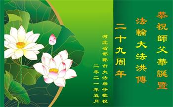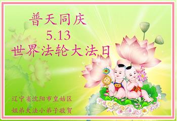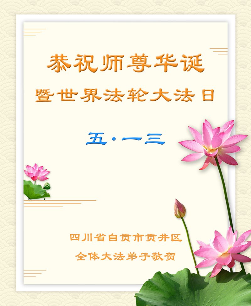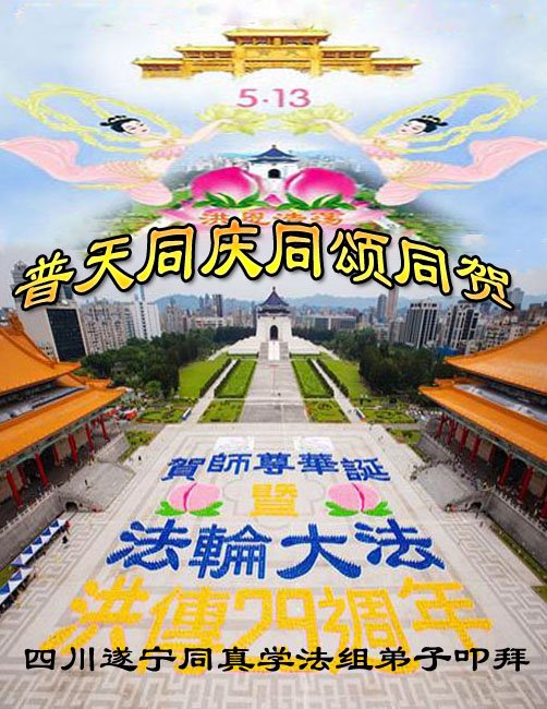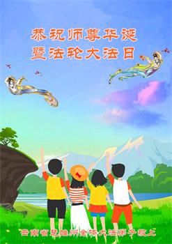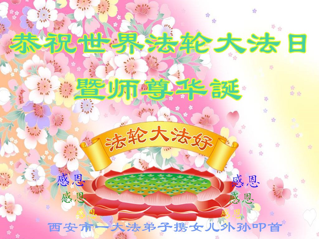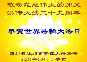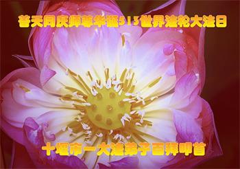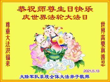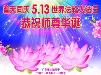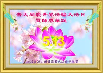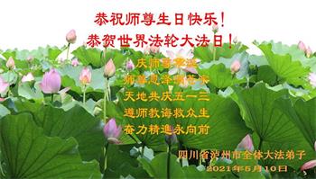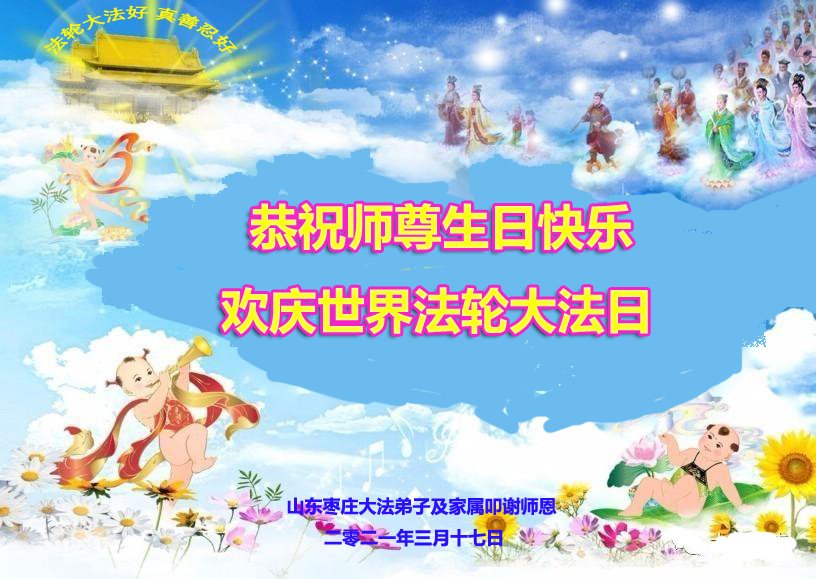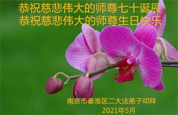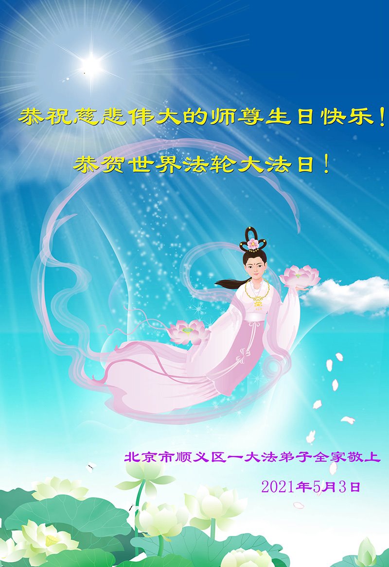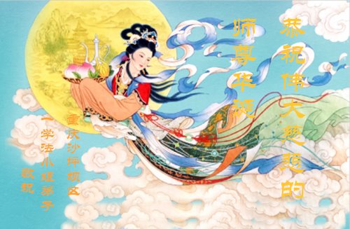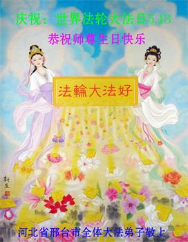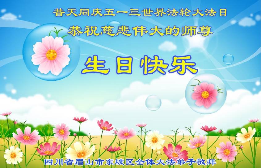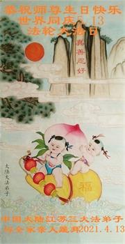 福建省福州市一大法弟子在贺词中说:“弟子双手合十,发自心底的恭祝慈悲伟大的师父华诞!每当5·13这辉煌的日子到来之际,弟子内心都充满对师父的无比感恩和思念。是师父把我脱胎换骨,重塑成一个全新的真我。”