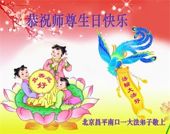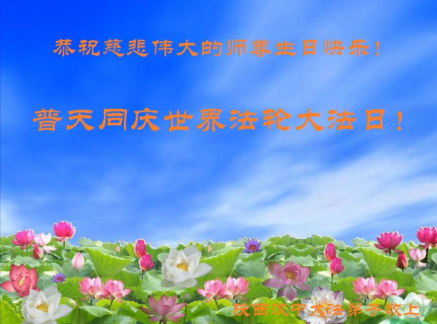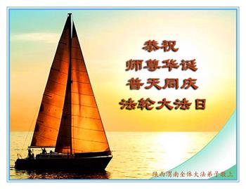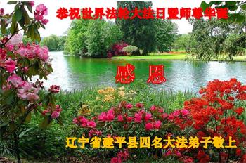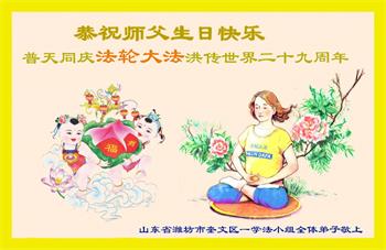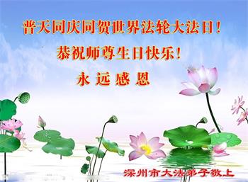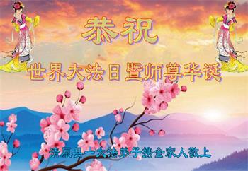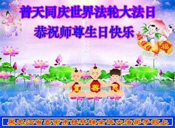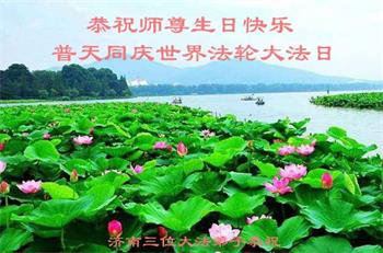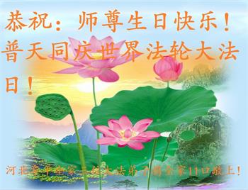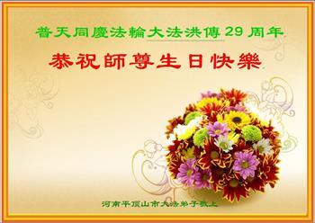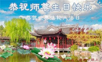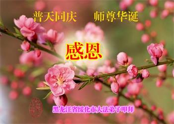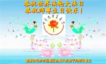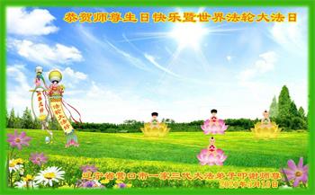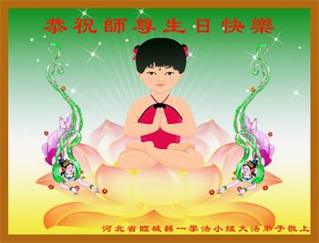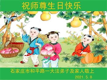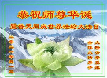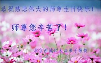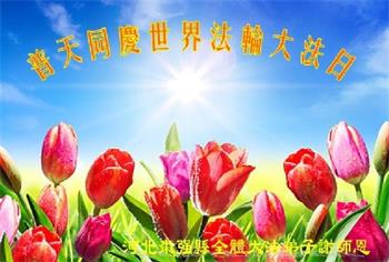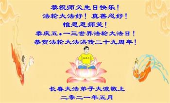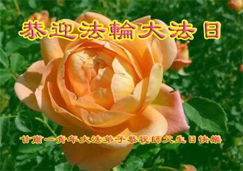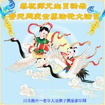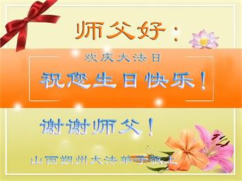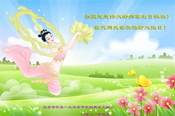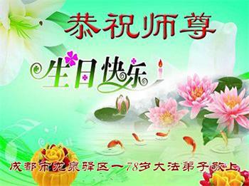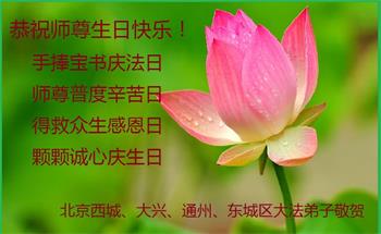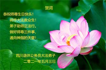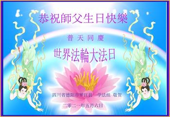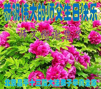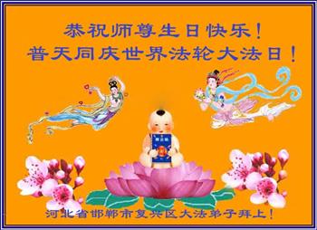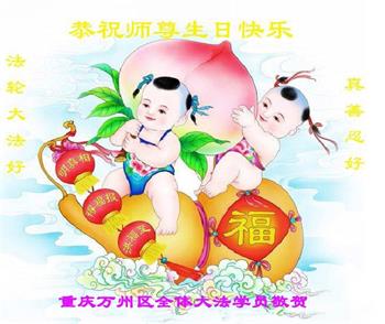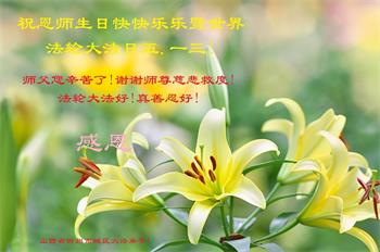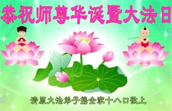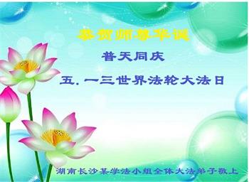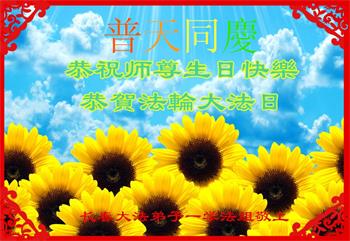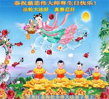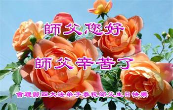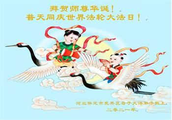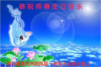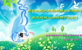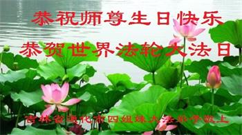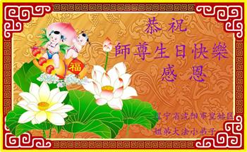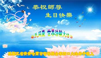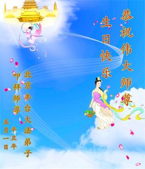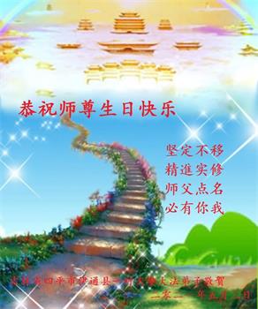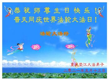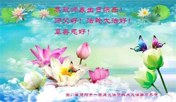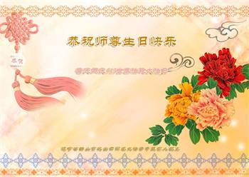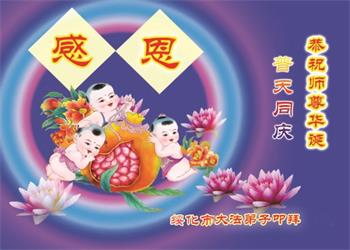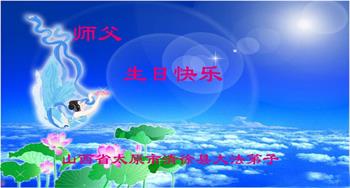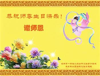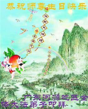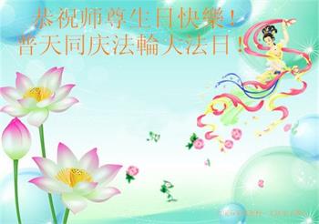 下面是来自北京市、天津市、上海市、重庆市、黑龙江省、吉林省、辽宁省、甘肃省、青海省、河北省、河南省、山东省、安徽省、浙江省、江苏省、江西省、陕西省、山西省、湖北省、湖南省、四川省、贵州省、广东省、云南省、福建省、海南省、新疆维吾尔自治区、内蒙古自治区、广西壮族自治区、宁夏回族自治区的法轮功学员敬致师尊的部份贺词。