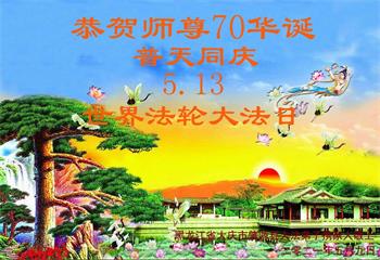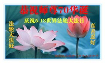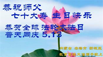 欢天喜地庆师尊七十岁华诞!载歌载舞贺世界法轮大法日!回顾二十二年正法修炼路,魔难重重,惊心动魄。师尊力挽狂澜,破迷导航,救苍宇于危难中。弟子深感法轮大法的珍贵,这是人类得救的唯一希望。藉五月十三日这殊胜的节日,弟子们向慈悲伟大的师尊叩首、跪拜!