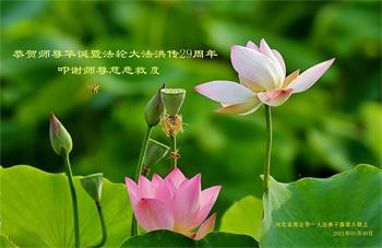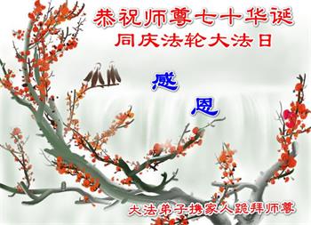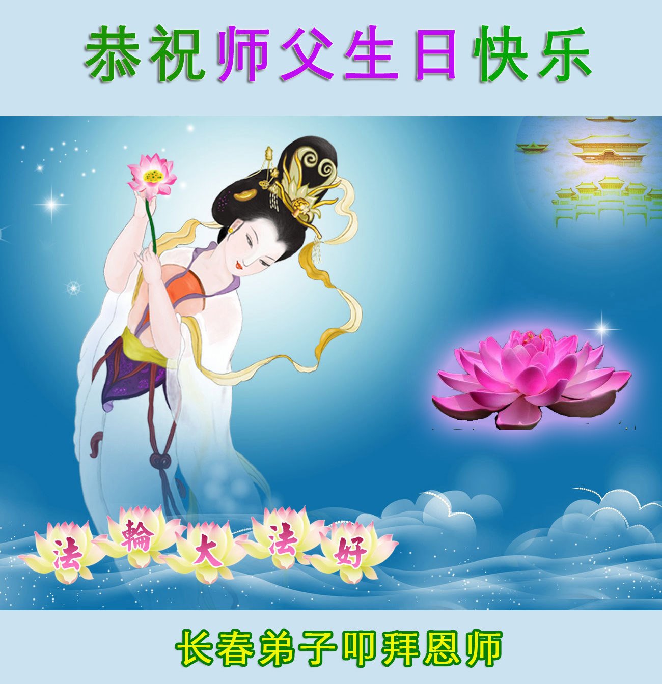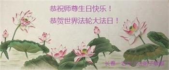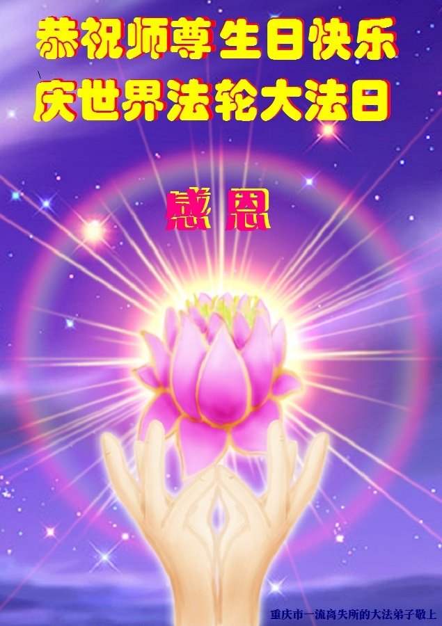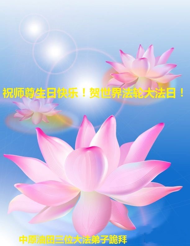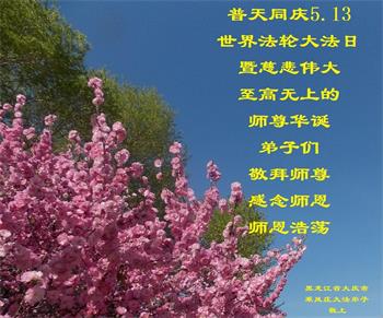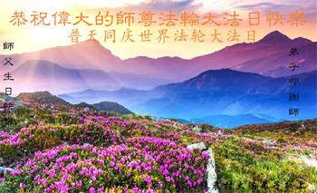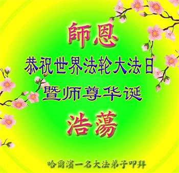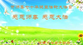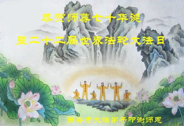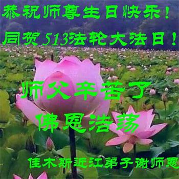 师尊好!师尊辛苦了!今年是伟大慈悲的师尊七十岁华诞,也是法轮大法日。在这普天同庆同颂的伟大光辉日子里,我们怀着无比感恩的心情,热泪泉涌,发自肺腑的一遍又一遍的颂唱着“法轮大法好”、“师恩颂”美好的歌曲,讴歌师尊威德无量、法力无边、叩谢师尊的慈悲苦度!