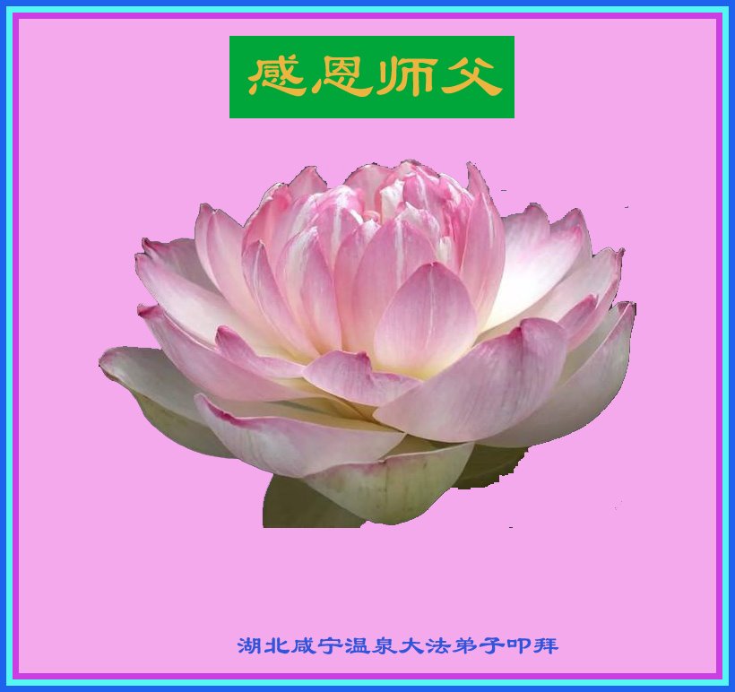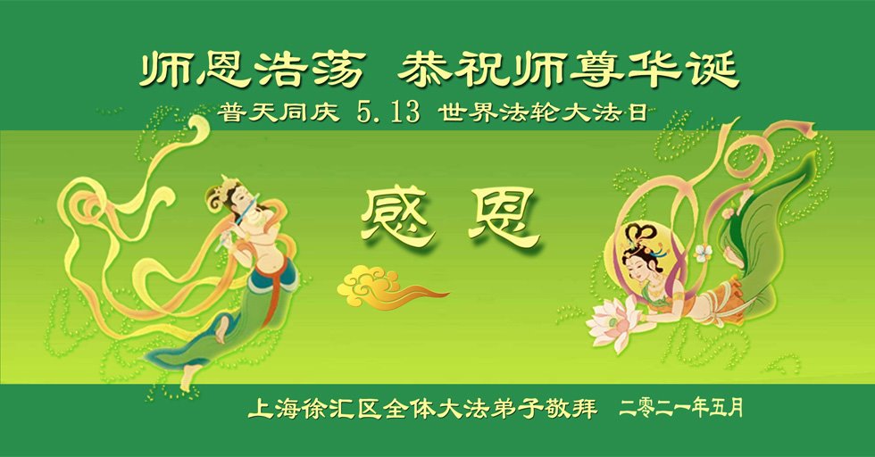感恩师尊带着宇宙大法降临人间,弟子们结上了圣缘。是您的慈悲让我们从无知中苏醒;是您让我们明白了生命的真谛和意义;是您给了我们新的生命,将我们救度。我们如山的罪业,是您为我们担起;是您造就了我们无私的心灵;是您的慈悲带我们破除一个又一个魔难;是您把这万古不遇的宇宙大法撒遍天地人间;是您带着众生走向未来,使大法的光辉永远照耀在苍宇人间,使苍宇永固。