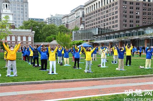 【明慧网二零二一年五月十二日】二零二一年五月八日,美国大费城地区部份法轮功学员,在美国国家独立历史公园的费城自由钟广场集会,庆祝五月十三日世界法轮大法日,暨法轮功创始人李洪志大师的七十华诞。