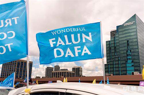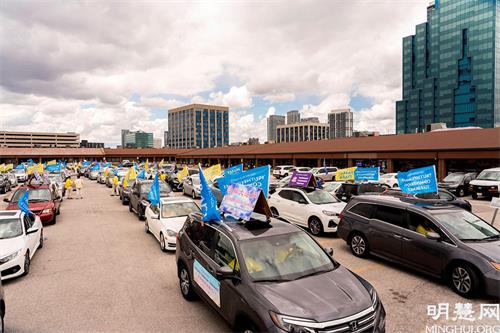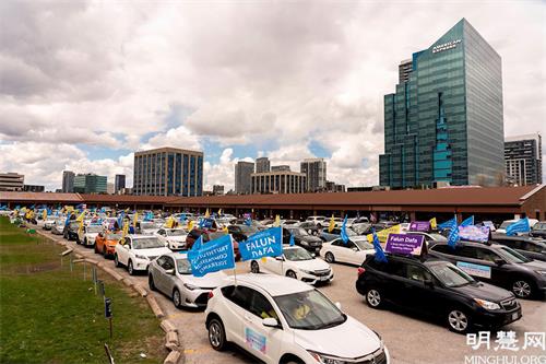 【明慧网二零二一年五月十二日】(明慧记者章韵多伦多报道)二零二一年五月十三日,是法轮大法弘传世界二十九周年暨第二十二届世界法轮大法日。在疫情的特殊情况下,五月八日,多伦多法轮功学员用汽车游行的形式庆祝这个日子。120多辆车的车队,在大多伦多地区和密西沙加市绕城行驶,车上飘着大法日的旗帜,沿途很多人按喇叭和竖大拇指表示赞赏。