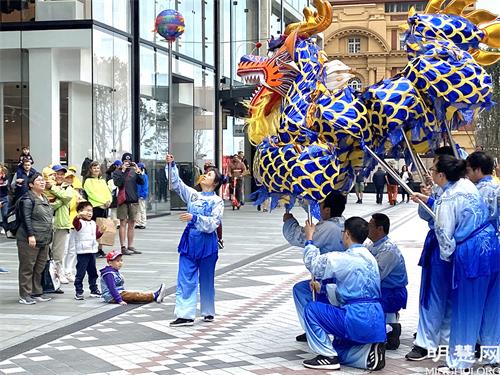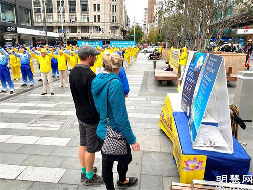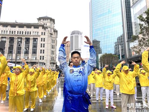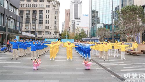 【明慧网二零二一年五月十二日】(明慧新西兰记者站报道)二零二一年五月八日星期六,新西兰奥克兰法轮功学员们在市中心伊丽莎白广场,庆祝五一三世界法轮大法日。法轮功学员组成的天国乐团、舞龙队、腰鼓队的表演吸引了很多路人观看,祥和的集体炼功场面更是吸引了不少人主动来了解法轮功。