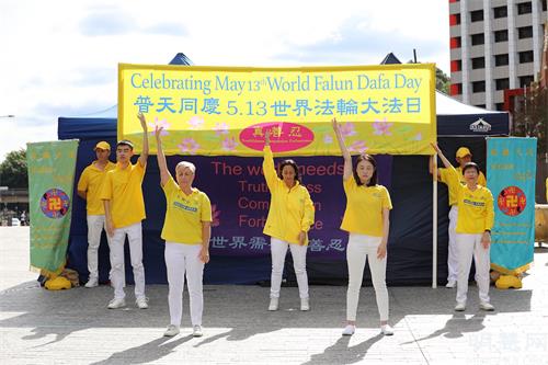 图1:二零二一年五月八日,昆士兰法轮功学员齐聚在市中心的乔治国王广场(King George Square)世界法轮大法日庆典上,双手合十,恭祝慈悲伟大的李洪志师父七十华诞!