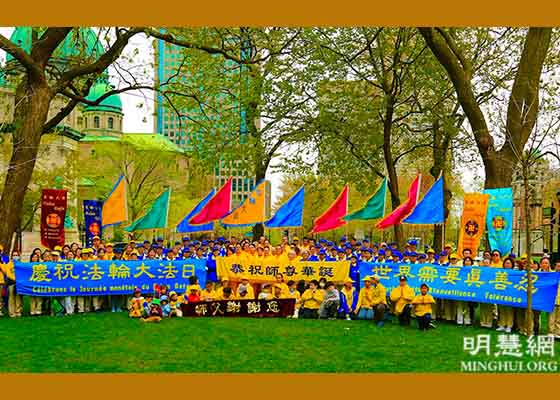 来自加拿大魁北克省的部份法轮功学员5月8日在蒙特利尔举行盛大游行活动,庆祝5·13世界法轮大法日,恭贺法轮大法洪传世界29周年。