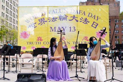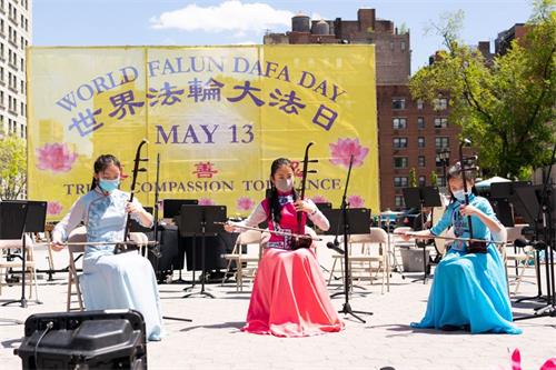 上午十点,祥和的炼功音乐响起,学员们开始炼功。蓝天白云下,灿烂的阳光中,缓慢圆的法轮功功法,非常的平和美好。之后,学员们表演了多个西洋管弦乐演奏,还有中国传统乐器二胡、琵琶、葫芦丝等的独奏和合奏,男女生独唱等,美妙的乐声在联合广场上空飘扬,表达着学员们对大法和师尊的感恩。