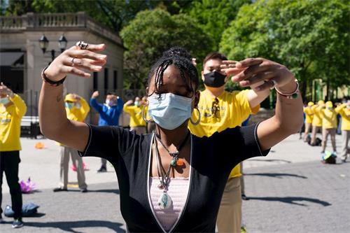 刚开始炼功一个月的米亚什(Miashe Barnes)不仅跟大家炼完了五套功法,而且从头到尾一直坐在那里静静地看节目。她表示是大法的高层次的道德标准吸引了她。她说:“这个活动让我受到鼓舞。”