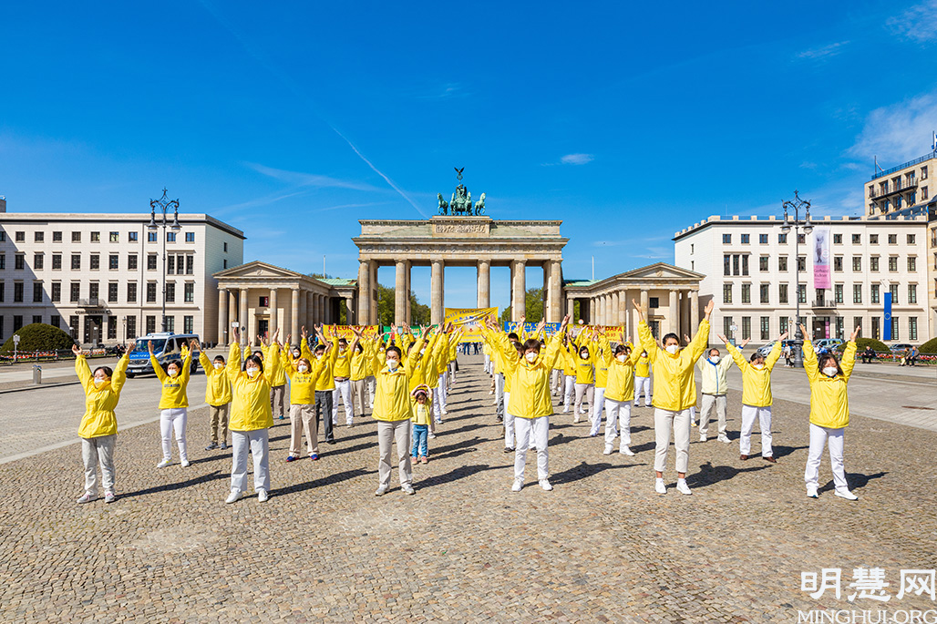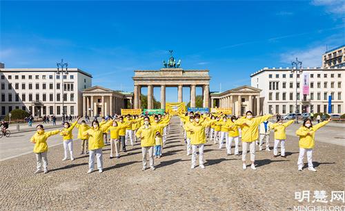 图2~3:二零二一年五月八日,法轮功学员在柏林勃兰登堡门前炼功,恭祝师尊七十岁华诞。