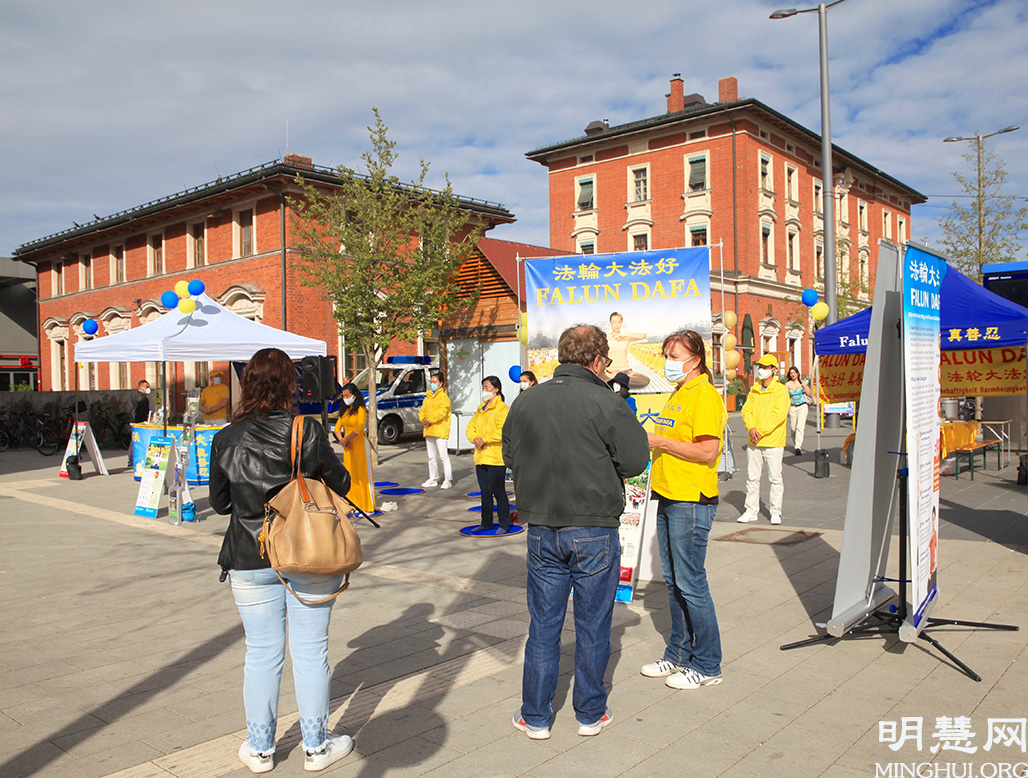 图4:二零二一年五月八日,法轮功学员在慕尼黑帕兴(Pasing)炼功,传播法轮功的真相,以庆祝世界法轮大法日。同时恭祝师尊七十华诞。