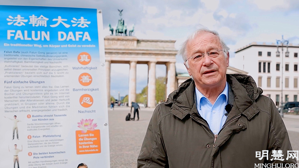 德国国会议员帕策尔特(Martin Patzelt)在勃兰登堡门前向法轮功学员祝贺节日。他说:“正值五月十三日世界法轮大法日之际,我向中国和全世界的法轮功学员表达衷心问候。我很高兴,中国人从他们古老的传统中找到了这种修炼方法,使身心得到放松。我们欧洲人也从这种东方传统中受益。”