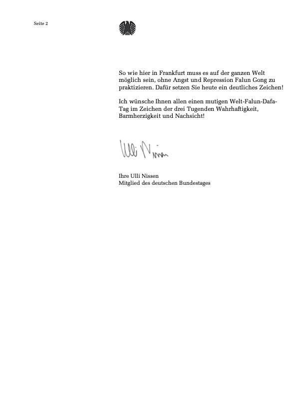 乌莉·尼森是来自法兰克福的德国联邦议会议员,她在贺信中称赞真、善、忍是法轮功学员所尊崇的“可敬的和平的美德”,谴责中共对法轮功学员的迫害,并表示支持欧洲议会于二零一三年做出的决定,即谴责中共活摘法轮功学员及良心犯器官的罪行。