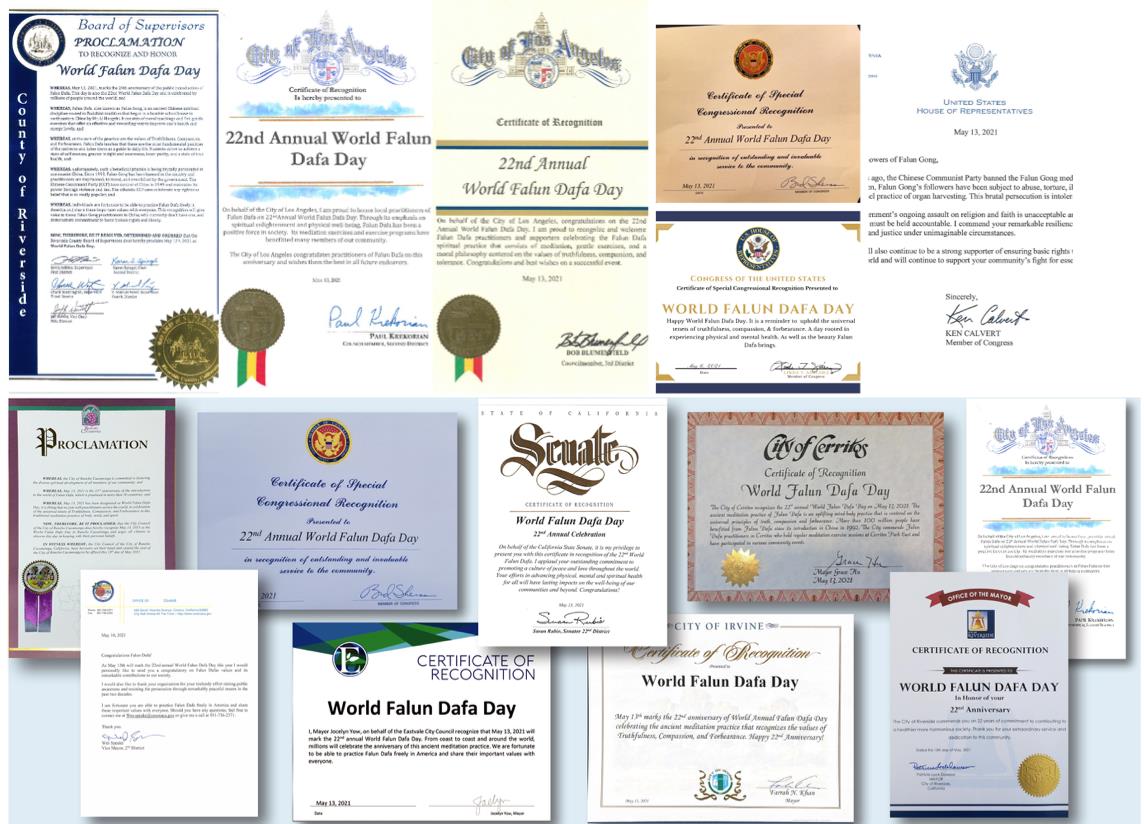 ![]() 图1:在“‘五一三’世界法轮大法日”来临之际,来自南加州大洛杉矶地区的二十多位加州国会议员、州议员及县、市府官员纷发褒扬贺信,颂扬法轮大法“真、善、忍”的理念,并感谢法轮功学员多年来为社区做出的卓越贡献。 |