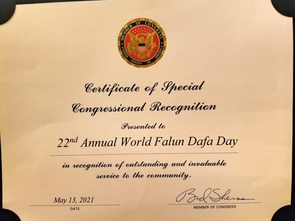 ![]() 图2:加州国会议员布拉德·谢尔曼(Brad Sherman)褒奖第二十二届世界法轮大法日。 |